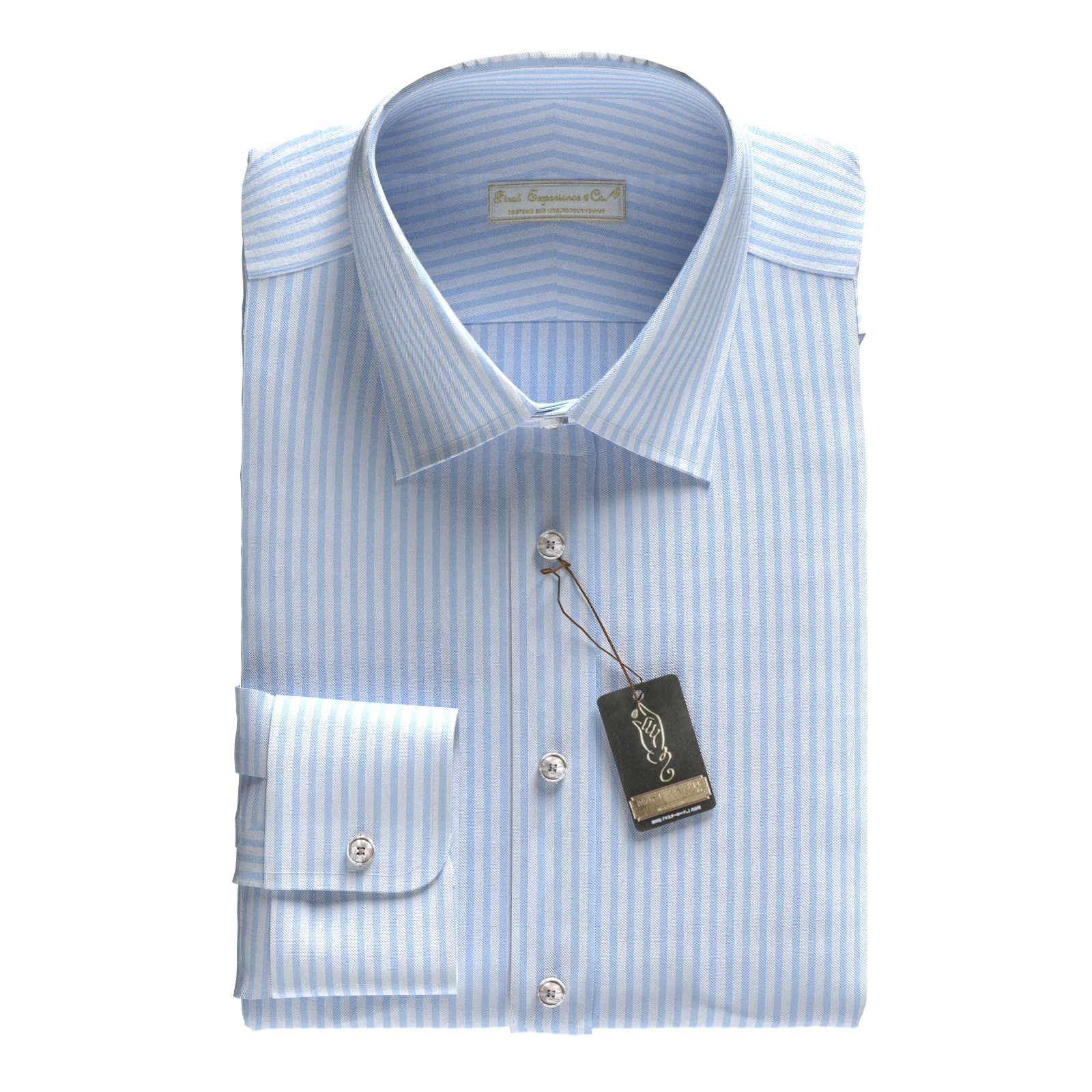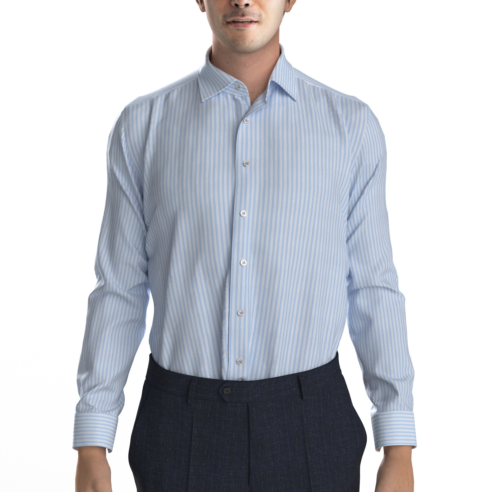 光沢感と滑らかな風合いが着る人も見る人も魅了するサックスのボールドストライプ生地です。
