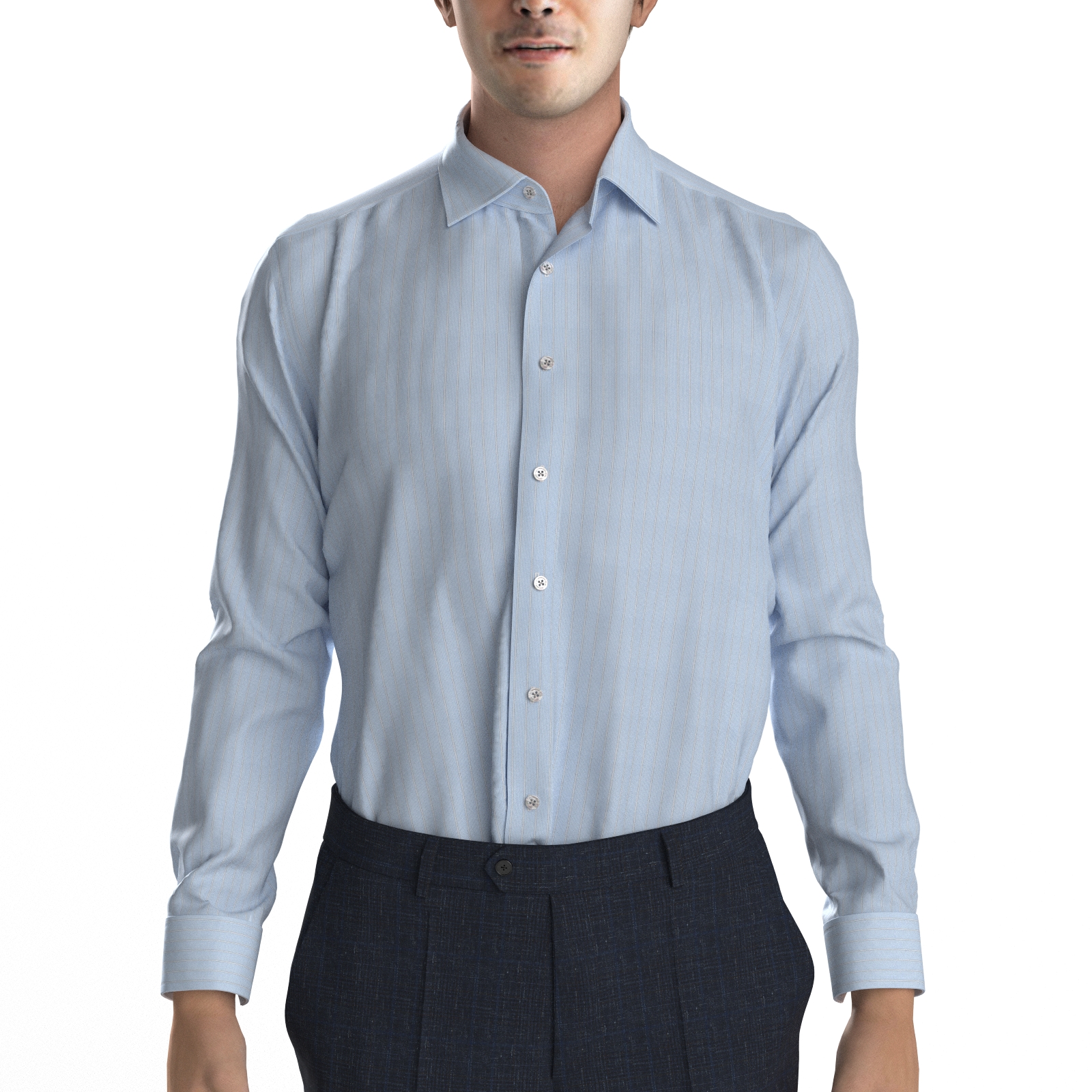 光沢感と滑らかな風合いが着る人も見る人も魅了するサックスの細かなストライプにネイビーとドビーのストライプが入った生地です。