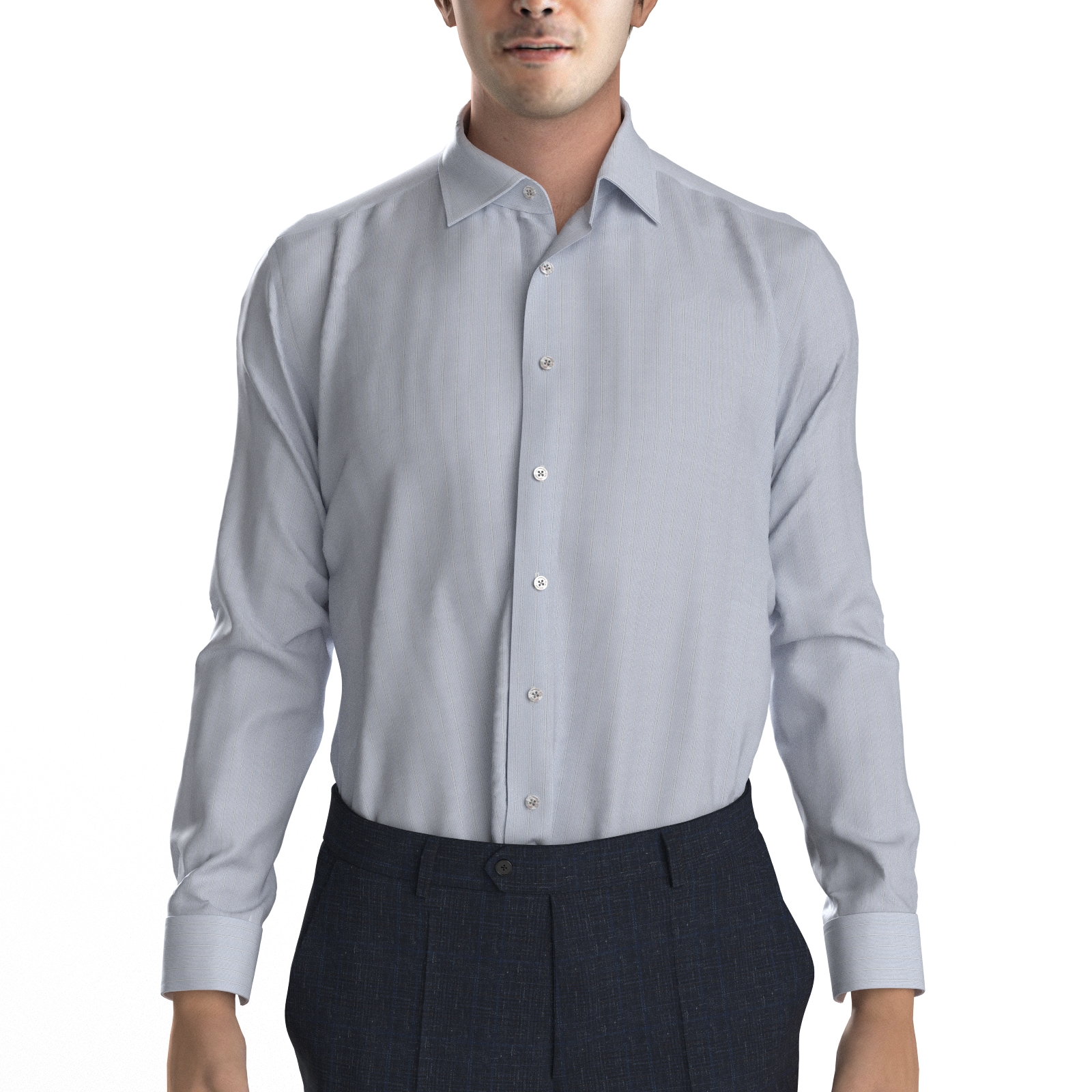光沢感と滑らかな風合いが着る人も見る人も魅了するグレーの細かなストライプにチャコールとドビーのストライプが入った生地です。