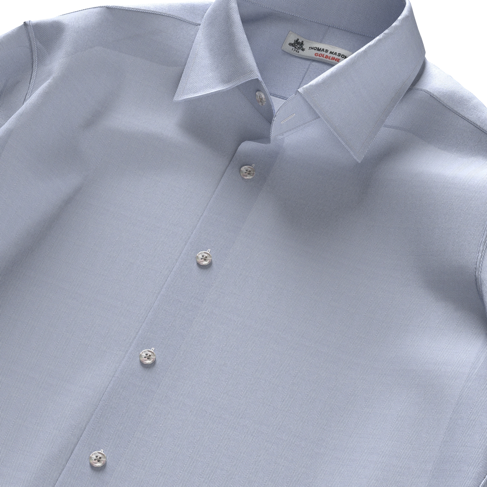 トーマス・メイソンのすべるように滑らかなGold Line140双糸の少し細めのサックス・ヘリンボーン織生地です。光沢感と陰影の美しさが特徴のヘリンボーンですが、この上質感は着ていれば必ず褒められると思るほどの仕上がりです。