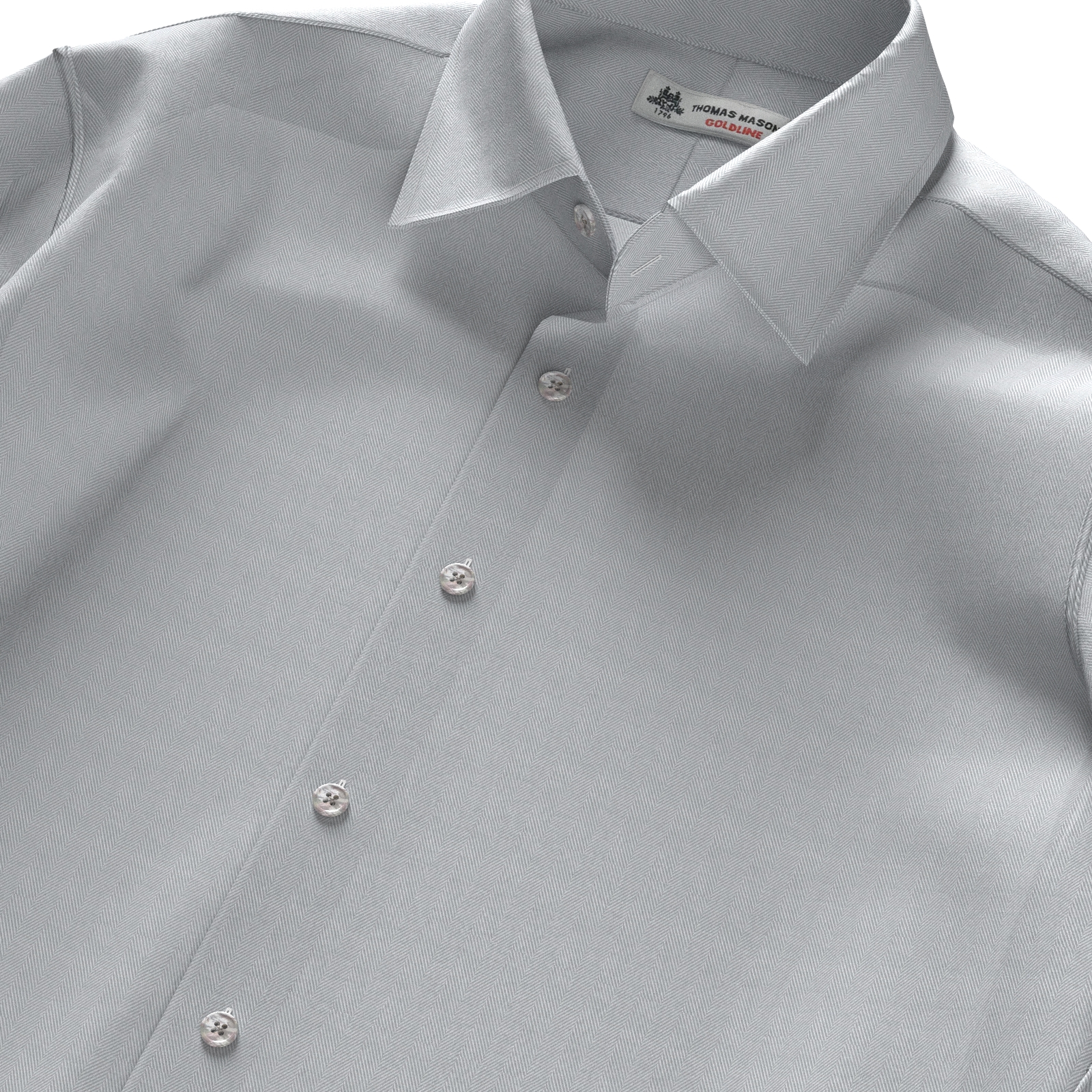トーマス・メイソンのすべるように滑らかなGold Line140双糸の少し細めのライトグレー・ヘリンボーン織生地です。光沢感と陰影の美しさが特徴のヘリンボーンですが、この上質感は着ていれば必ず褒められると思るほどの仕上がりです。