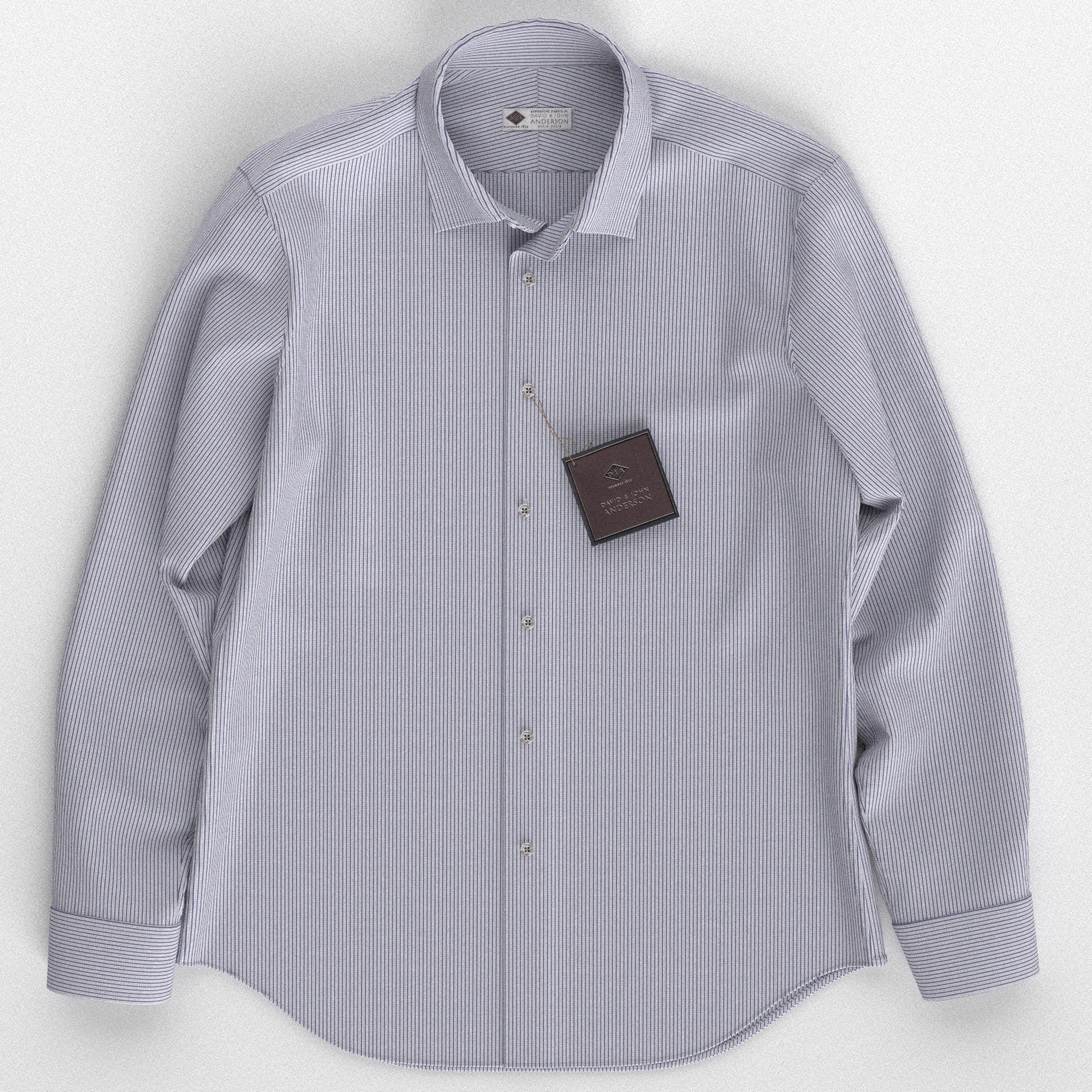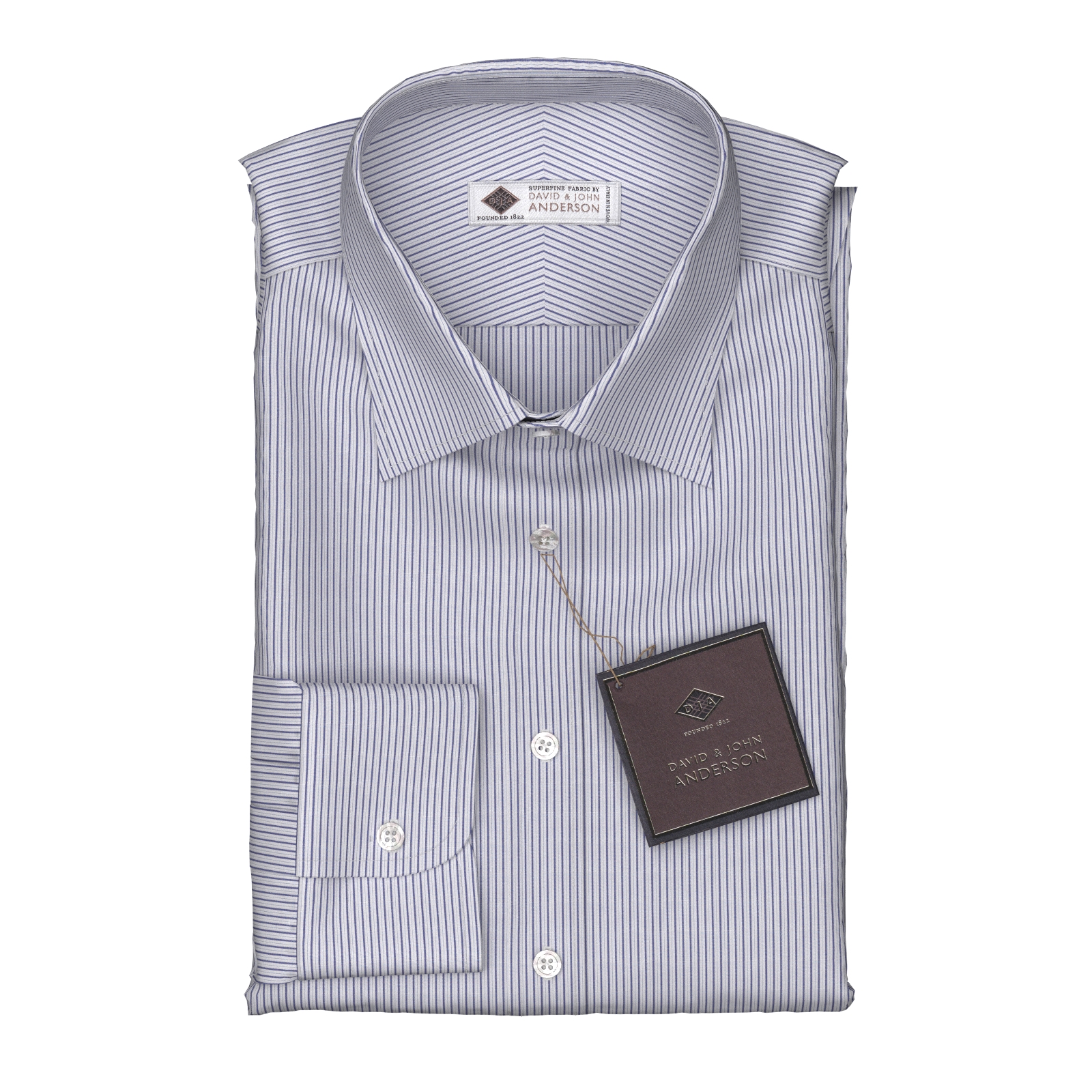 世界で一番細いとも言われる綿糸を使用し、シャツ生地の最上級に位置するDavid John Andersonのシルクのような200番手のネイビー オルタネートストライプのシャツ生地です。