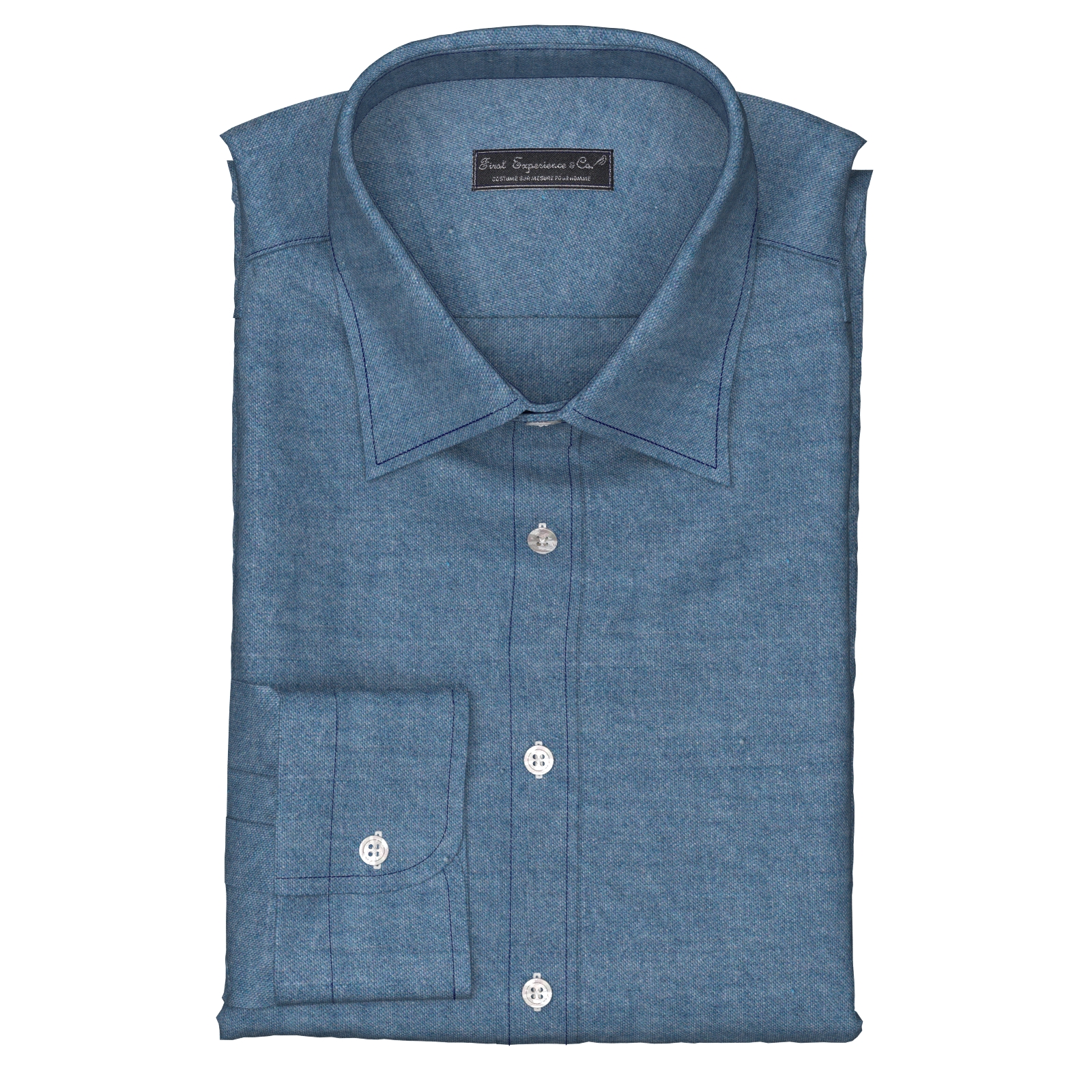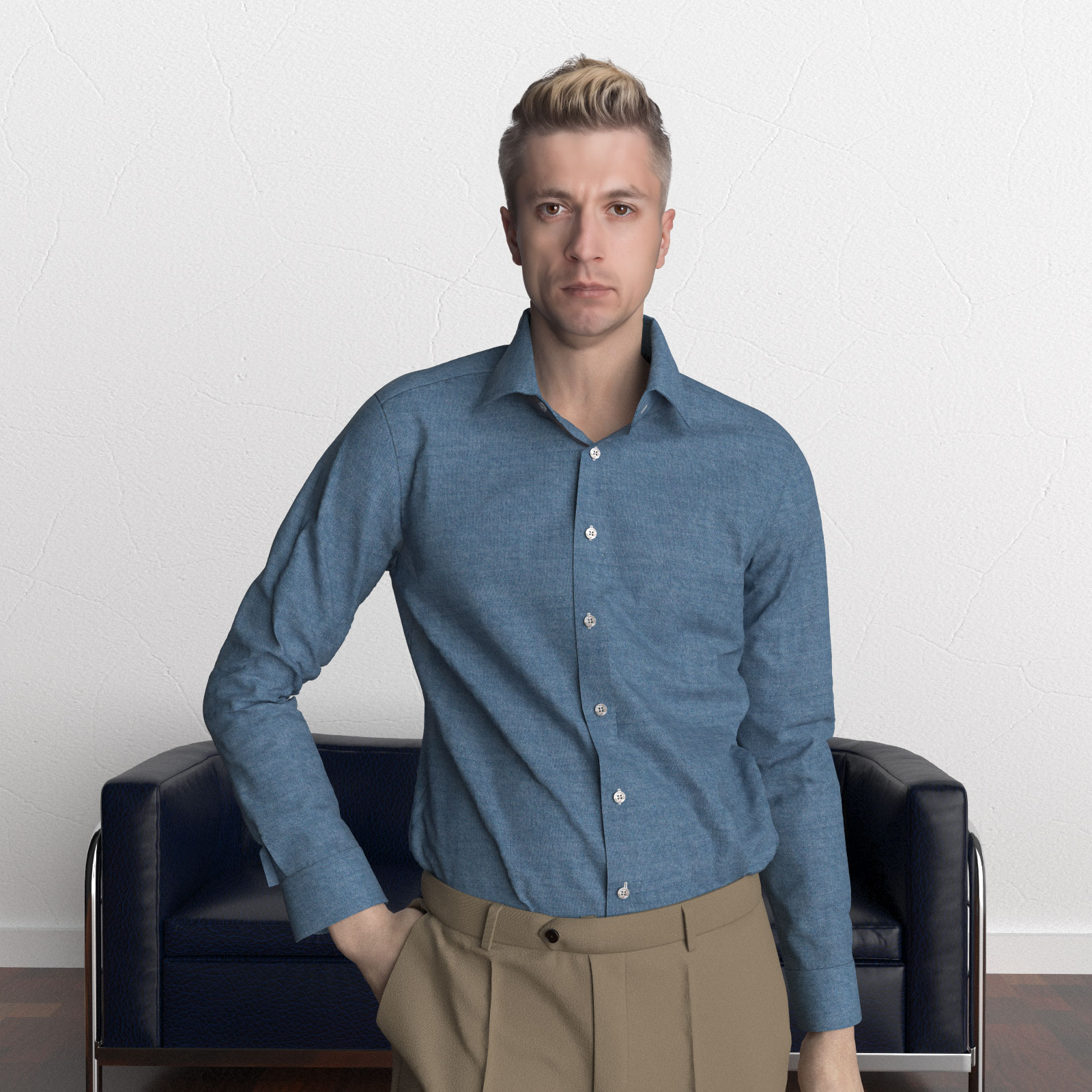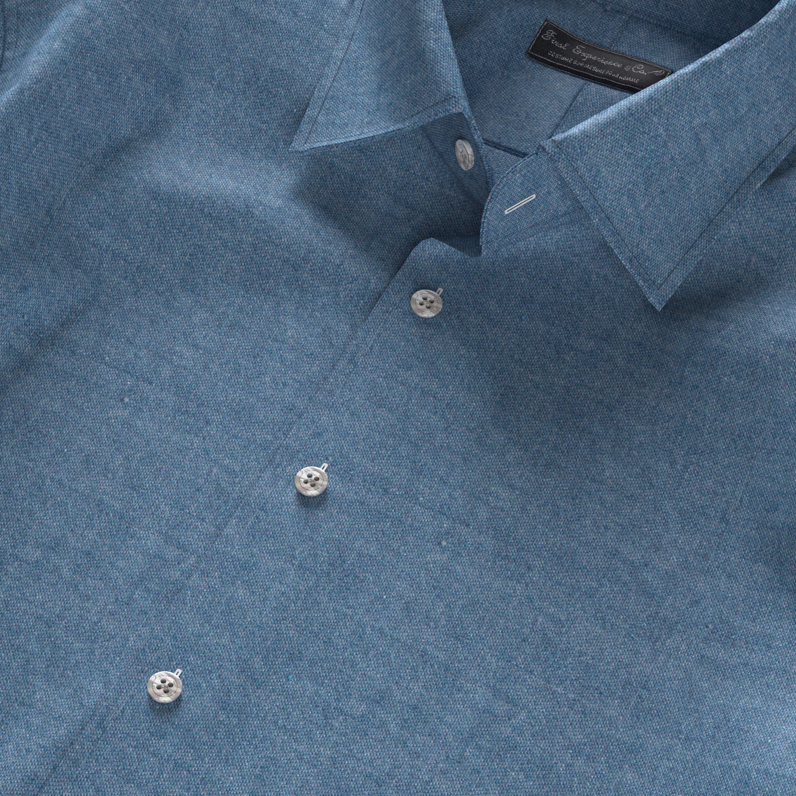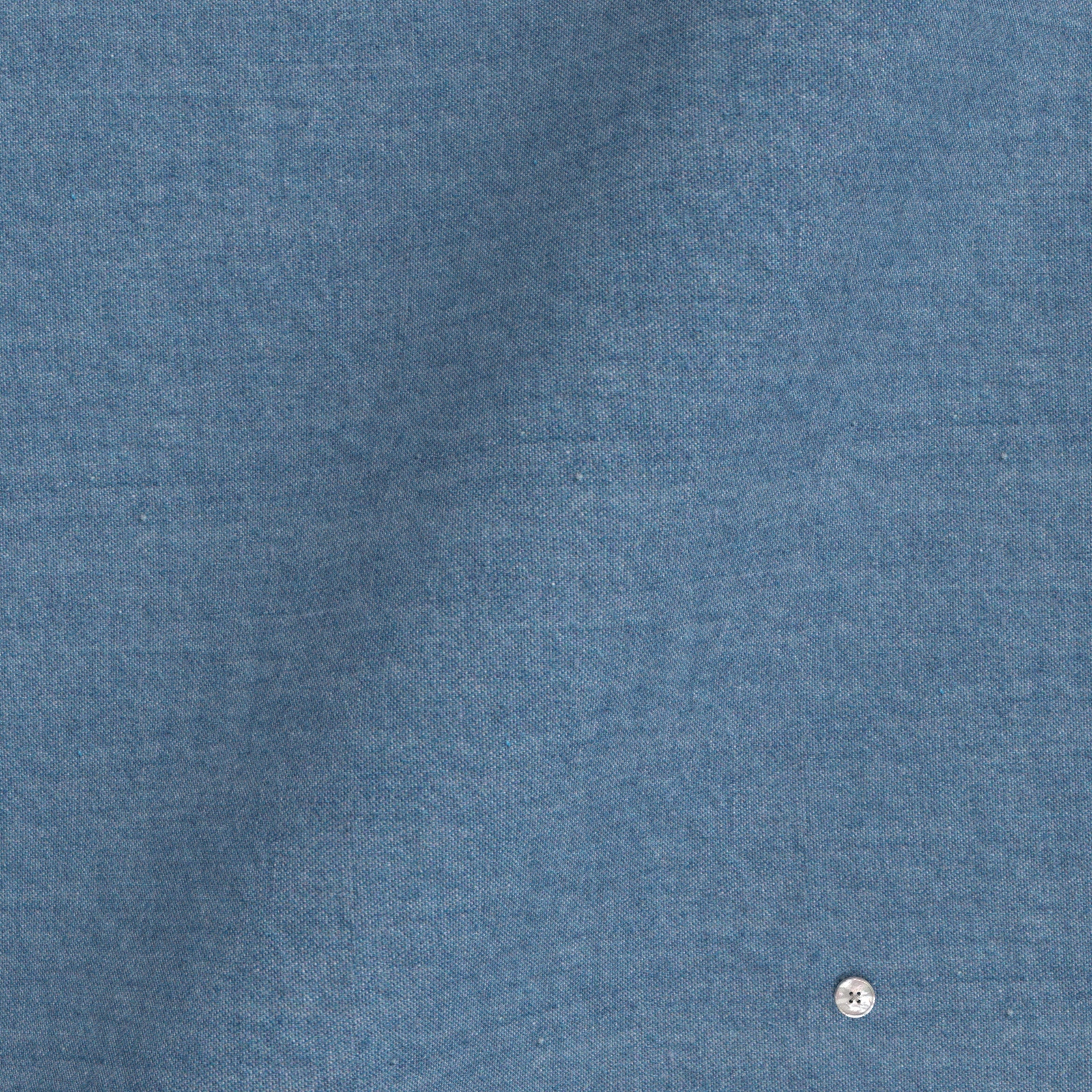 シャツとしてはしっかりとしたハリ感と厚みのある4.5ozの綿×テンセルのインディゴデニム素材です。テンセル特有のドレープ感とほどよい艶感があるブリーチされた浅いネイビーの生地は、ドレスコードがややカジュアルでも良い職場であれば十分ご利用いただけます。