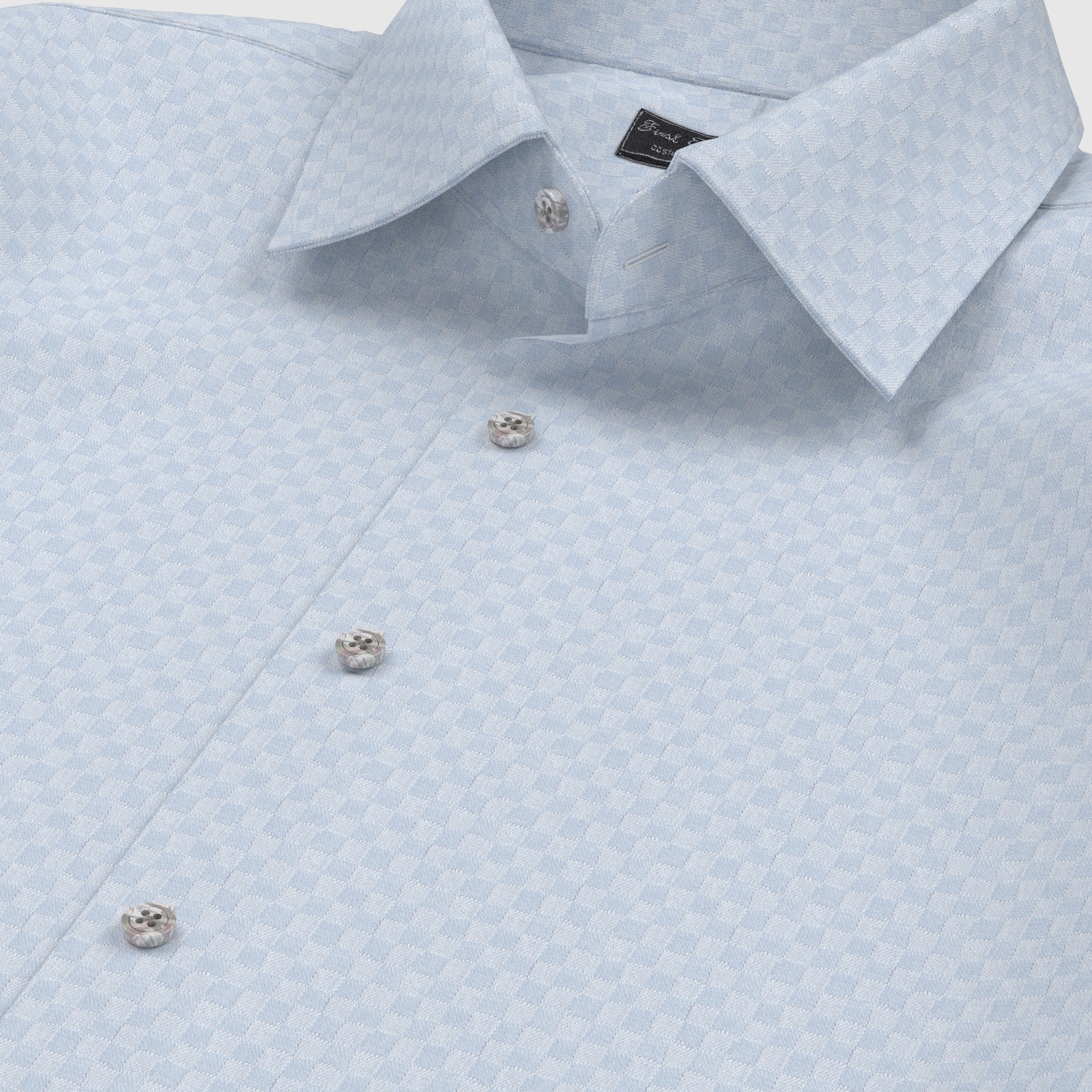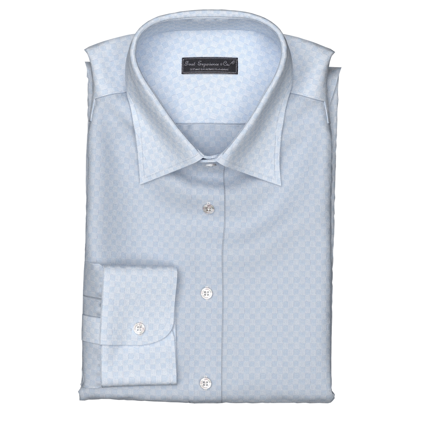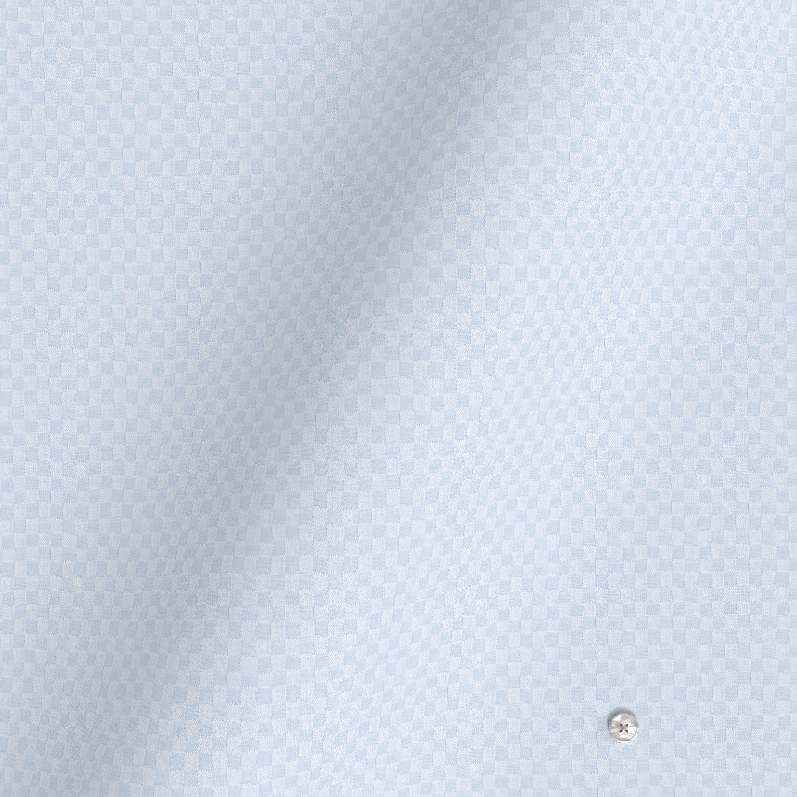 光沢感のあるサックスのチェッカードビー柄の綿100%イージーケア素材です。家庭洗濯+軽いアイロンがけですっきり・きっちりと着こなせる忙しいビジネスマンにぴったりの素材です。肌触りも綿100%の風合いを損なわない着心地です。