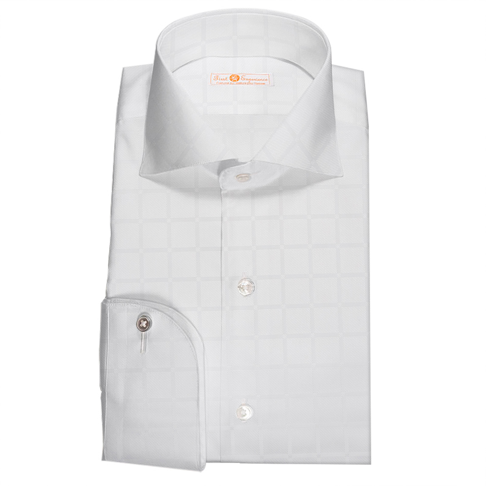 100双糸と上質で光沢感のあるホワイト・ドビー格子柄の綿100%イージーケア素材です。家庭洗濯+軽いアイロンがけですっきり・きっちりと着こなせる忙しいビジネスマンにぴったりの素材です。肌触りも綿100%の風合いを損なわない着心地です。