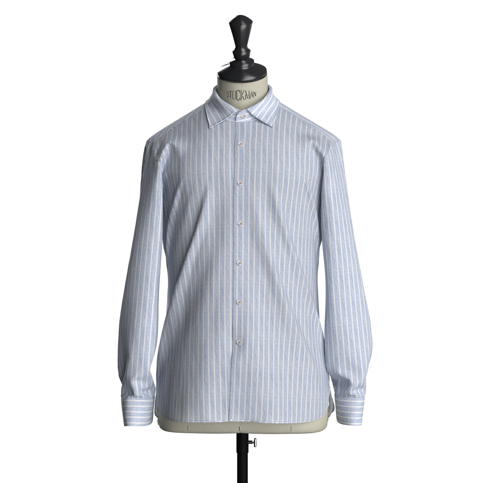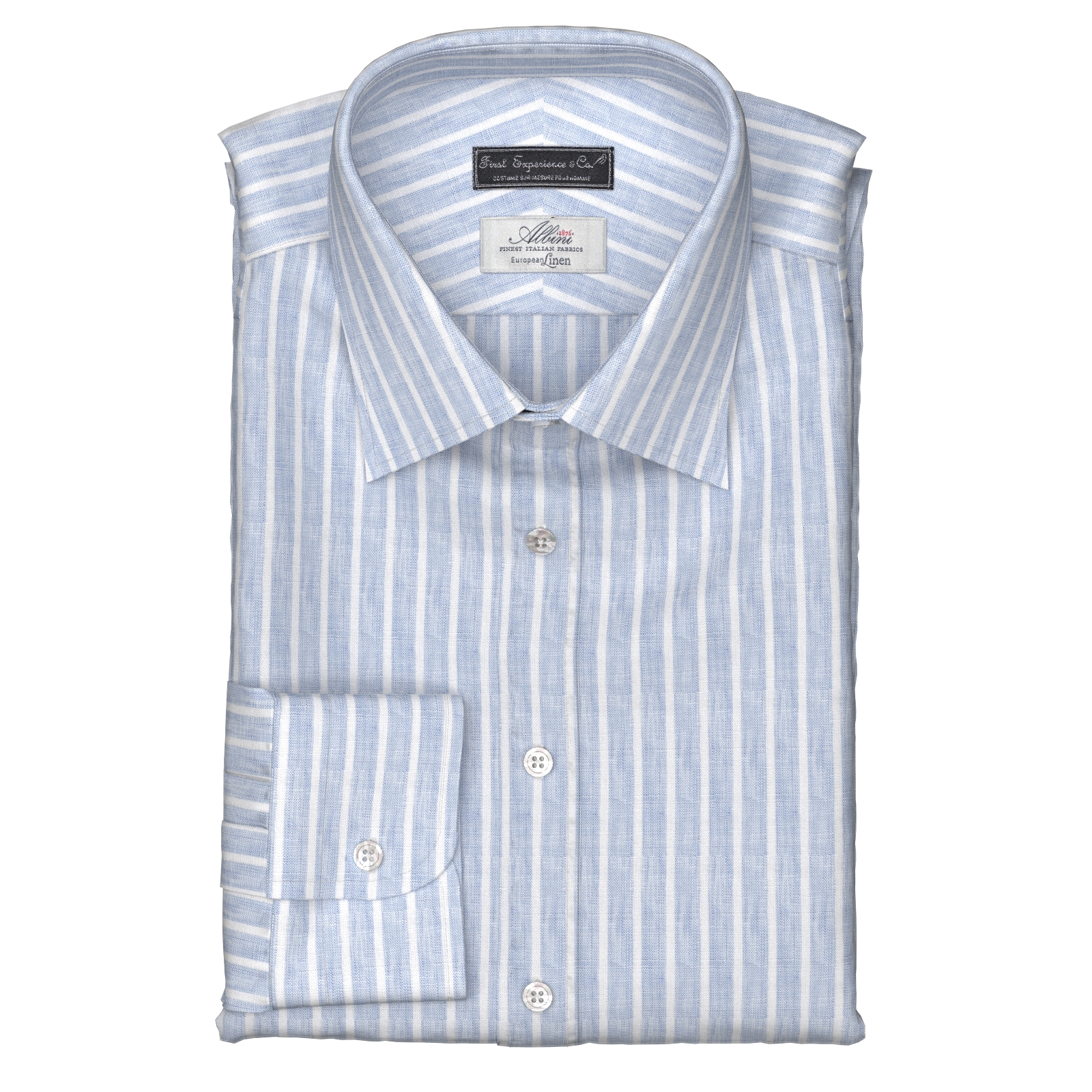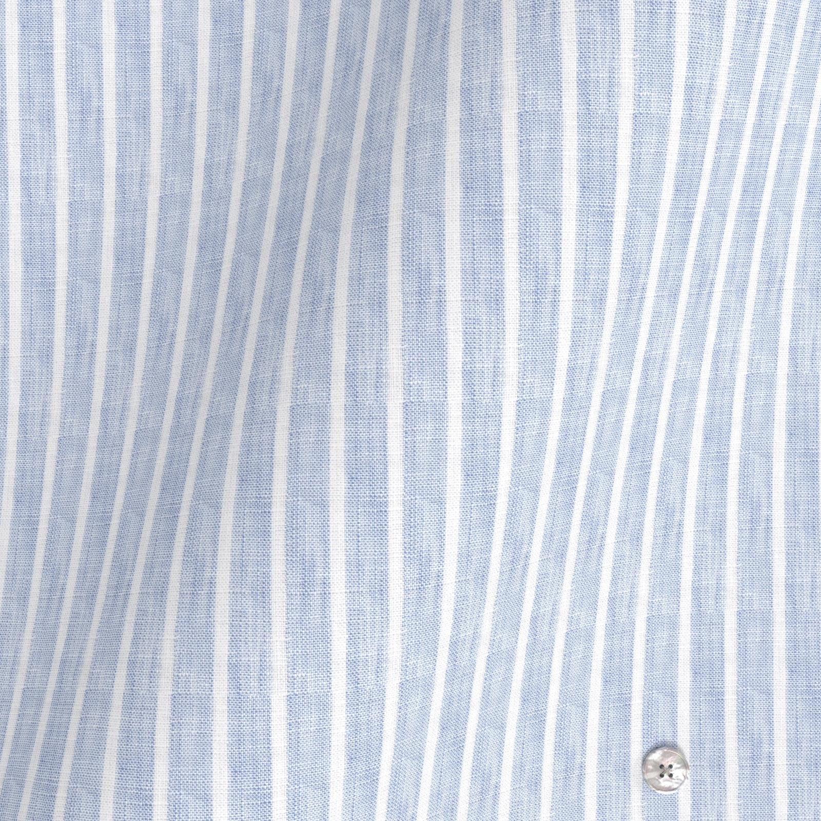 名門アルビニ社のリネン100%のサックス白抜きストライプ生地です。
