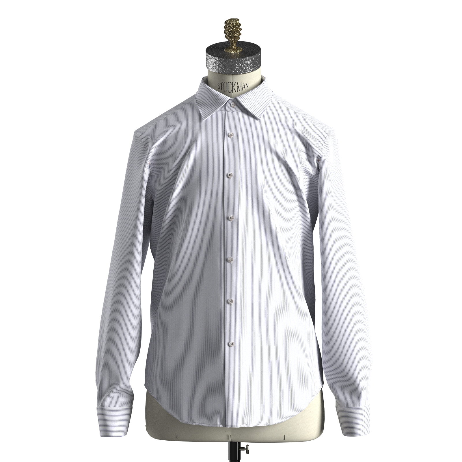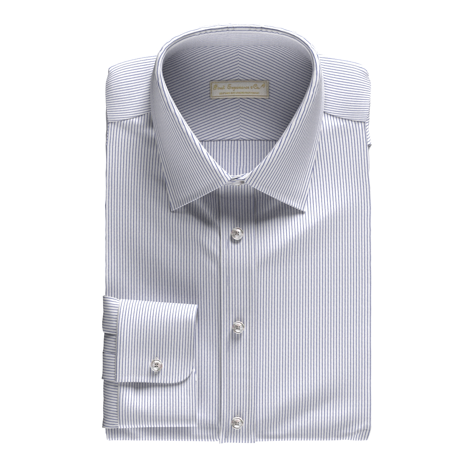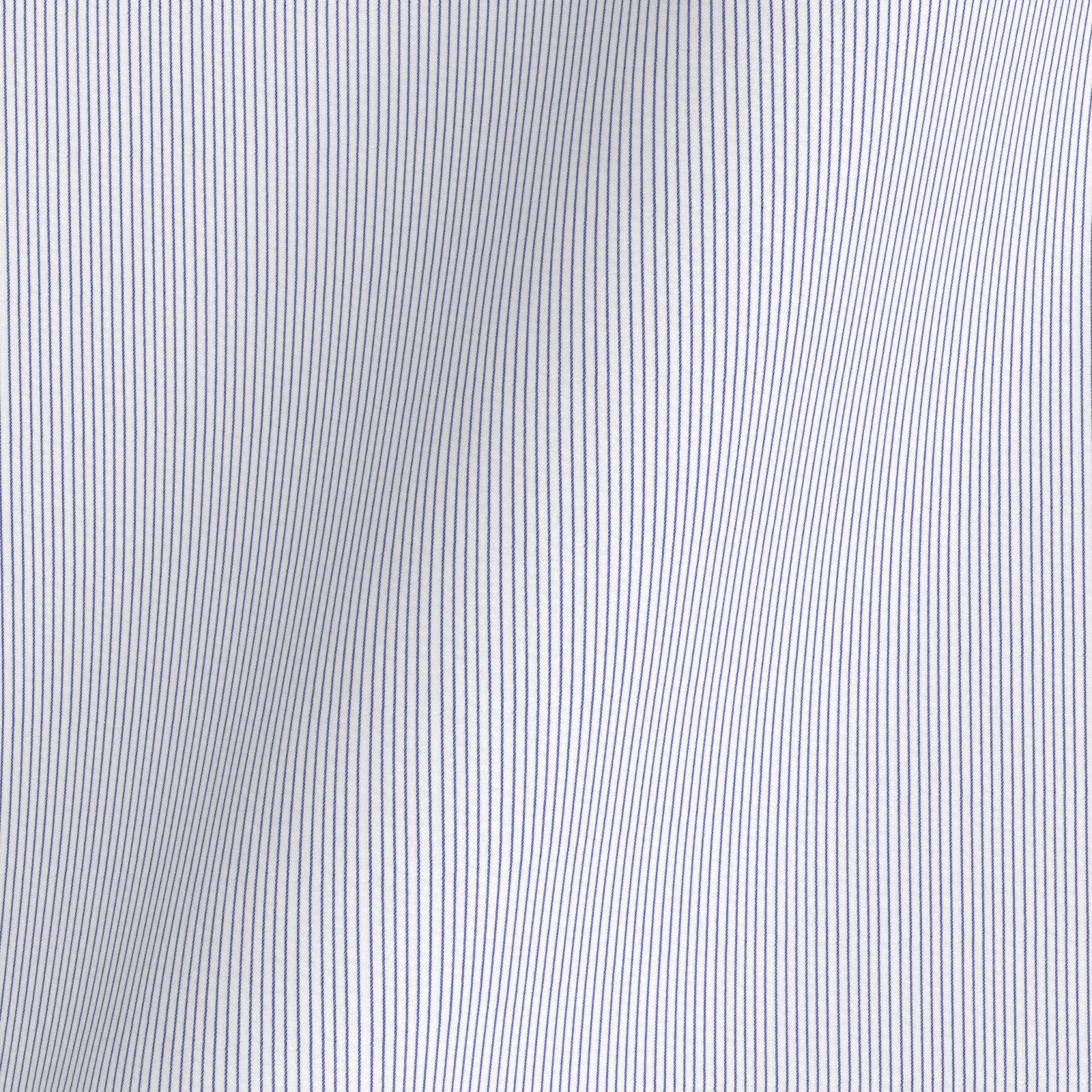 100双糸の上質なネイビーストライプの綿100%イージーケア素材です。家庭洗濯+軽いアイロンがけですっきり・きっちりと着こなせる忙しいビジネスマンにぴったりの素材です。肌触りも綿100%の風合いを損なわない着心地です。