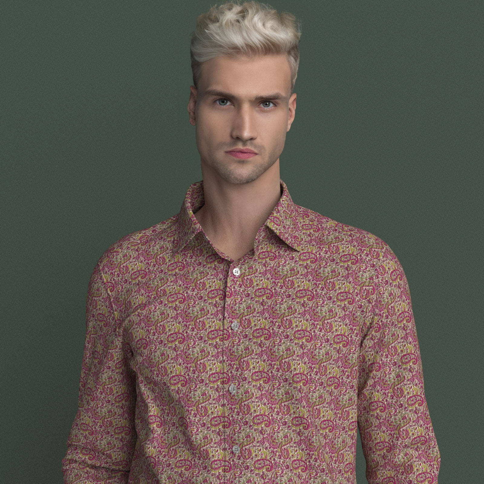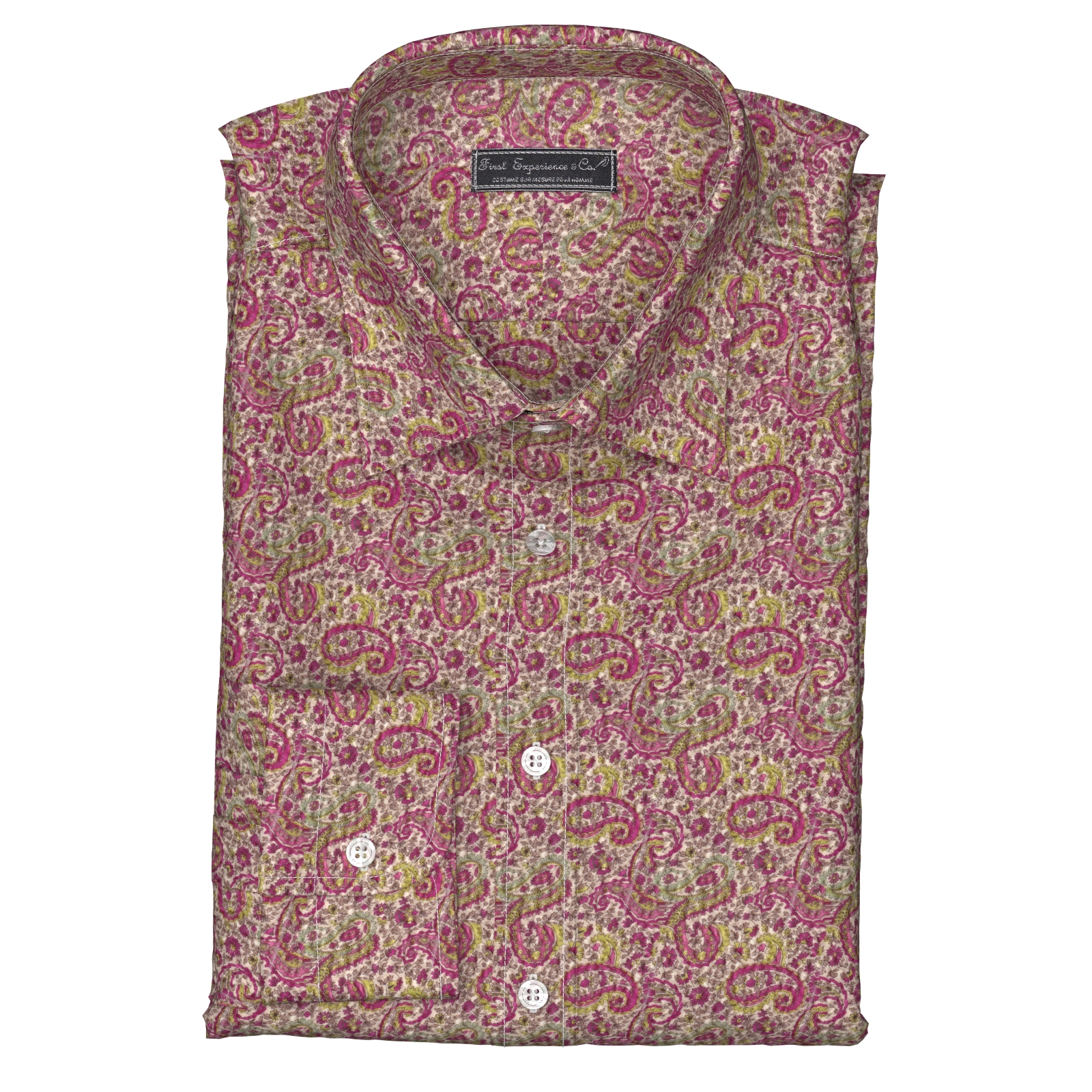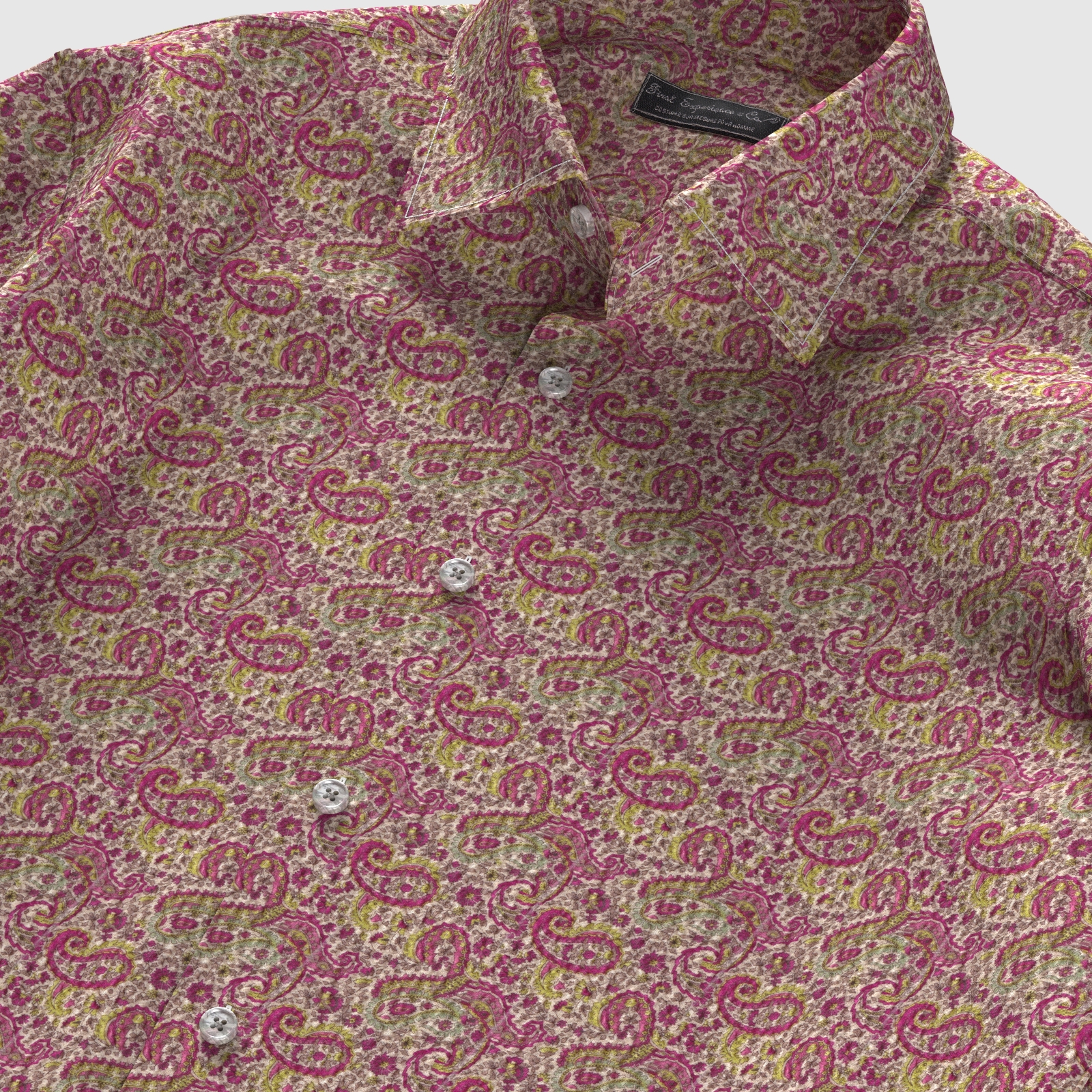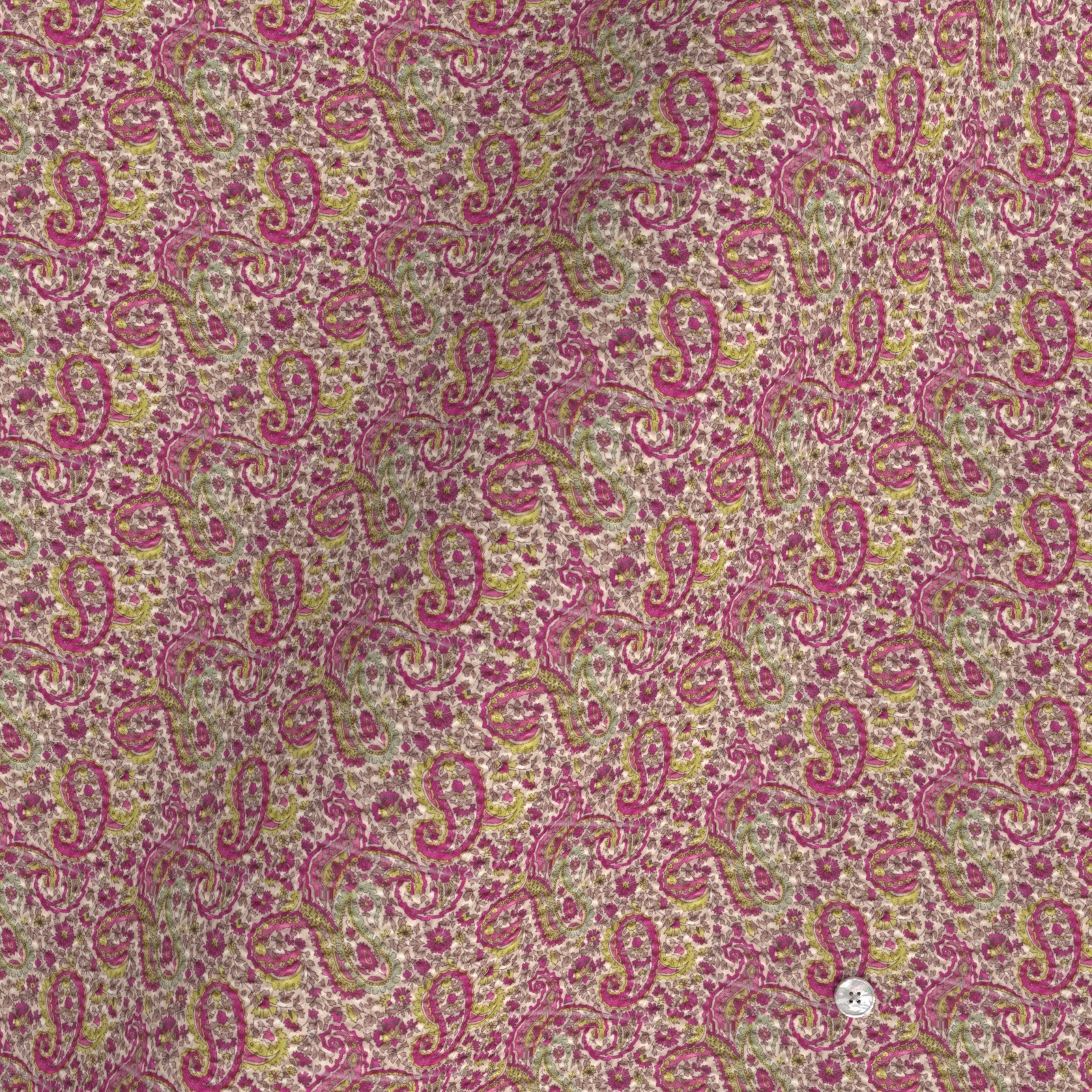 レッド、ピンク、グリーンなどが配されたマーカス・ペイズリー生地にシュリンク(絞りのようなマイクロウエーブ)加工がされたストレッチ性の高い生地です。