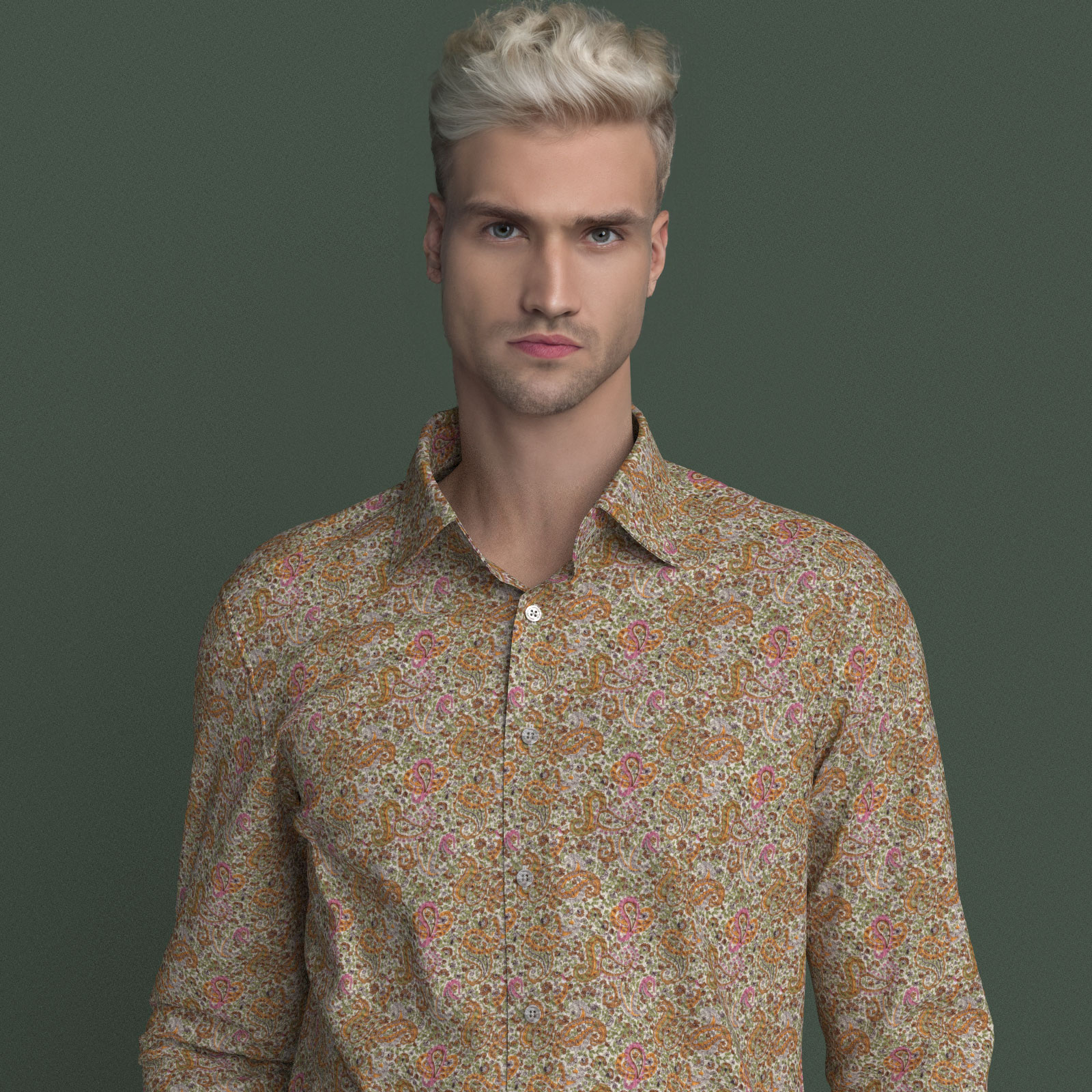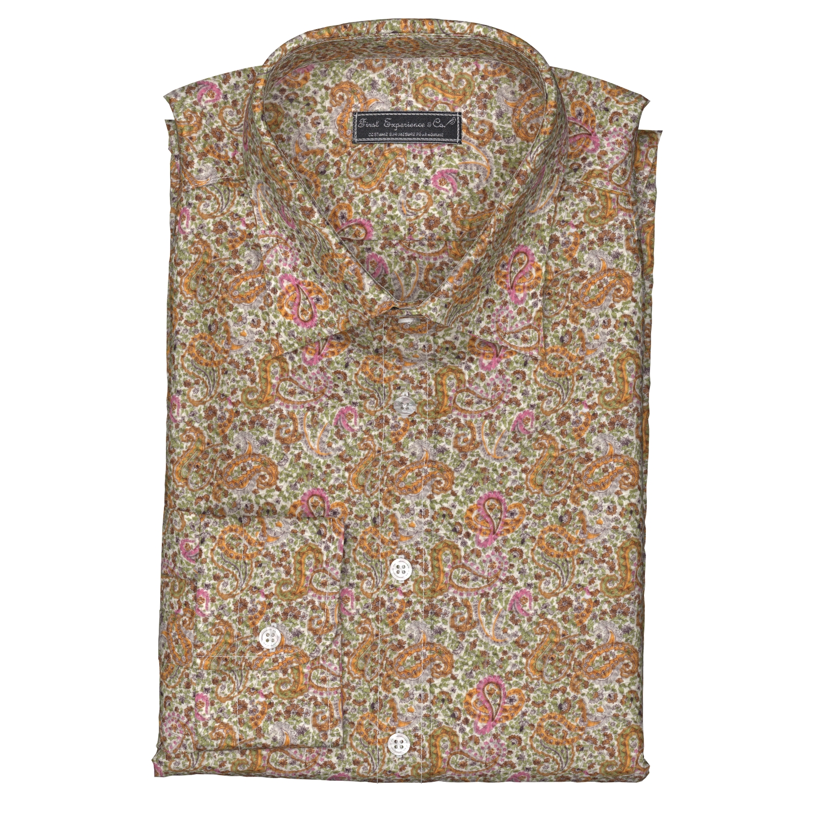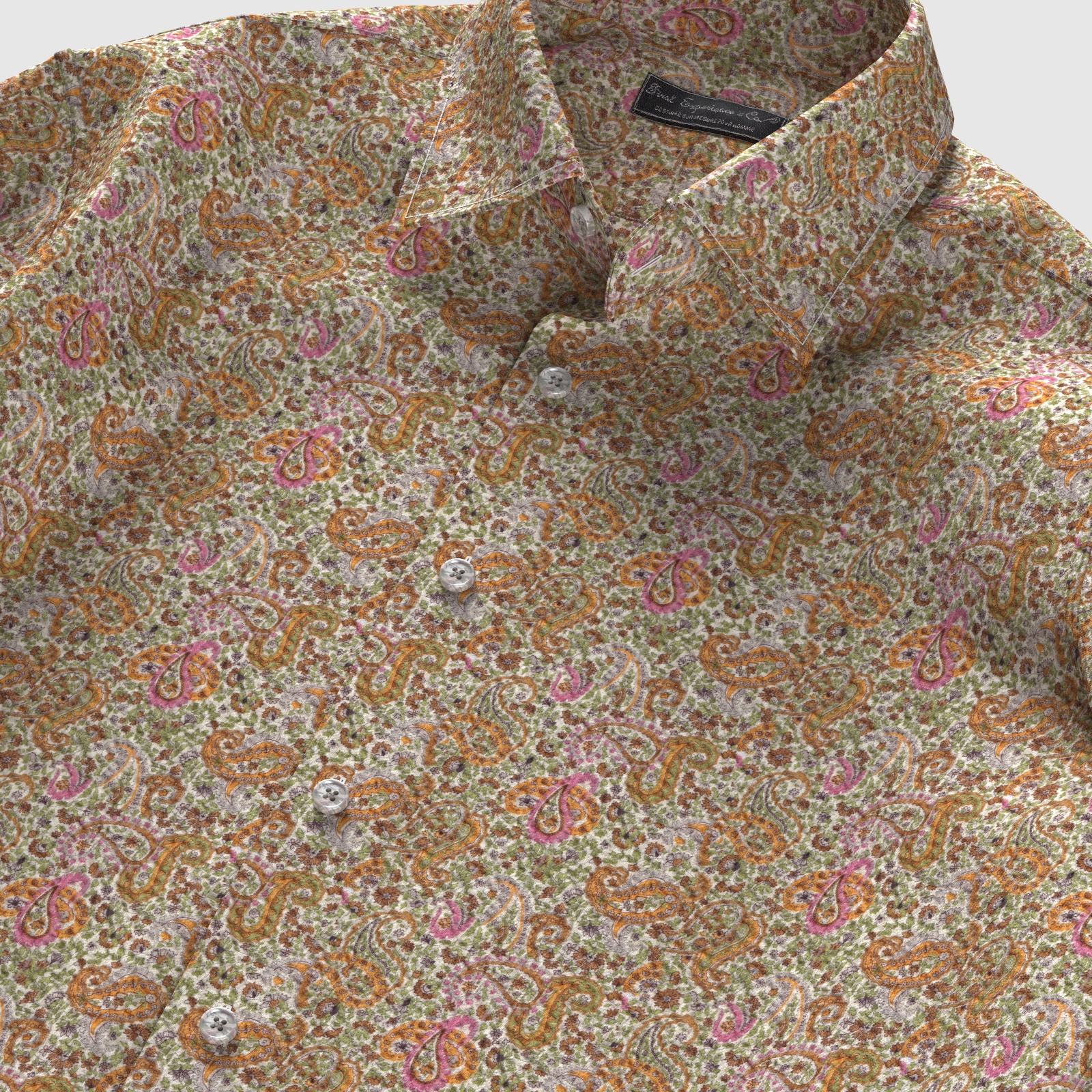 イエロー、ピンク、グリーンなどが配されたマーカス・ペイズリー生地にシュリンク(絞りのようなマイクロウエーブ)加工がされたストレッチ性の高い生地です。