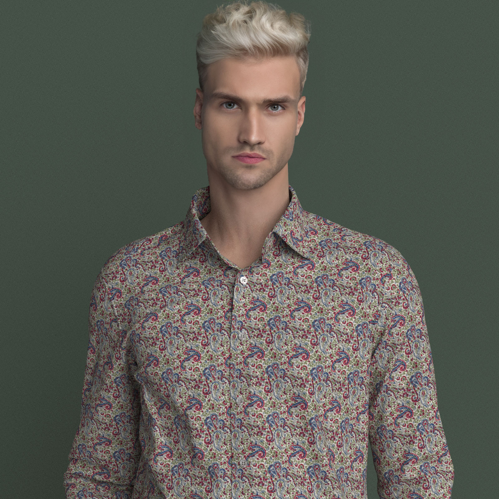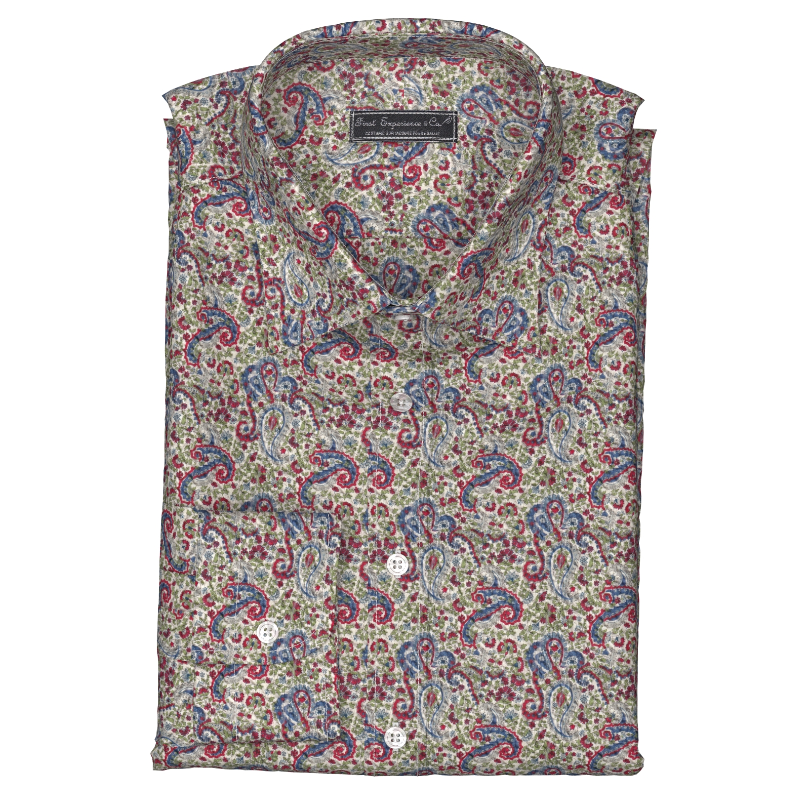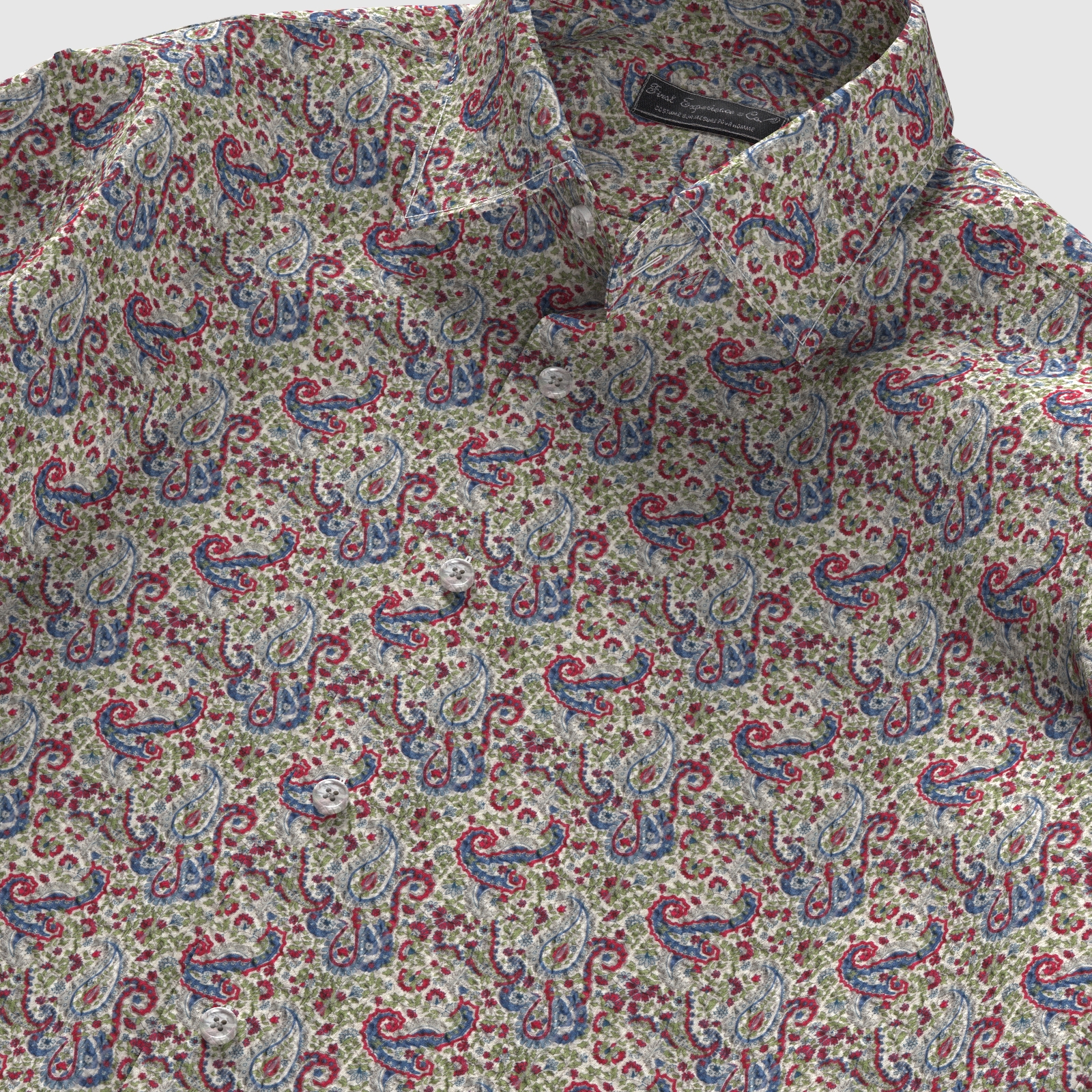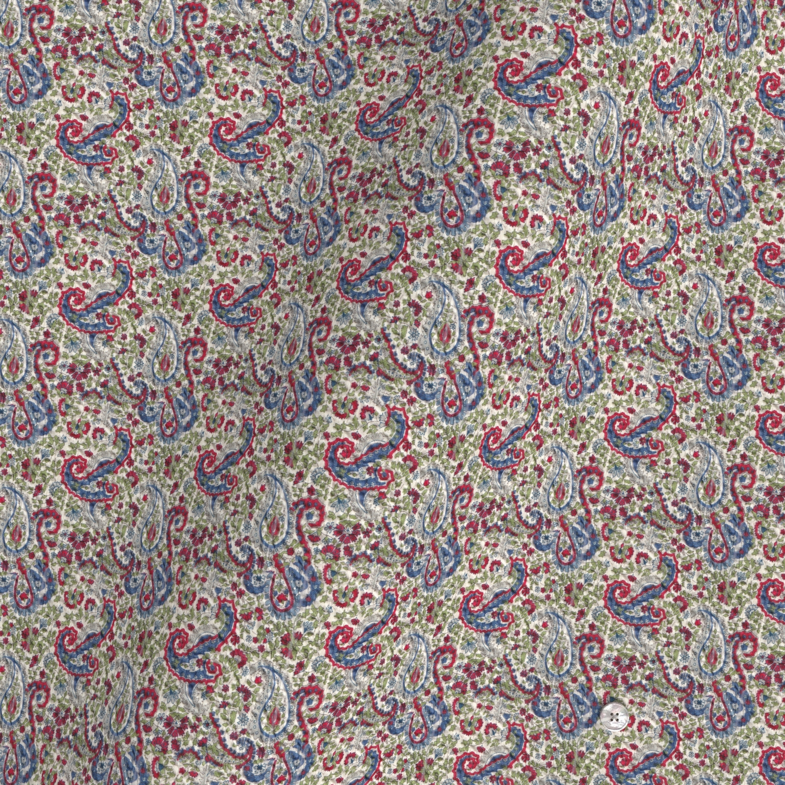 ブルー、レッド、グリーンなどが配されたマーカス・ペイズリー生地にシュリンク(絞りのようなマイクロウエーブ)加工がされたストレッチ性の高い生地です。