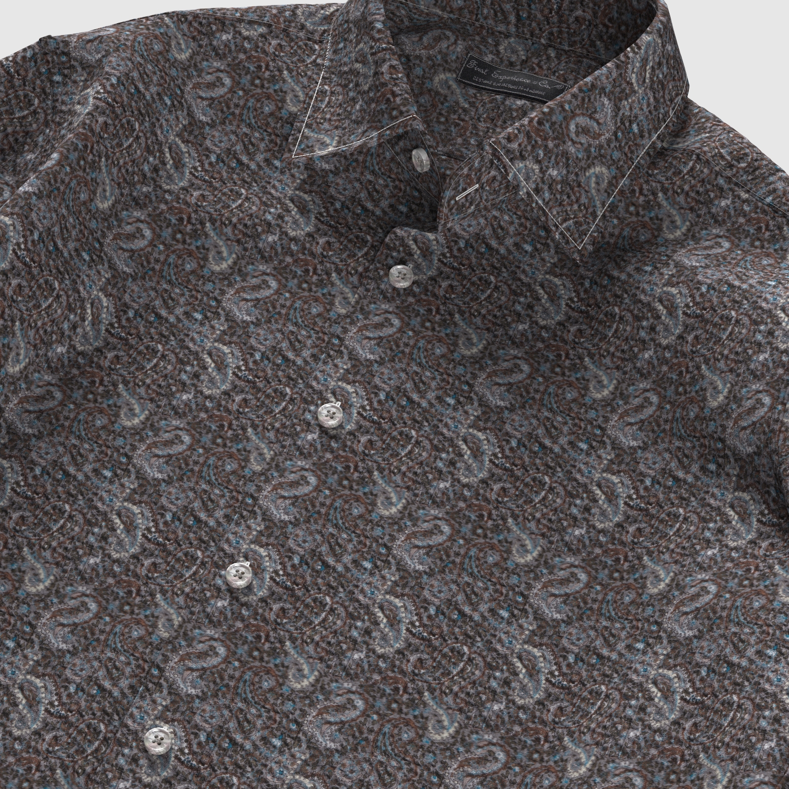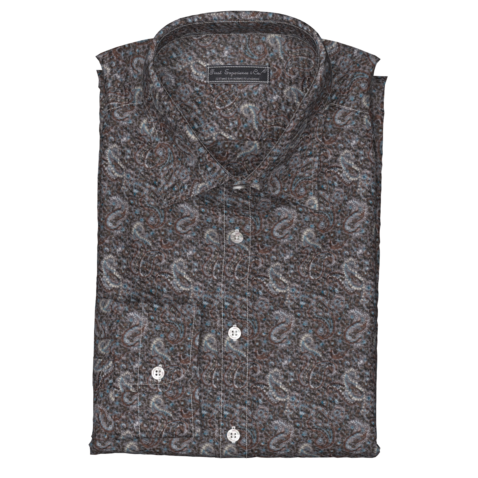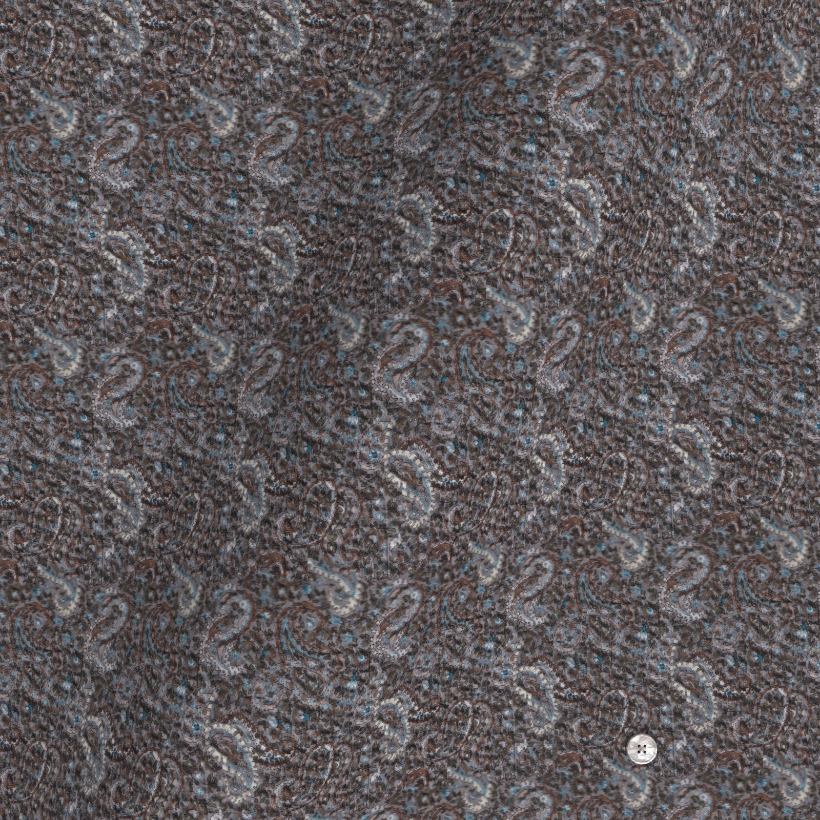 グレーベースにブルー、ブラウンなどが配されたマーカス・ペイズリー生地にシュリンク(絞りのようなマイクロウエーブ)加工がされたストレッチ性の高い生地です。