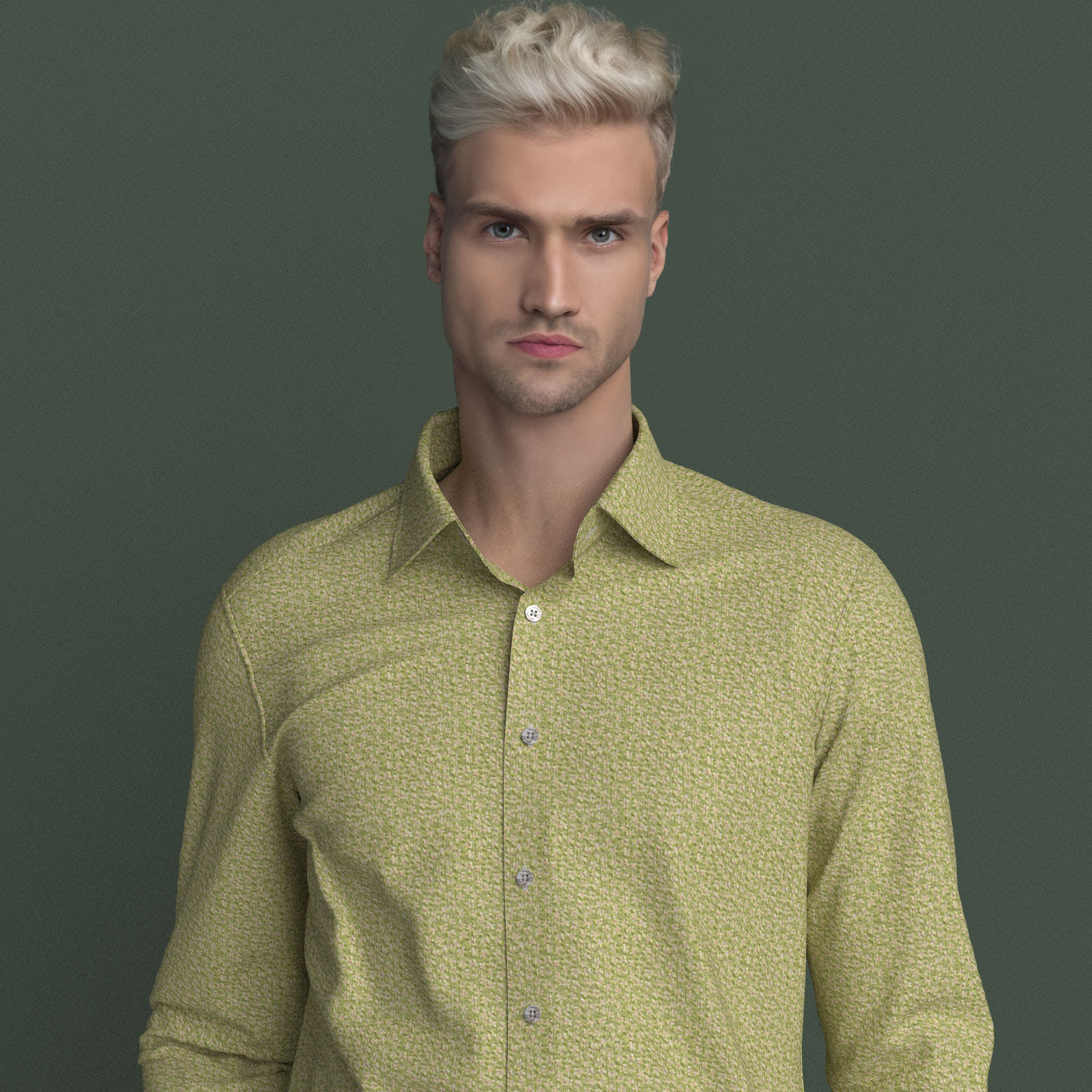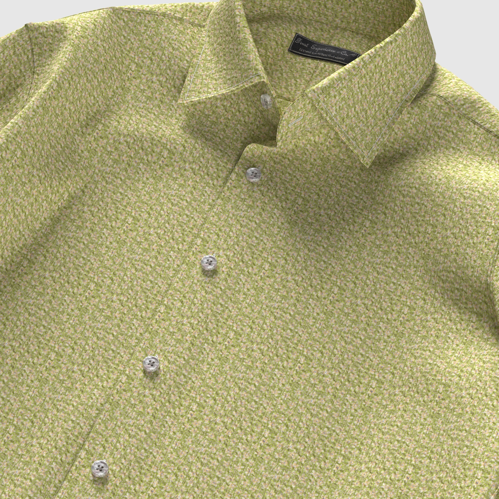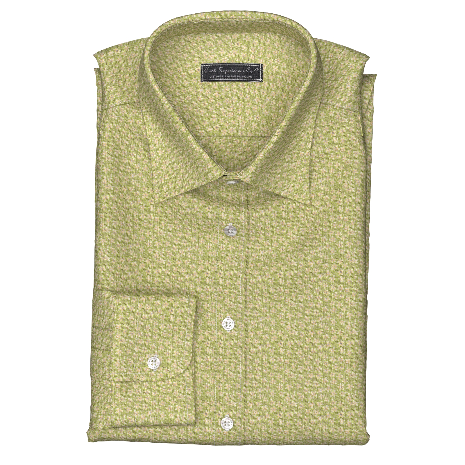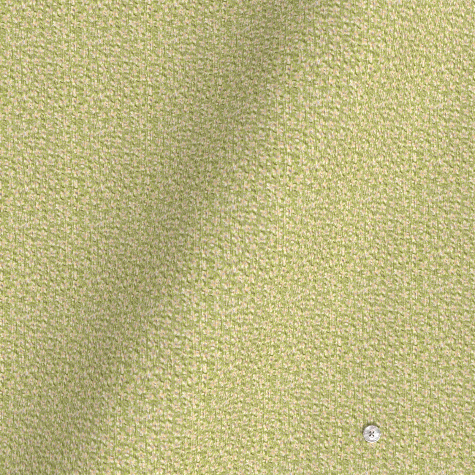 グリーンに淡いベージュの小花生地にシュリンク(絞りのようなマイクロウエーブ)加工がされたストレッチ性の高い生地です。
