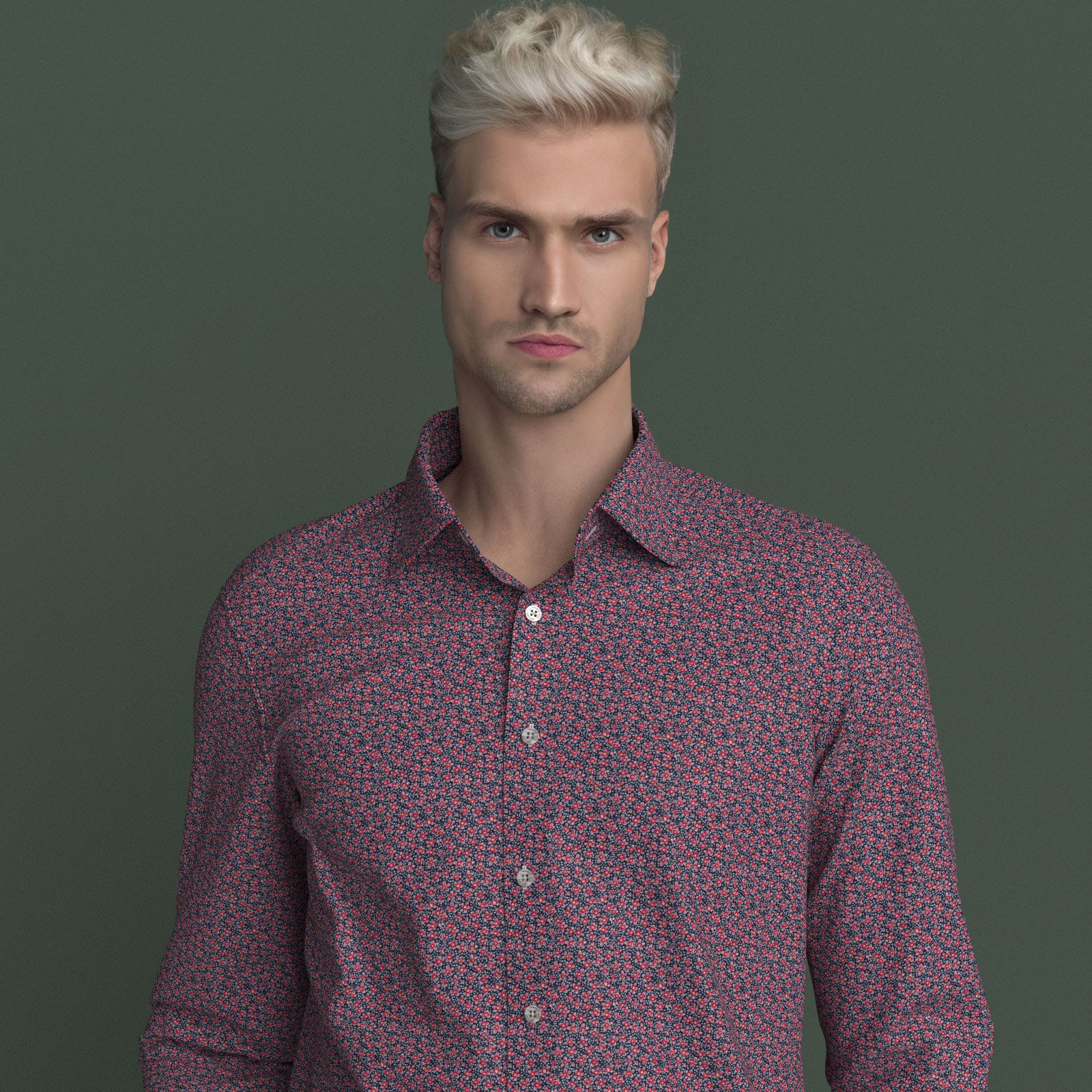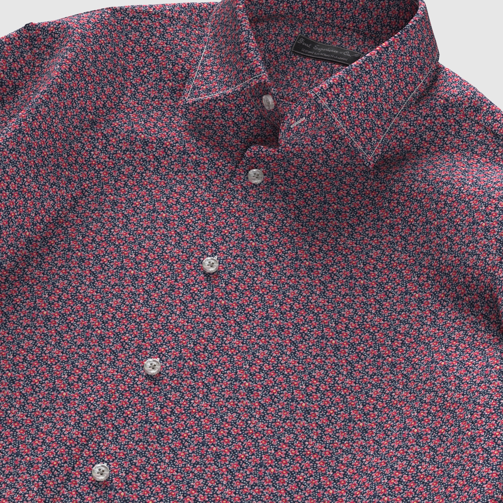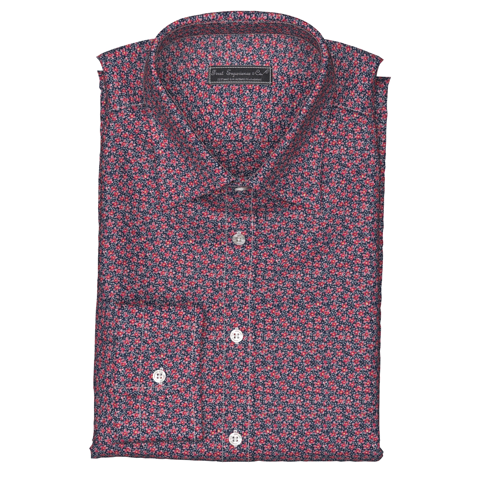 ネイビーにレッドなどの小花生地にシュリンク(絞りのようなマイクロウエーブ)加工がされたストレッチ性の高い生地です。