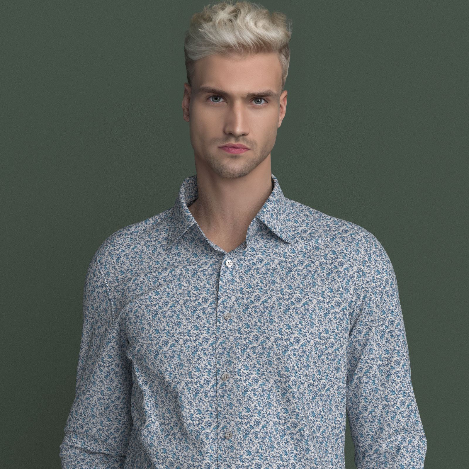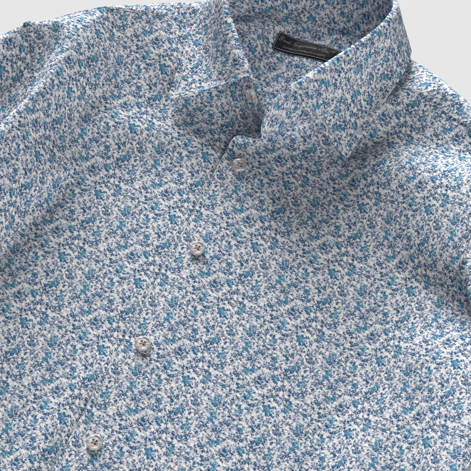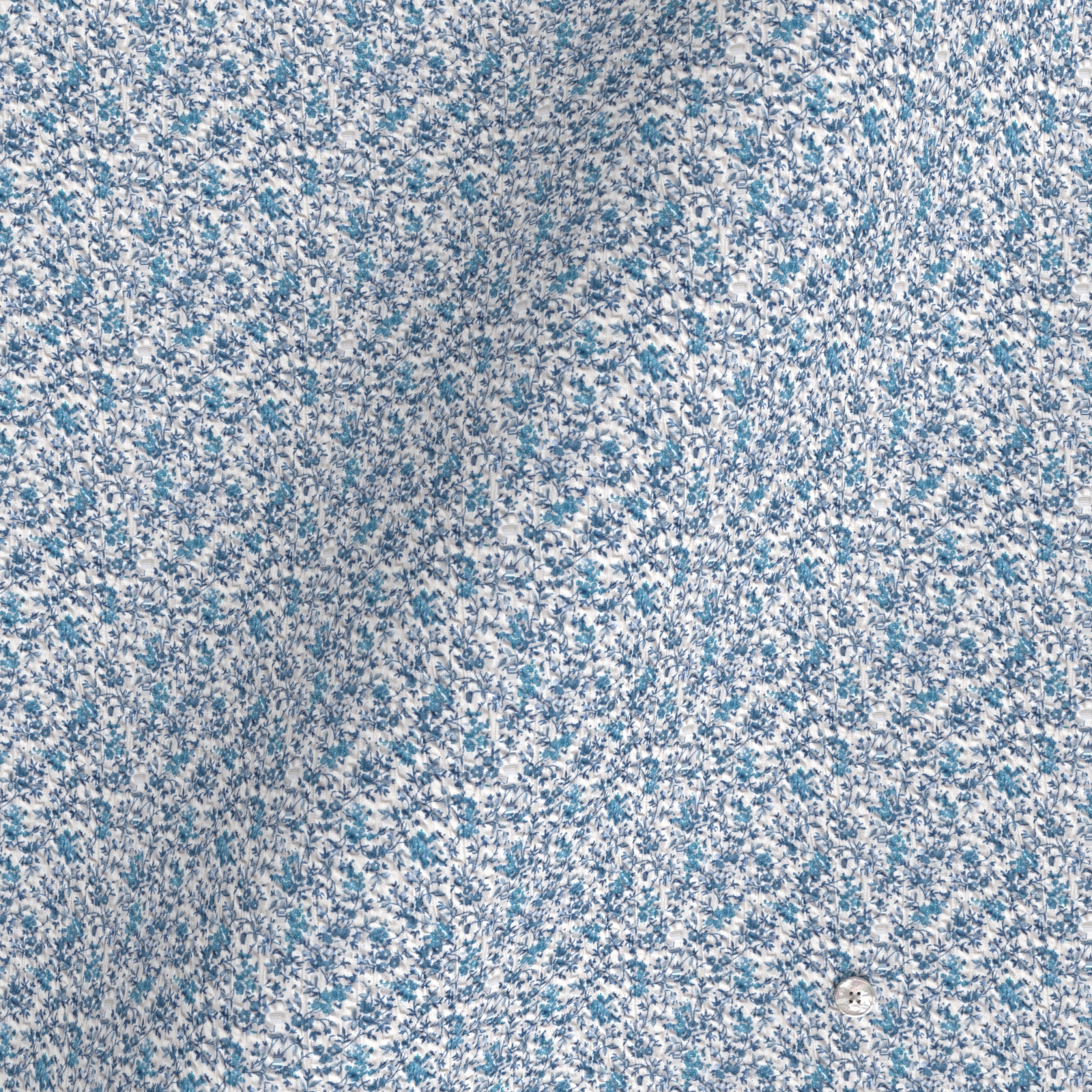 ブルー濃淡の小花柄ルーベンズ・ローズにシュリンク(絞りのようなマイクロウエーブ)加工がされたストレッチ性の高い生地です。