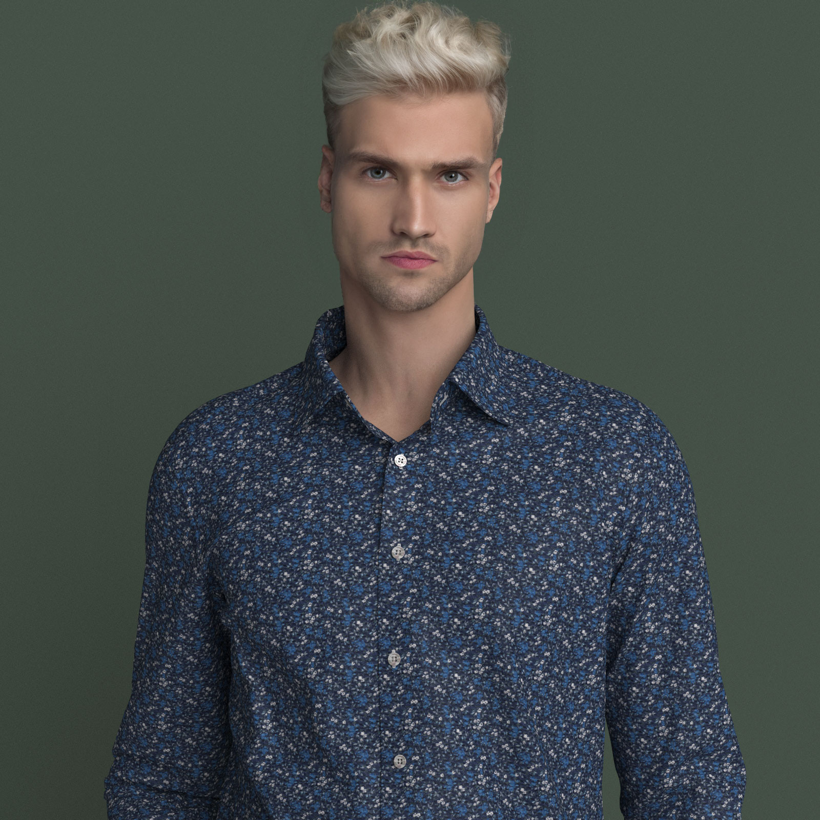 ネイビーにブルーの小花柄ルーベンズ・ローズにシュリンク(絞りのようなマイクロウエーブ)加工がされたストレッチ性の高い生地です。