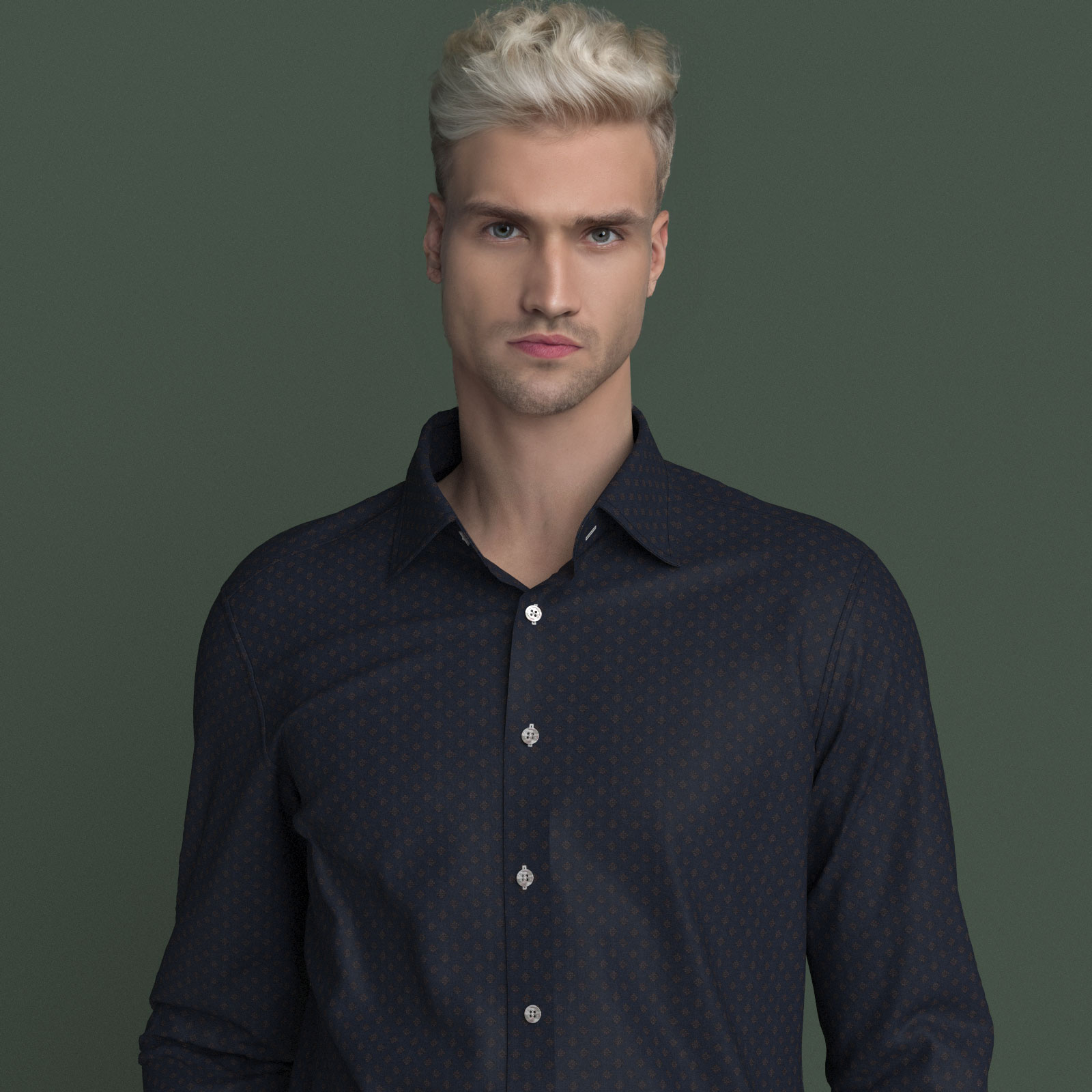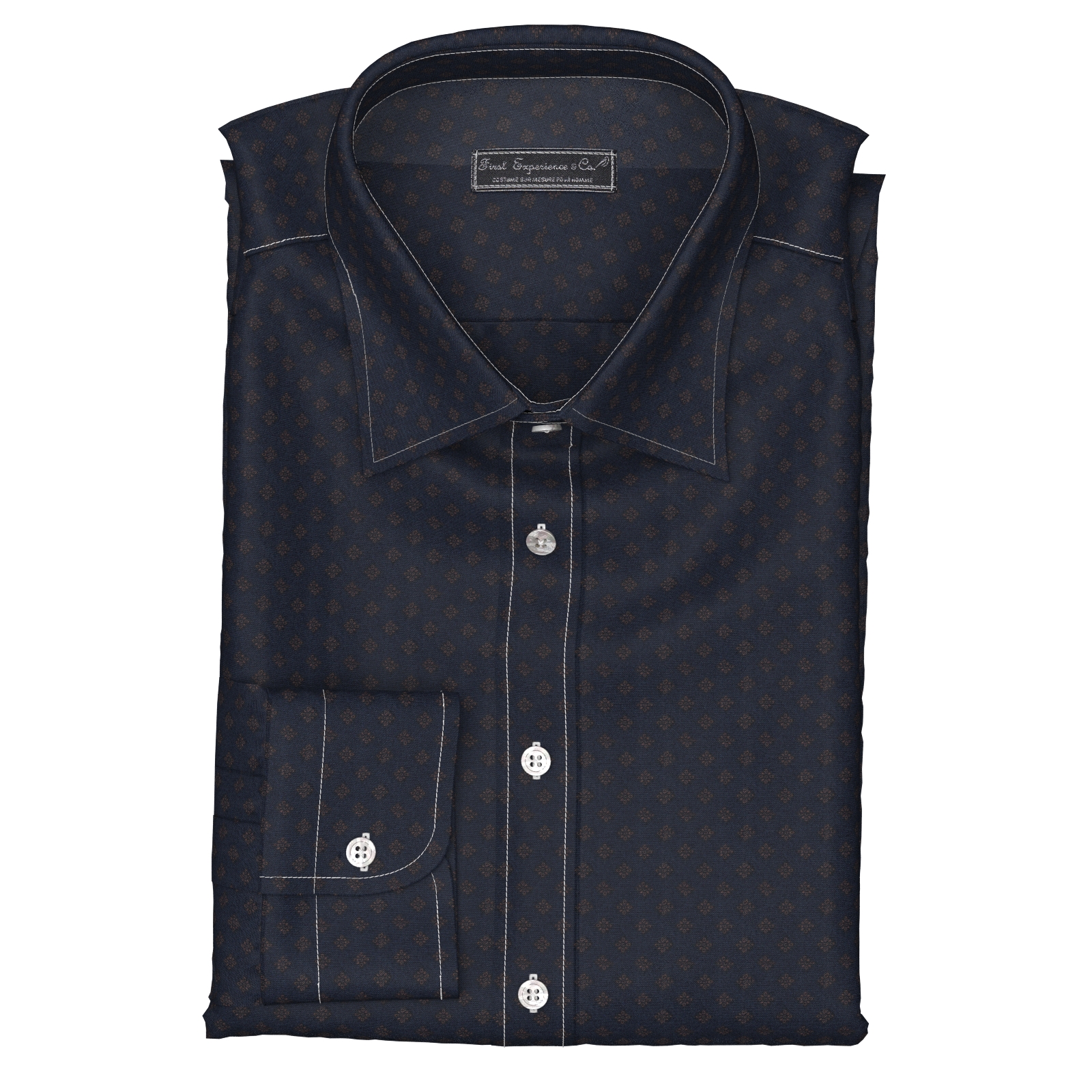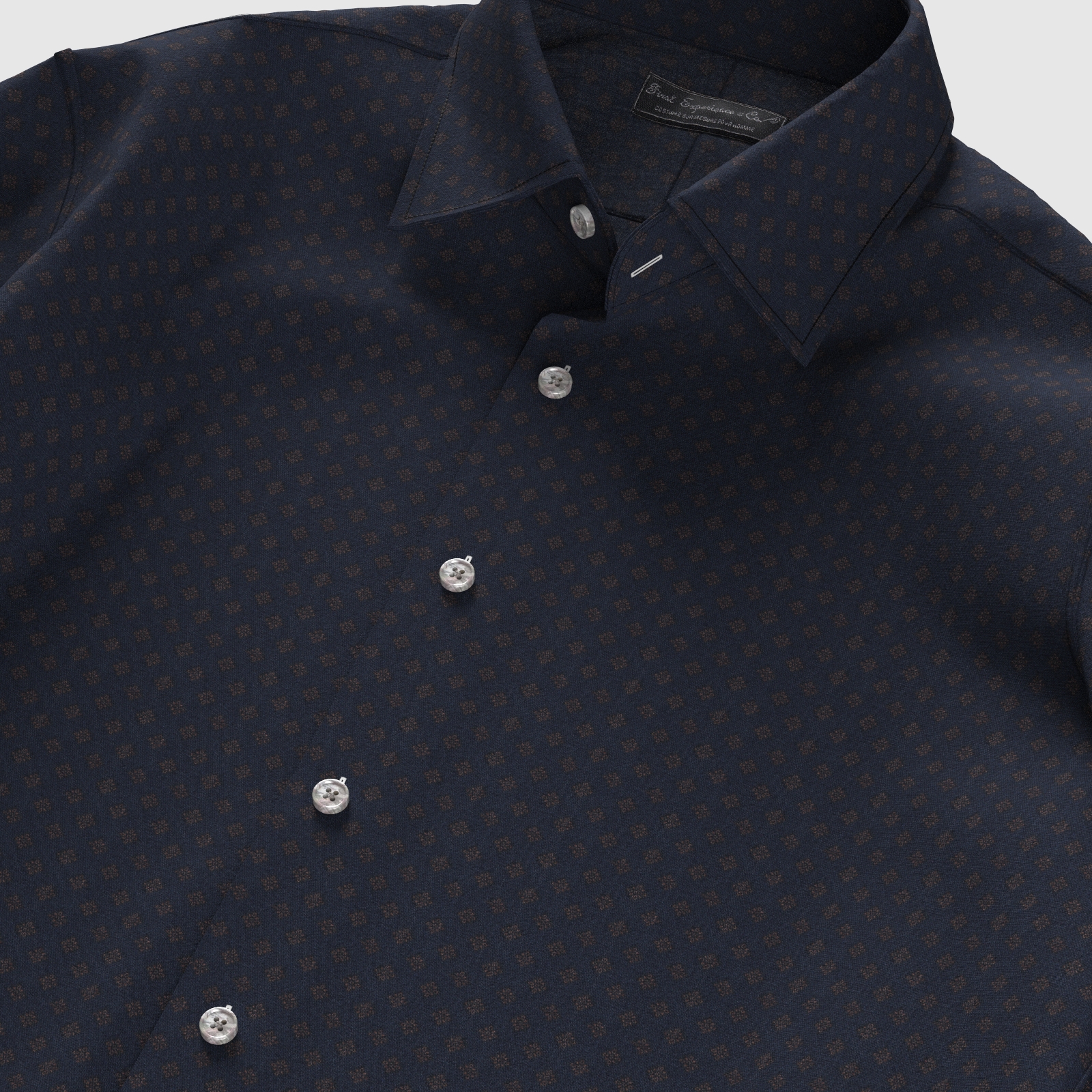 しっかりとした打ち込み本数のブロード120gmsにネイビー×ゴールド小紋柄のプリントをした上質生地です。