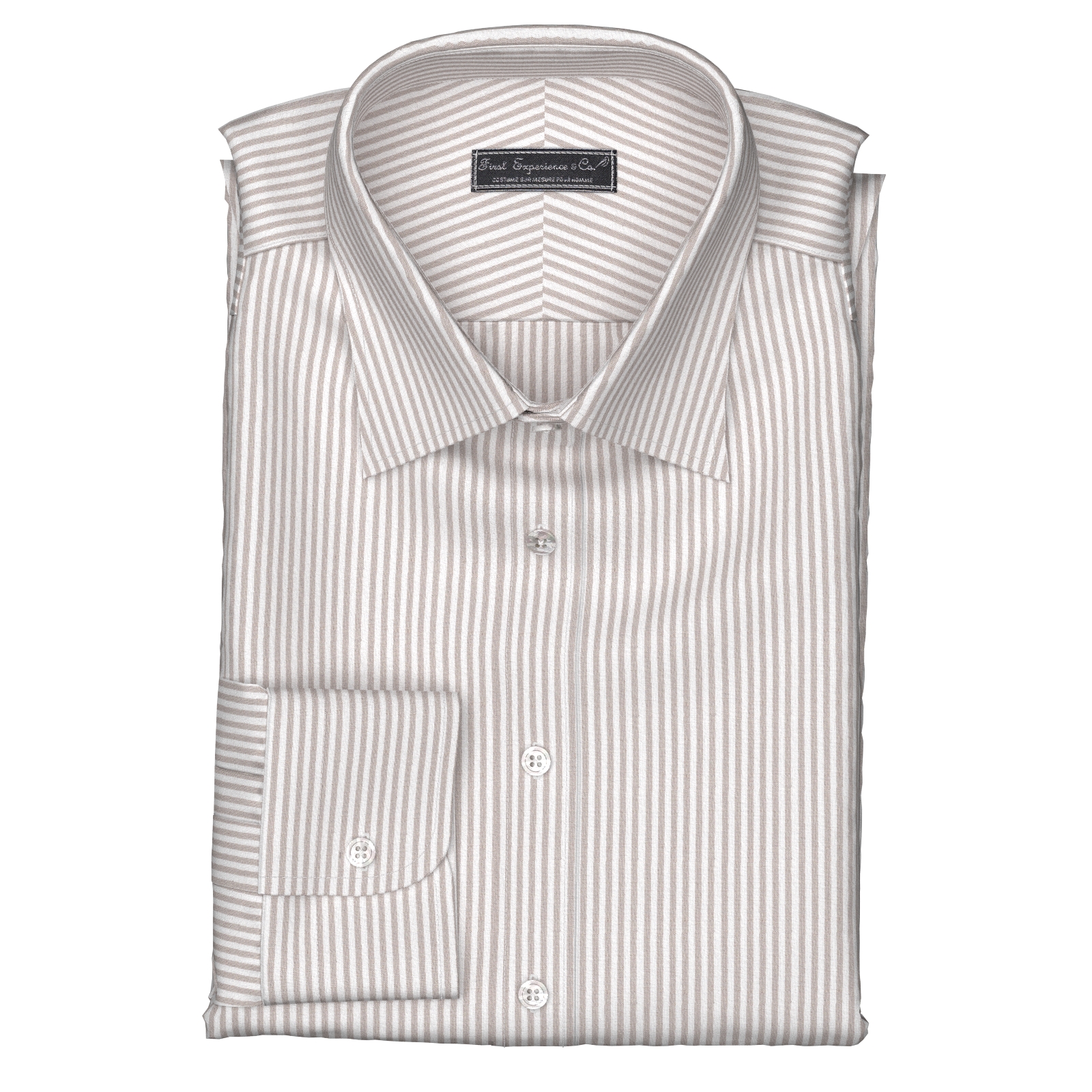 麻のようなナチュラル感と、ドライな風合いのリネンライクながらオックスの雰囲気もあるベージュ・ストライプのファブリックです。