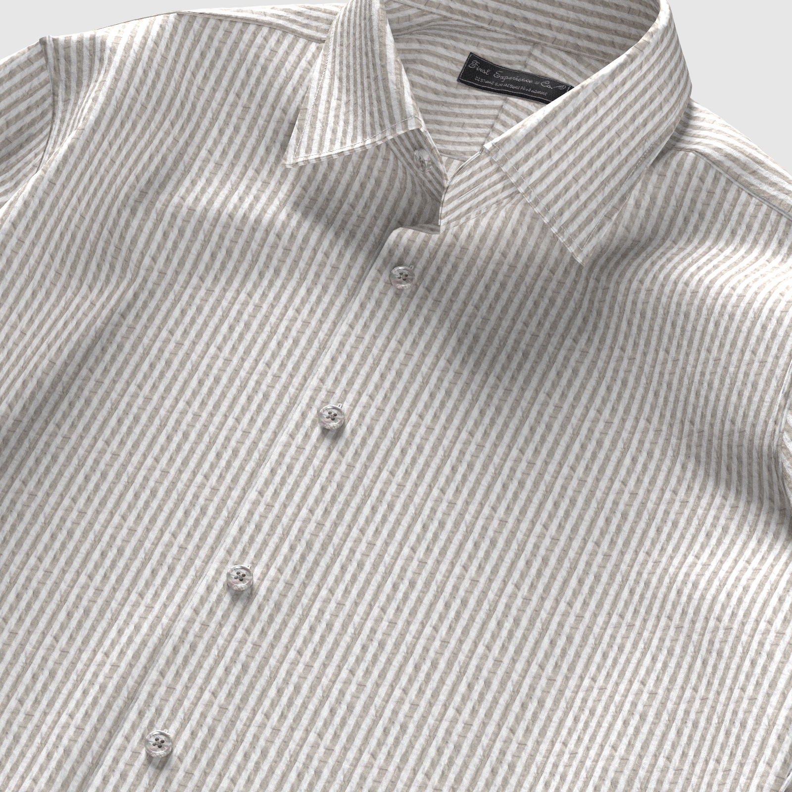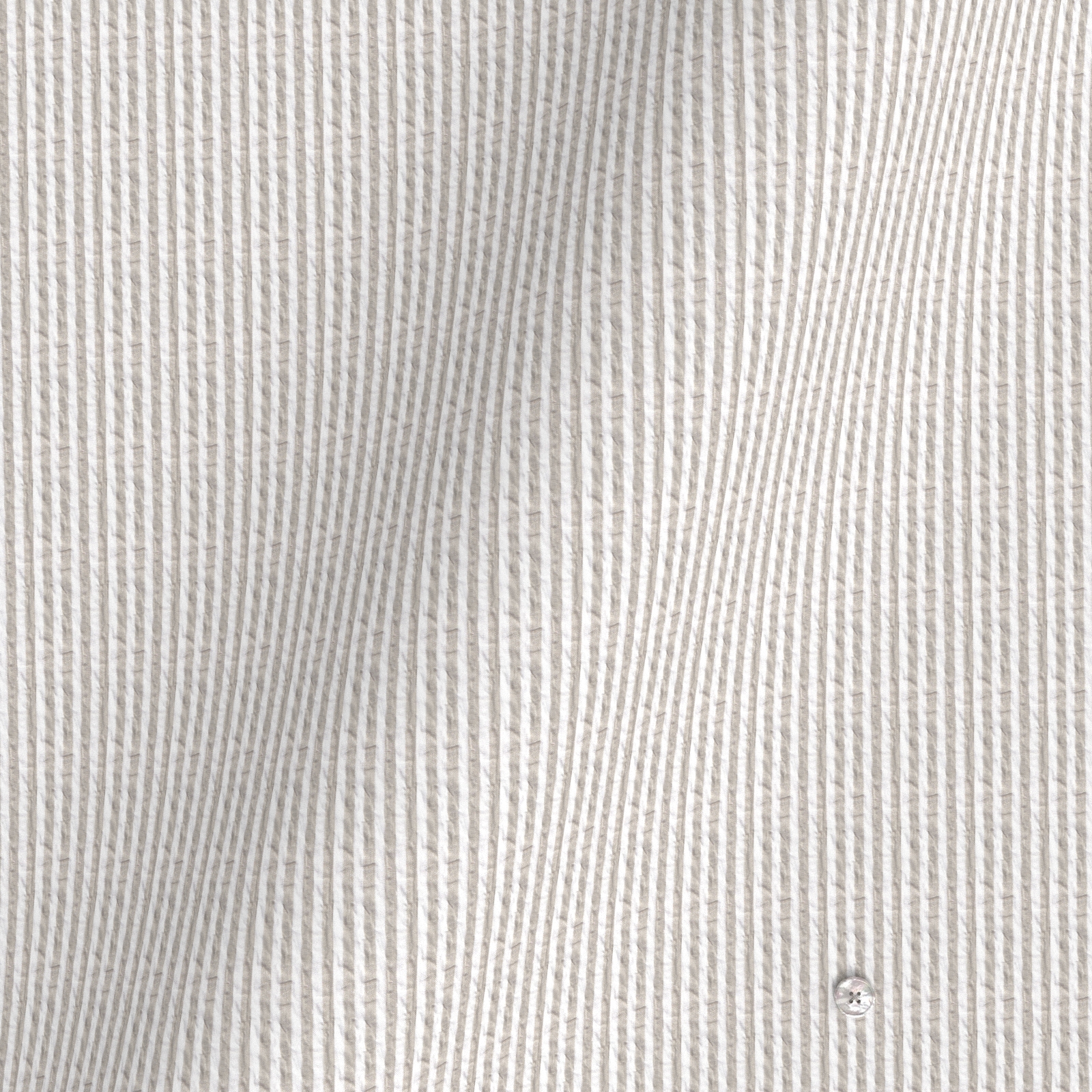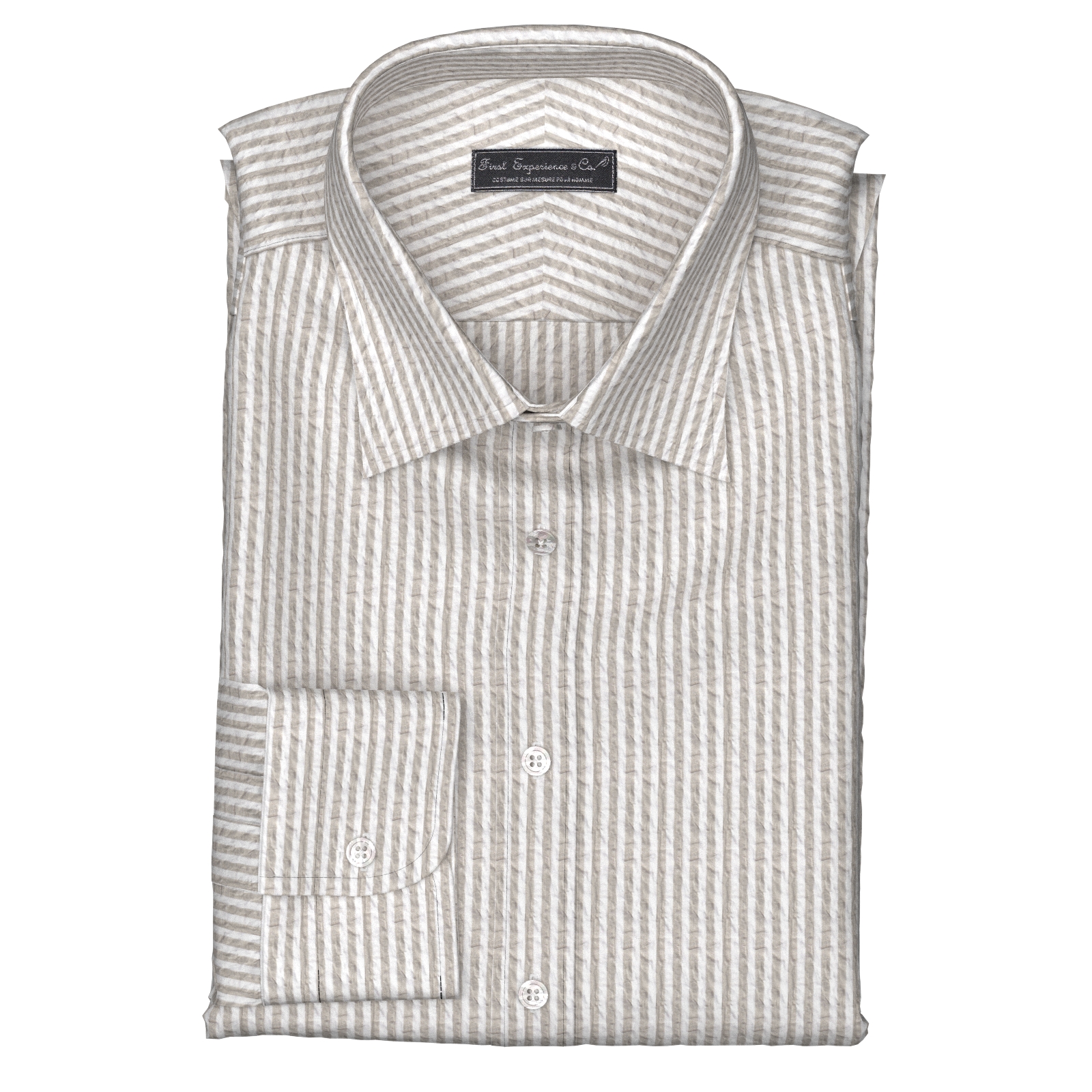 風合いがソフトな80双糸の上質素材を使用した凹凸感のあるシアサッカー素材のようなミラクルウエーブのベージュ・ロンドンストライプ生地となります。