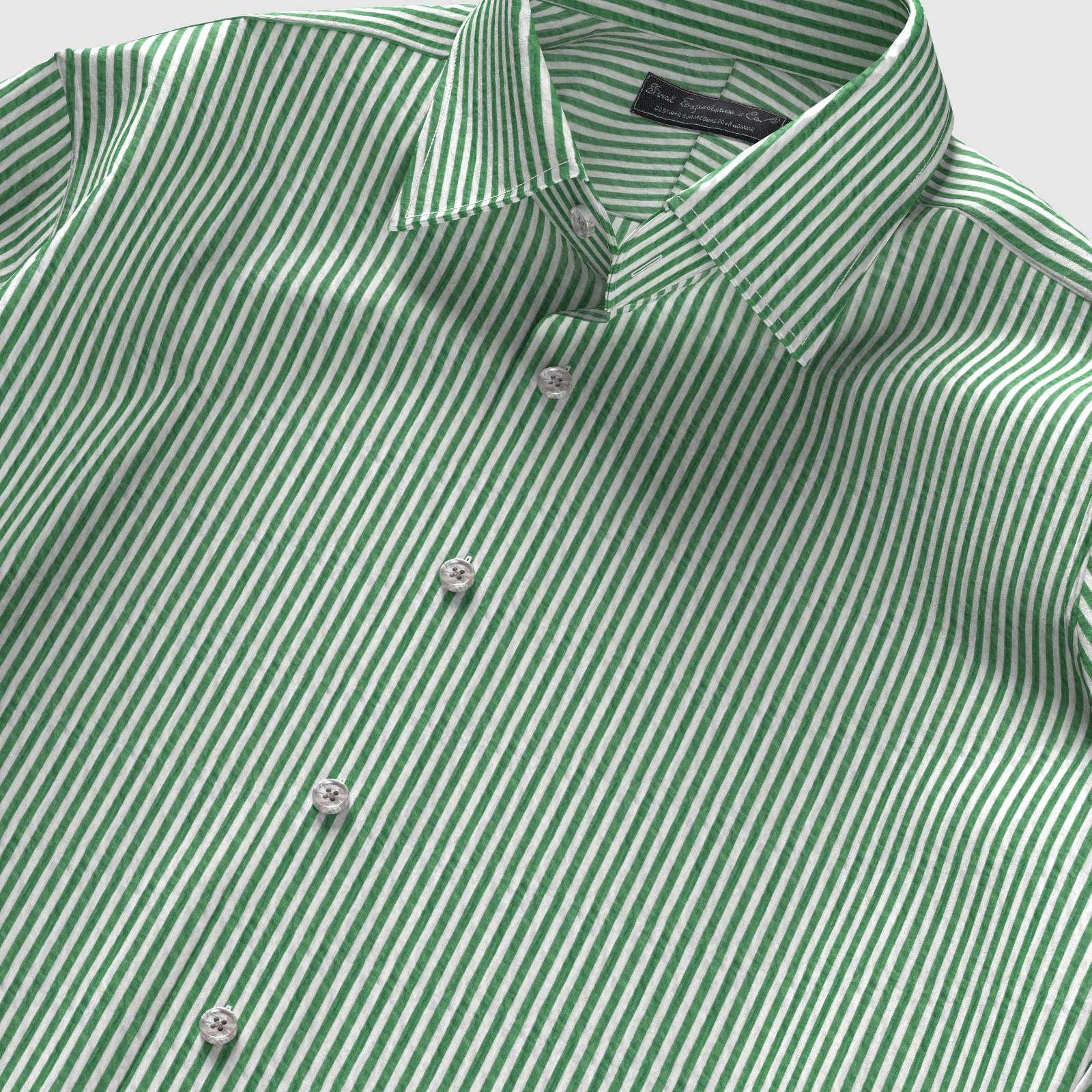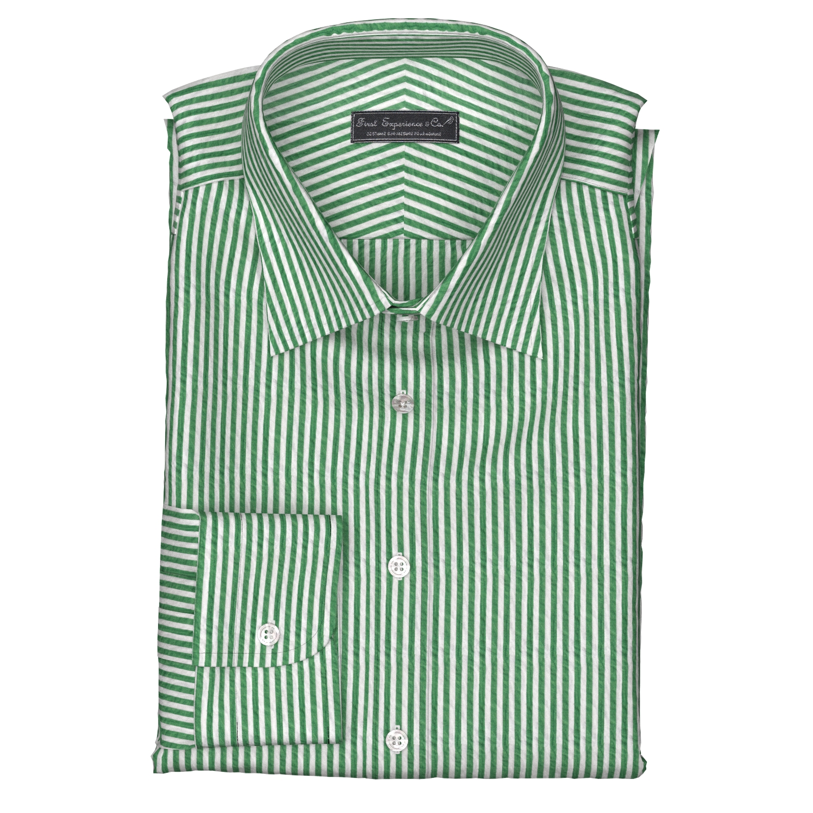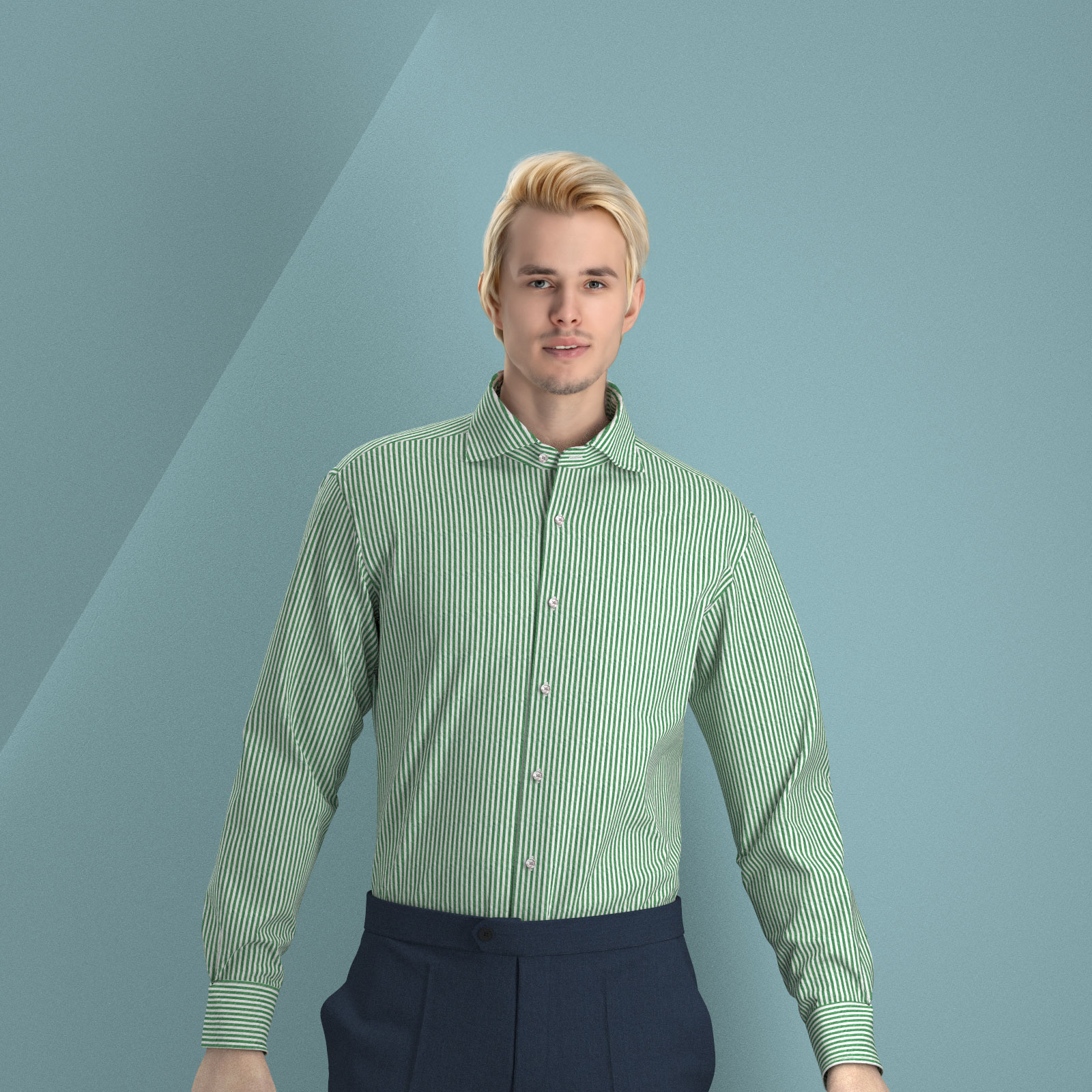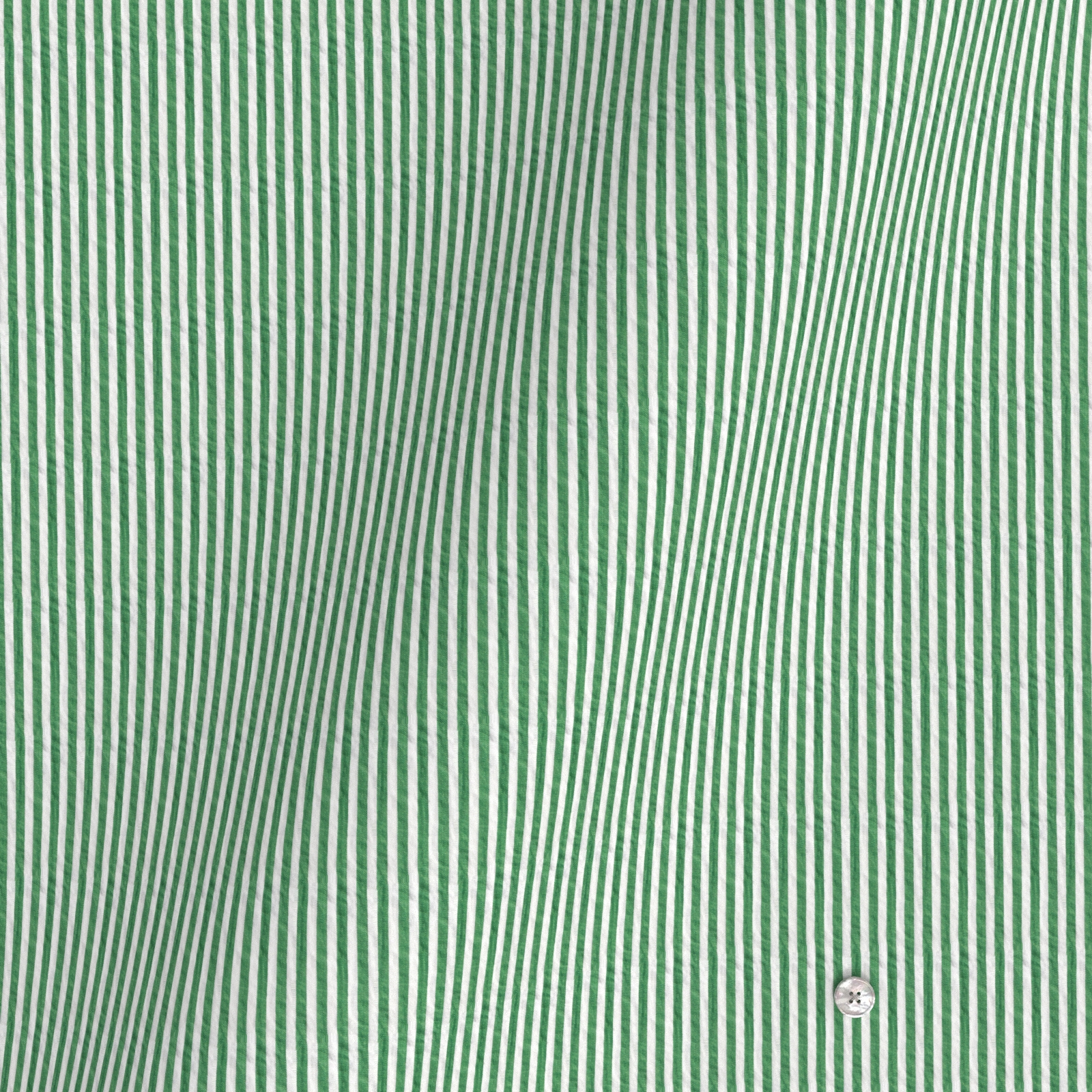 風合いがソフトな80双糸の上質素材を使用した凹凸感のあるシアサッカー素材のようなミラクルウエーブのグリーン・ロンドンストライプ生地となります。