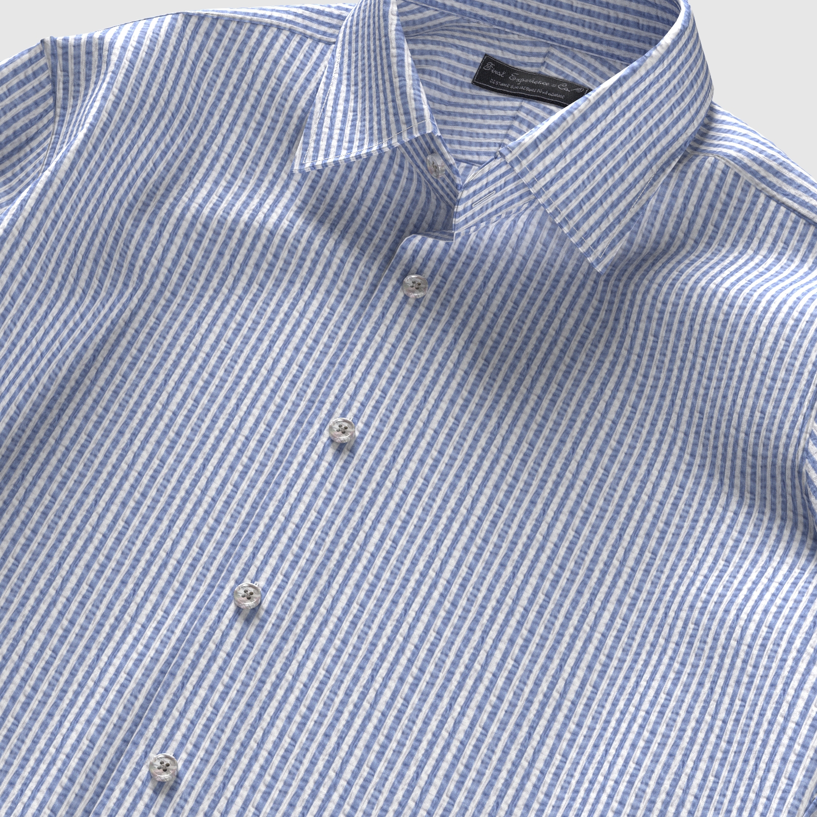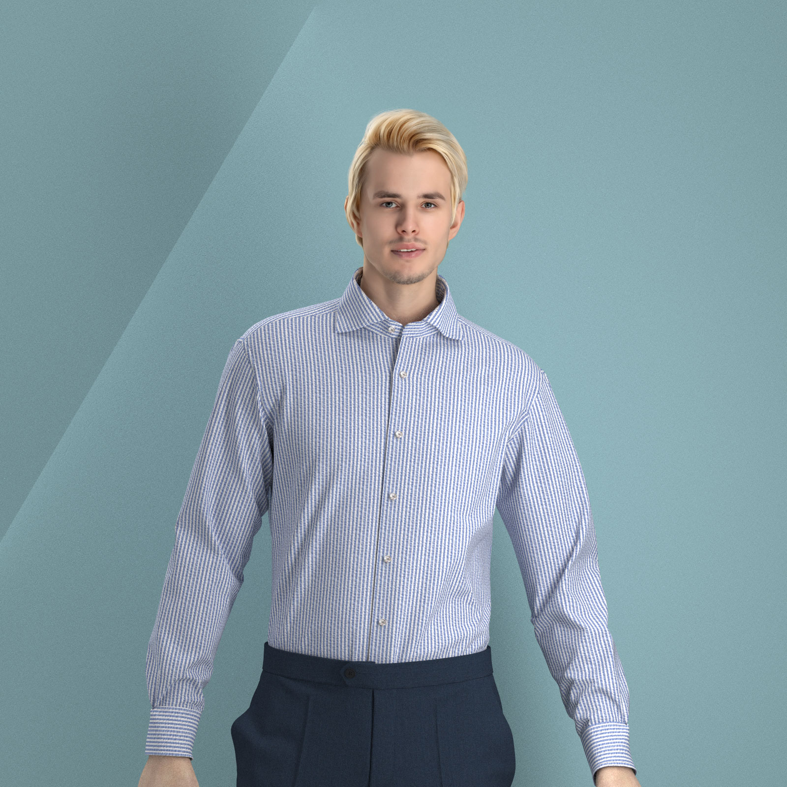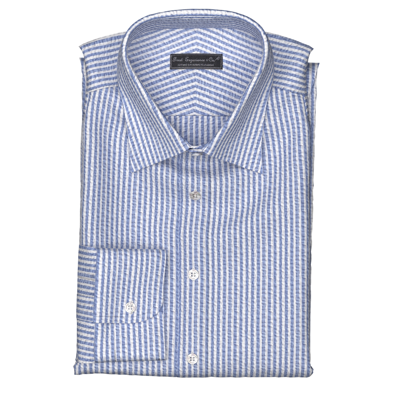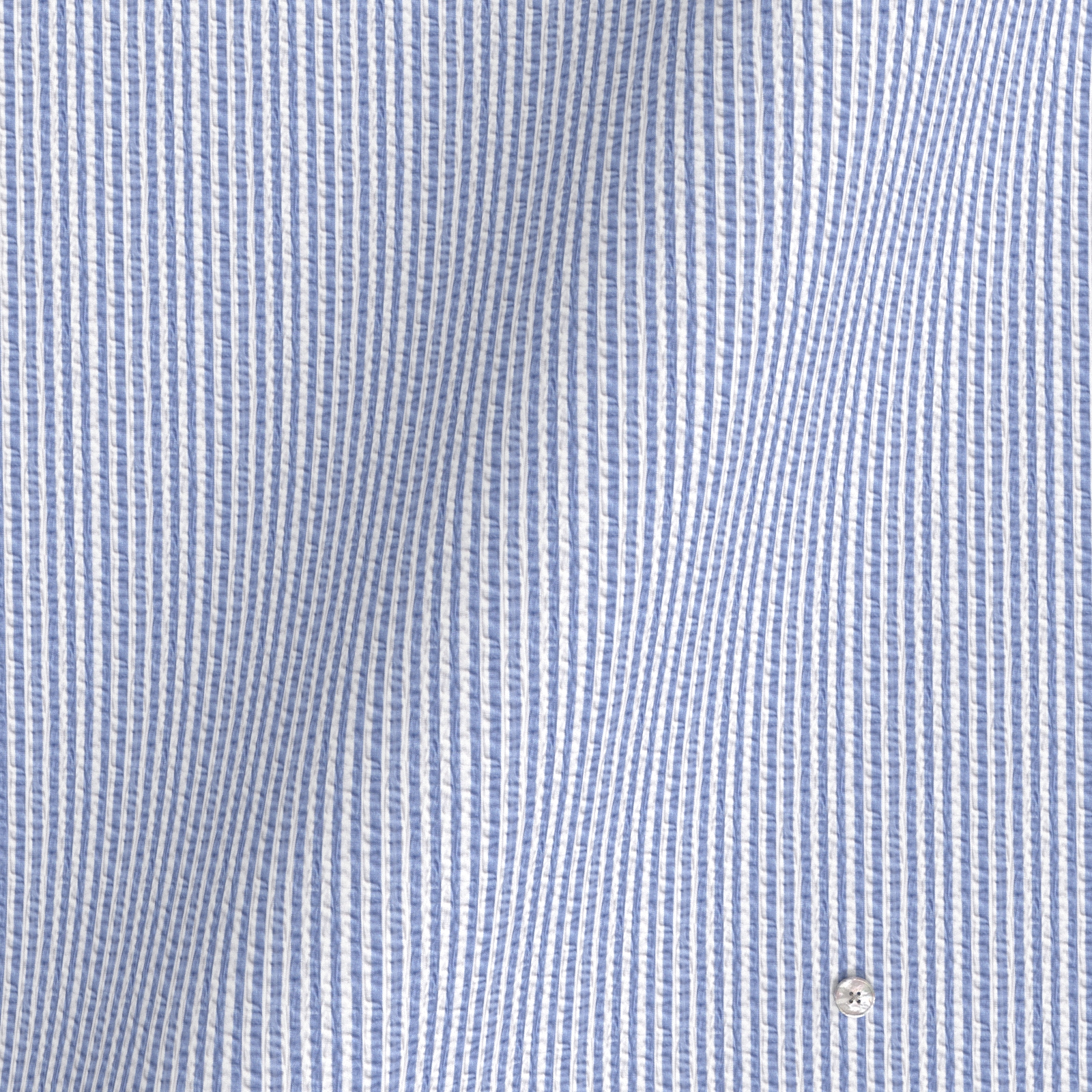 風合いがソフトな80双糸の上質素材を使用した凹凸感のあるシアサッカー素材のようなミラクルウエーブの少しラベンダーがかったサックス・ロンドンストライプ生地となります。