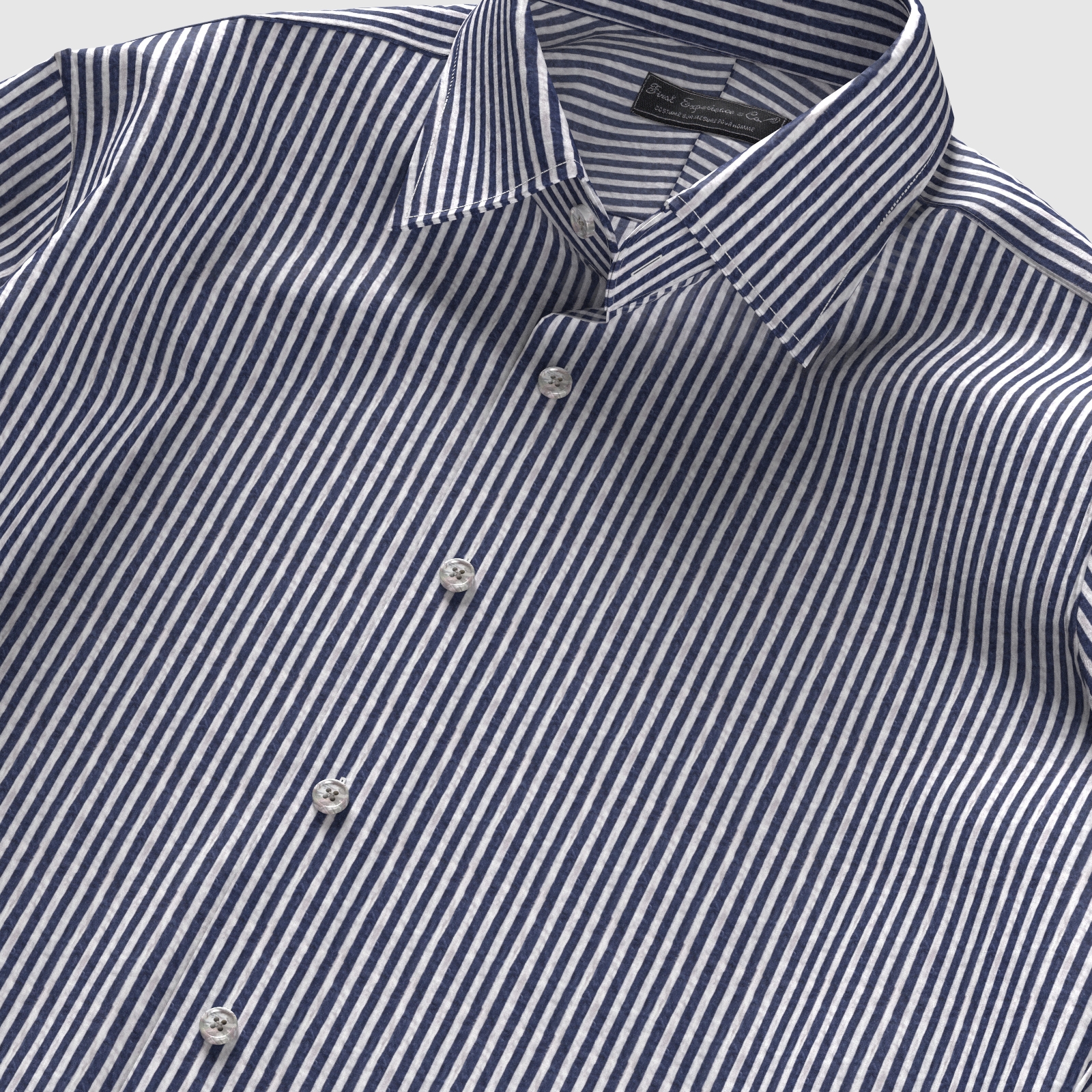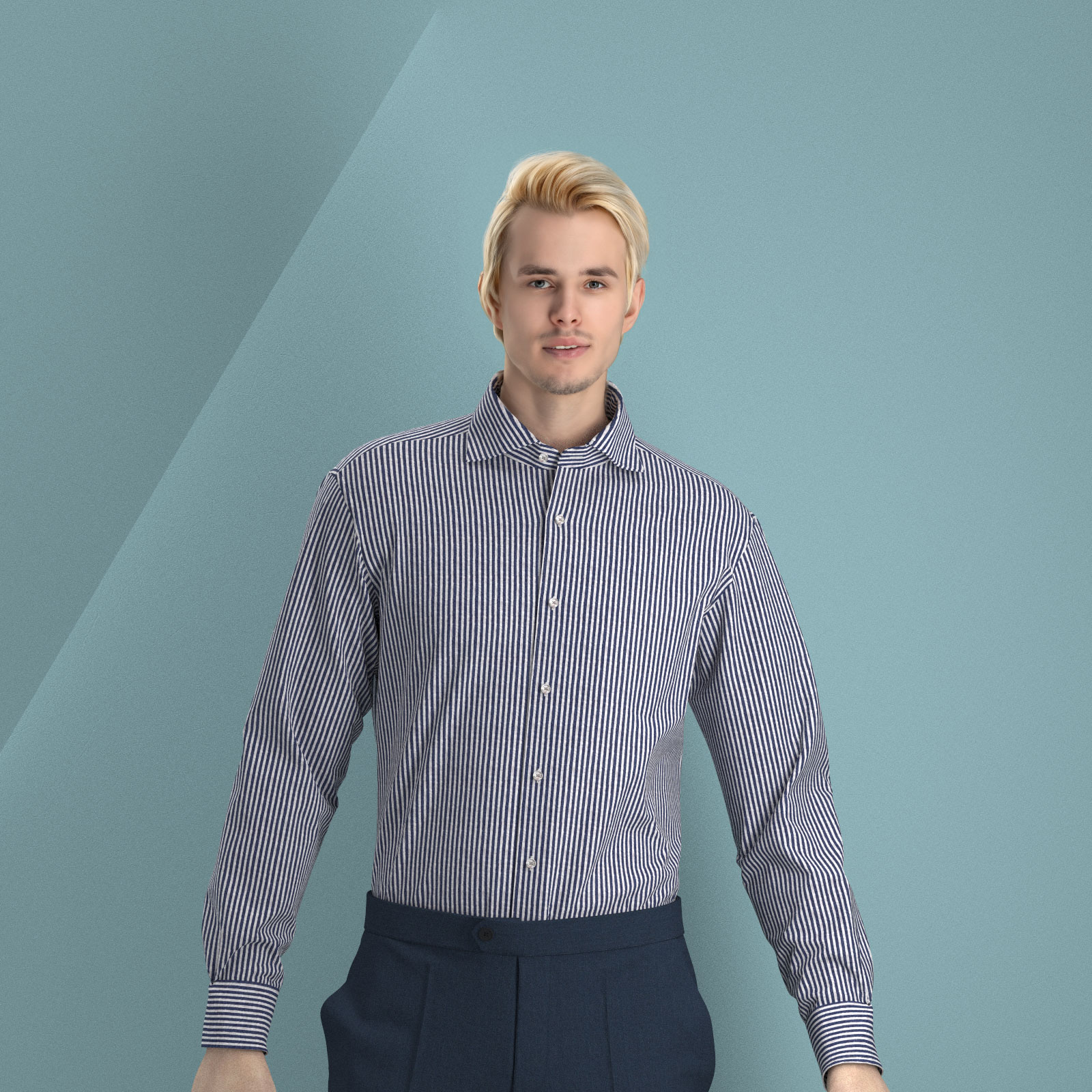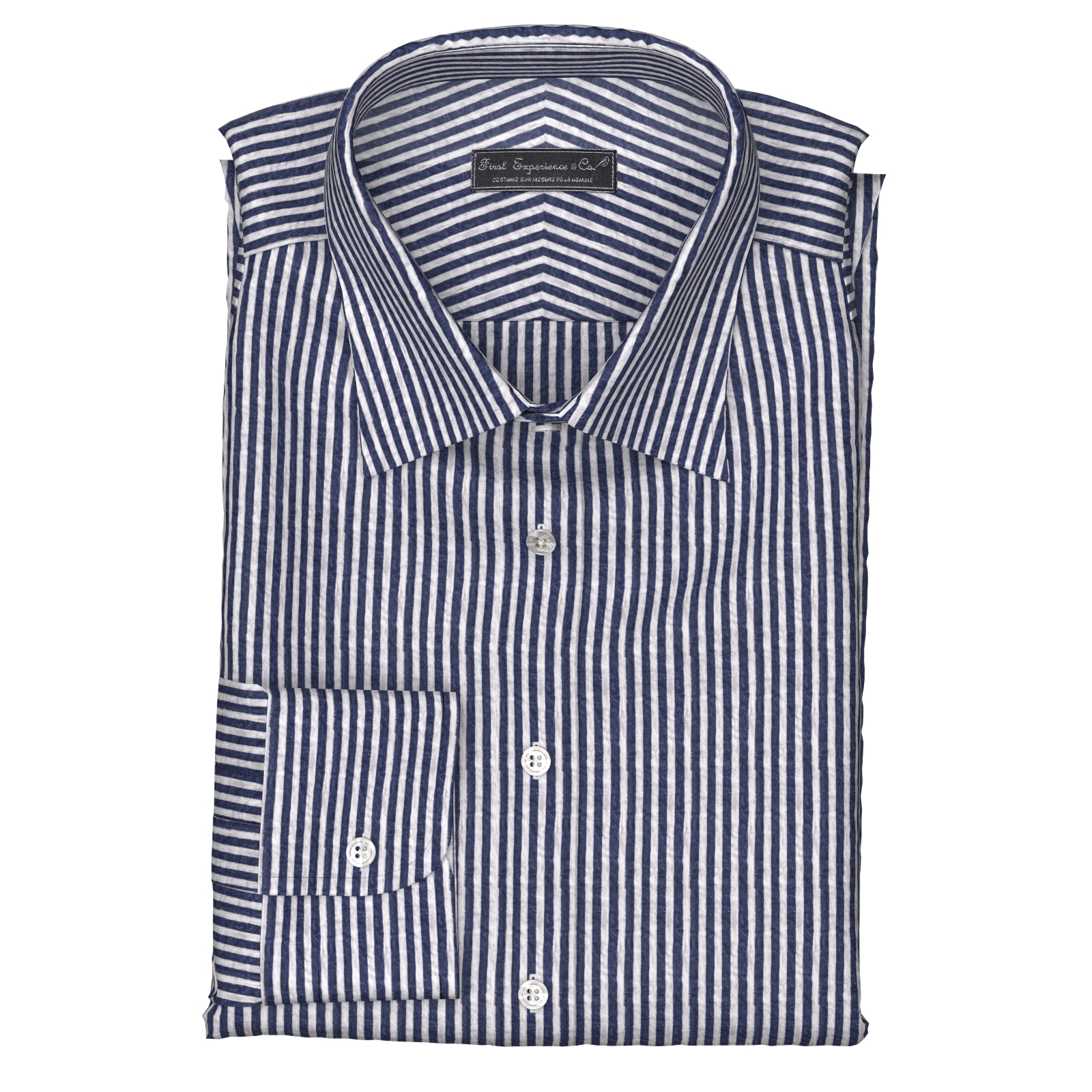 風合いがソフトな80双糸の上質素材を使用した凹凸感のあるシアサッカー素材のようなミラクルウエーブのでネイビー・ロンドンストライプ生地となります。