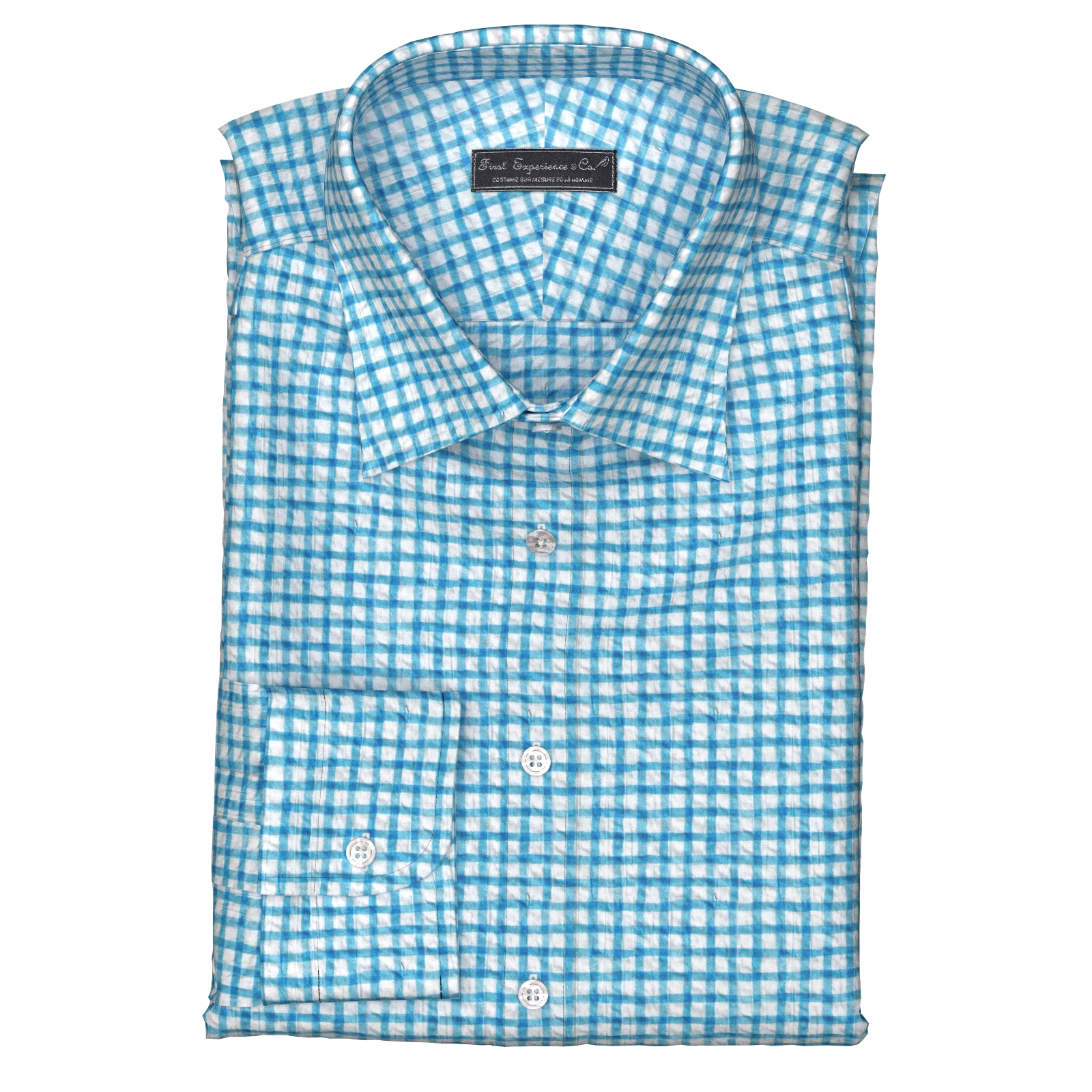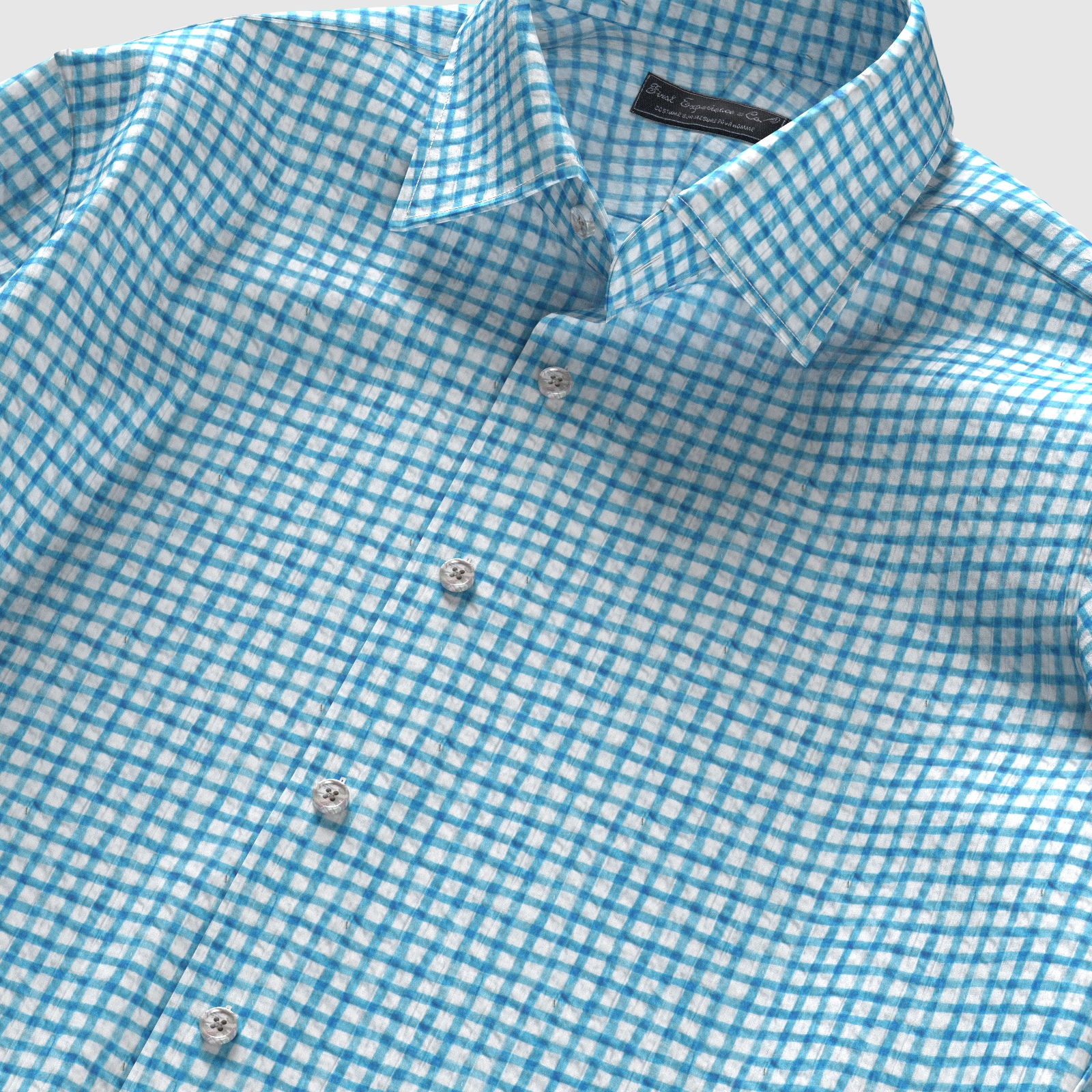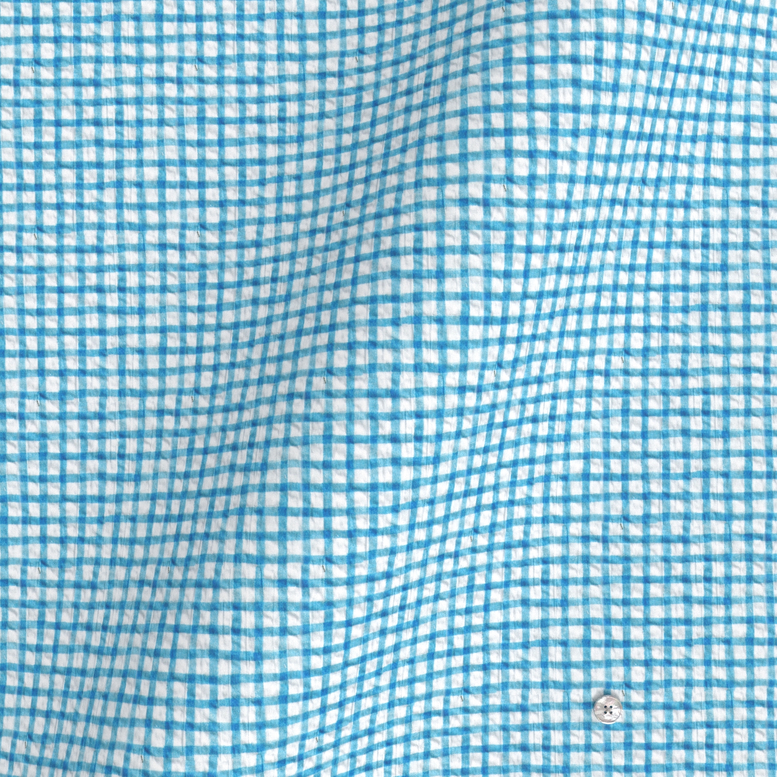 風合いがソフトな80双糸の上質素材を使用した凹凸感のあるシアサッカー素材のようなミラクルウエーブの手書き風サックス・チェック生地となります。