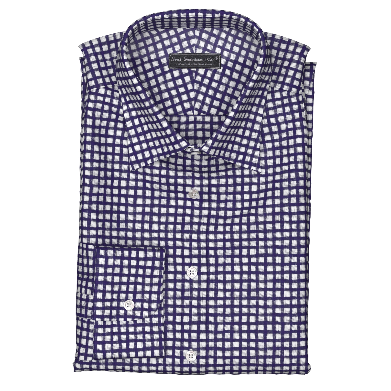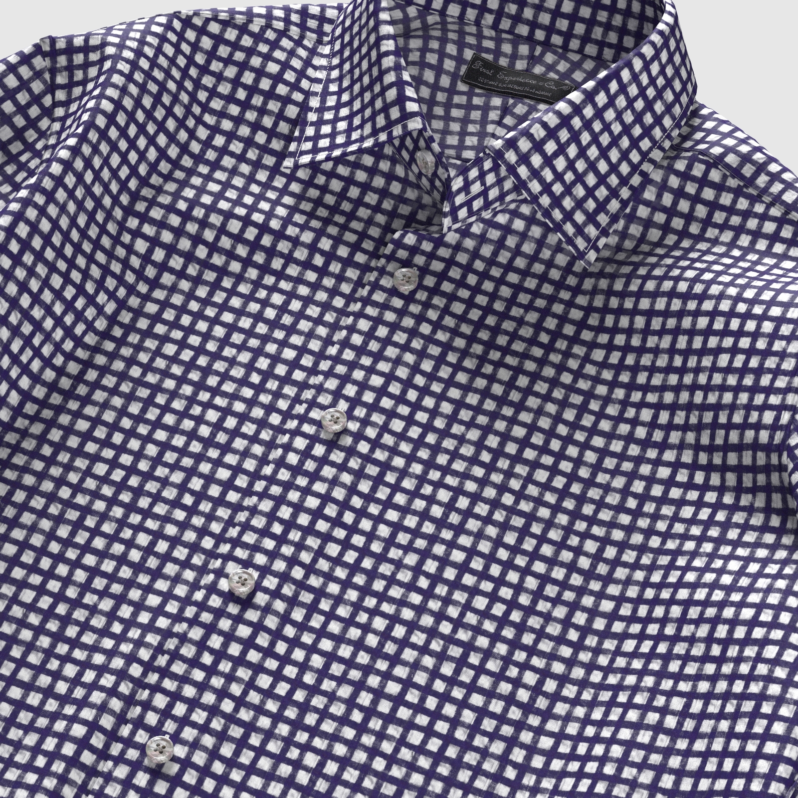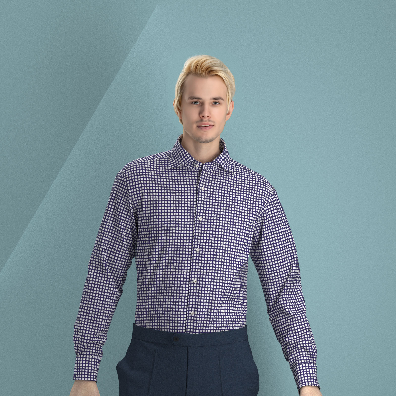 風合いがソフトな80双糸の上質素材を使用した凹凸感のあるシアサッカー素材のようなミラクルウエーブので手書き風ネイビー・チェック生地となります。