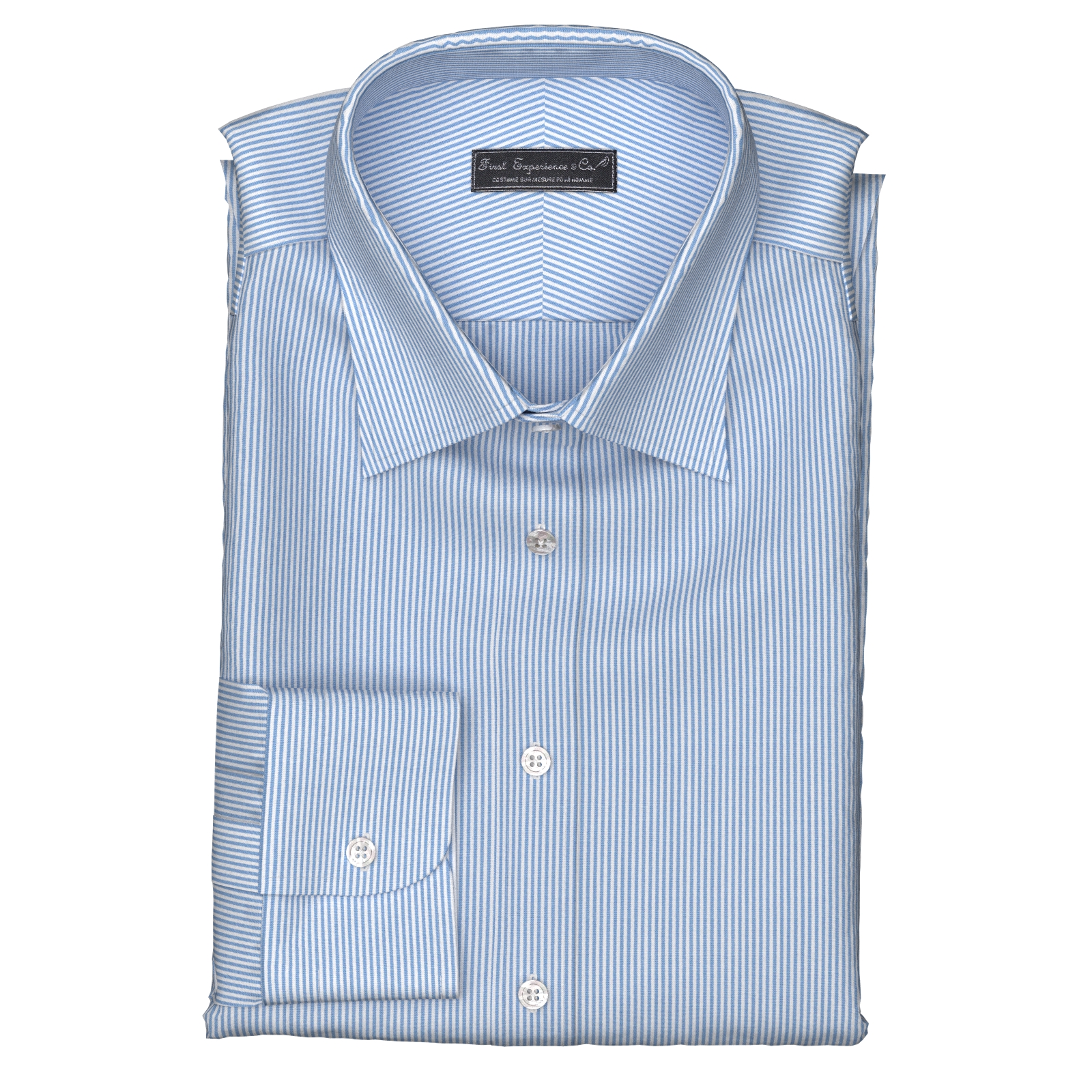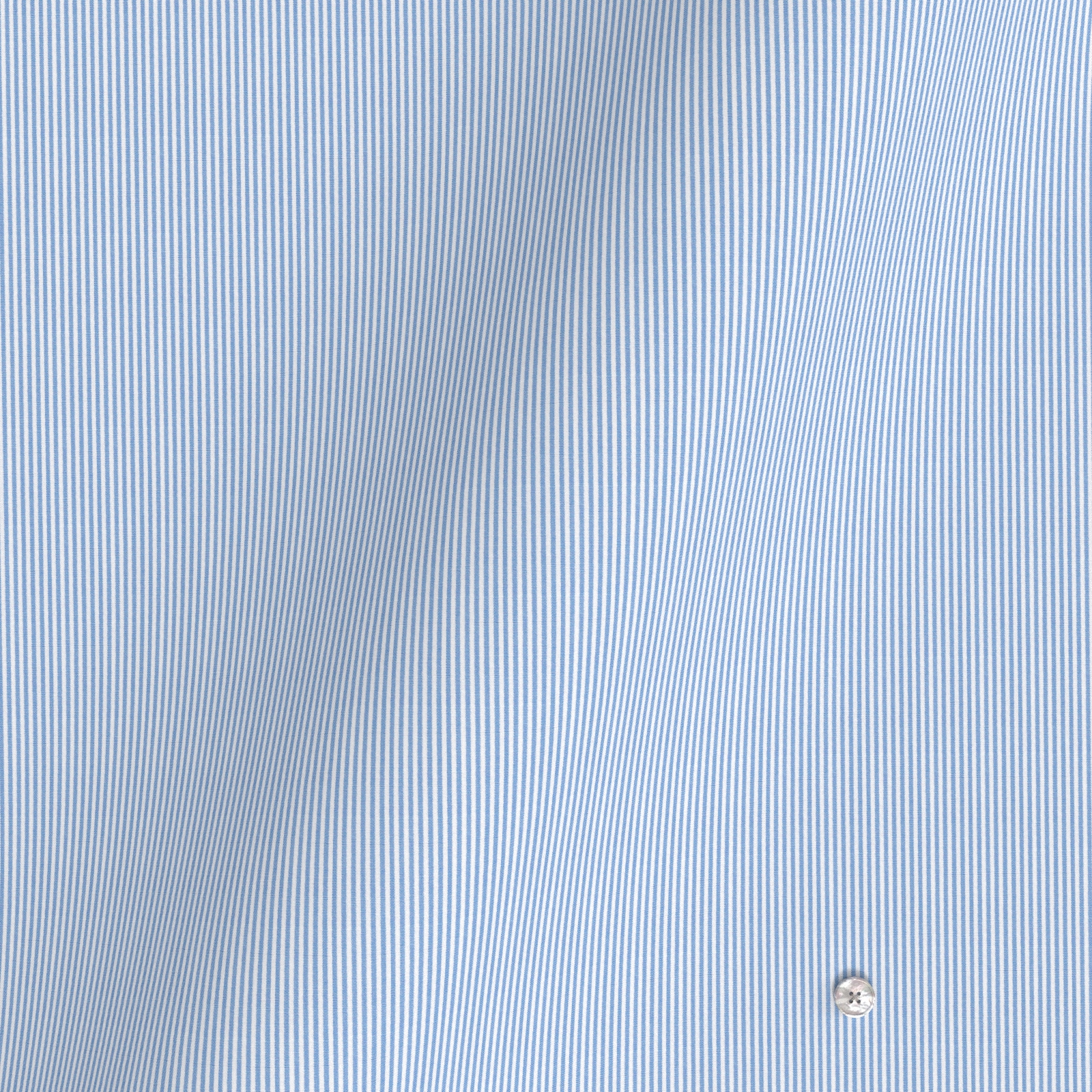 きれいなサックスの細めストライプの綿100%イージーケア素材です。家庭洗濯+軽いアイロンがけですっきり・きっちりと着こなせる忙しいビジネスマンにぴったりの素材です。肌触りも綿100%の風合いを損なわない着心地です。