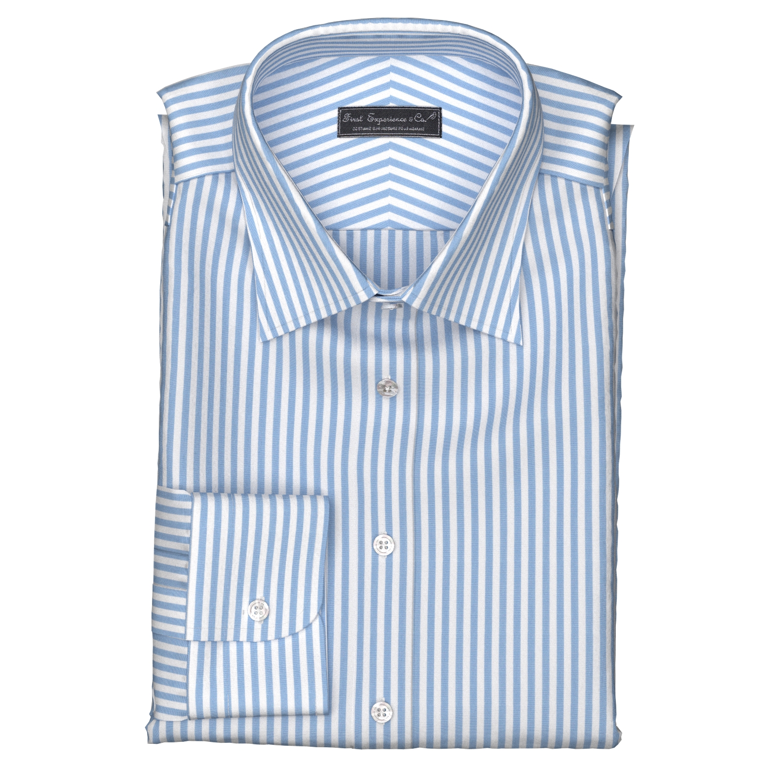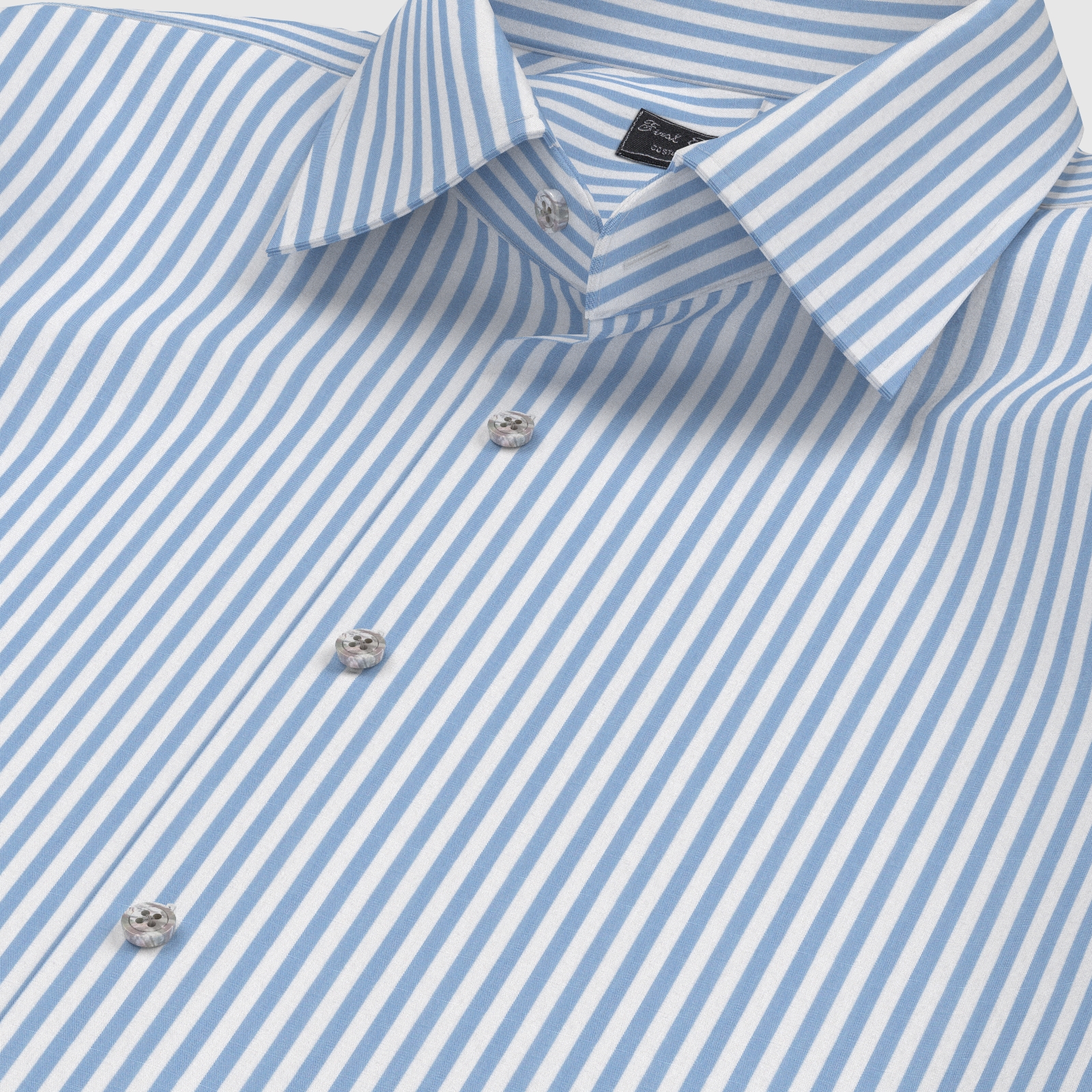 きれいなサックス・ボールドストライプの綿100%イージーケア素材です。家庭洗濯+軽いアイロンがけですっきり・きっちりと着こなせる忙しいビジネスマンにぴったりの素材です。肌触りも綿100%の風合いを損なわない着心地です。