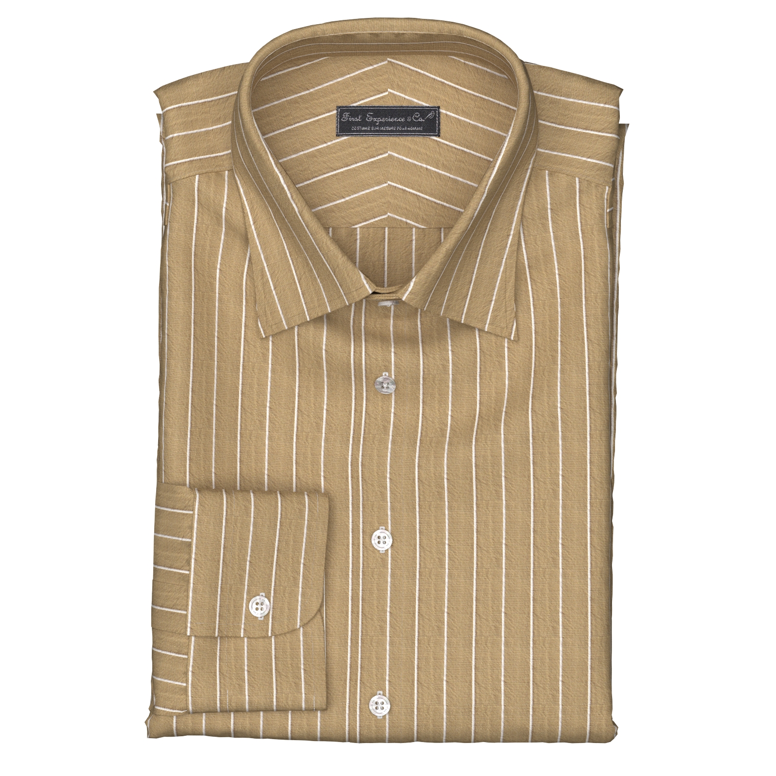 糸の節感がナチュラルな印象を与えるコットン/ラミー(麻)のベージュ・ベースにホワイト・ドビーストライプ生地です。