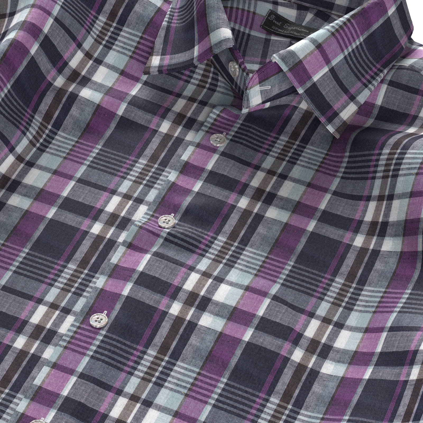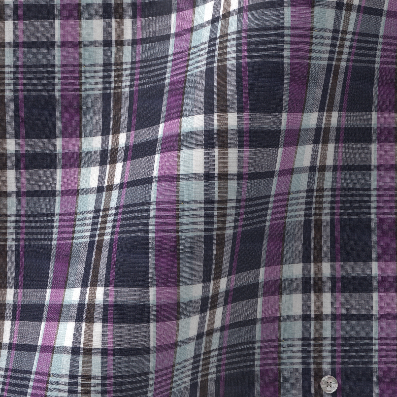 上質なインド綿に理念をブレンドした上質なマドラスネイビー パープル ホワイト チェックのです。程よいハリ・コシがあり、麻によるさらっとしたタッチとナチュラルなルックスが特徴。カラフルな色合いのマドラスチェックです