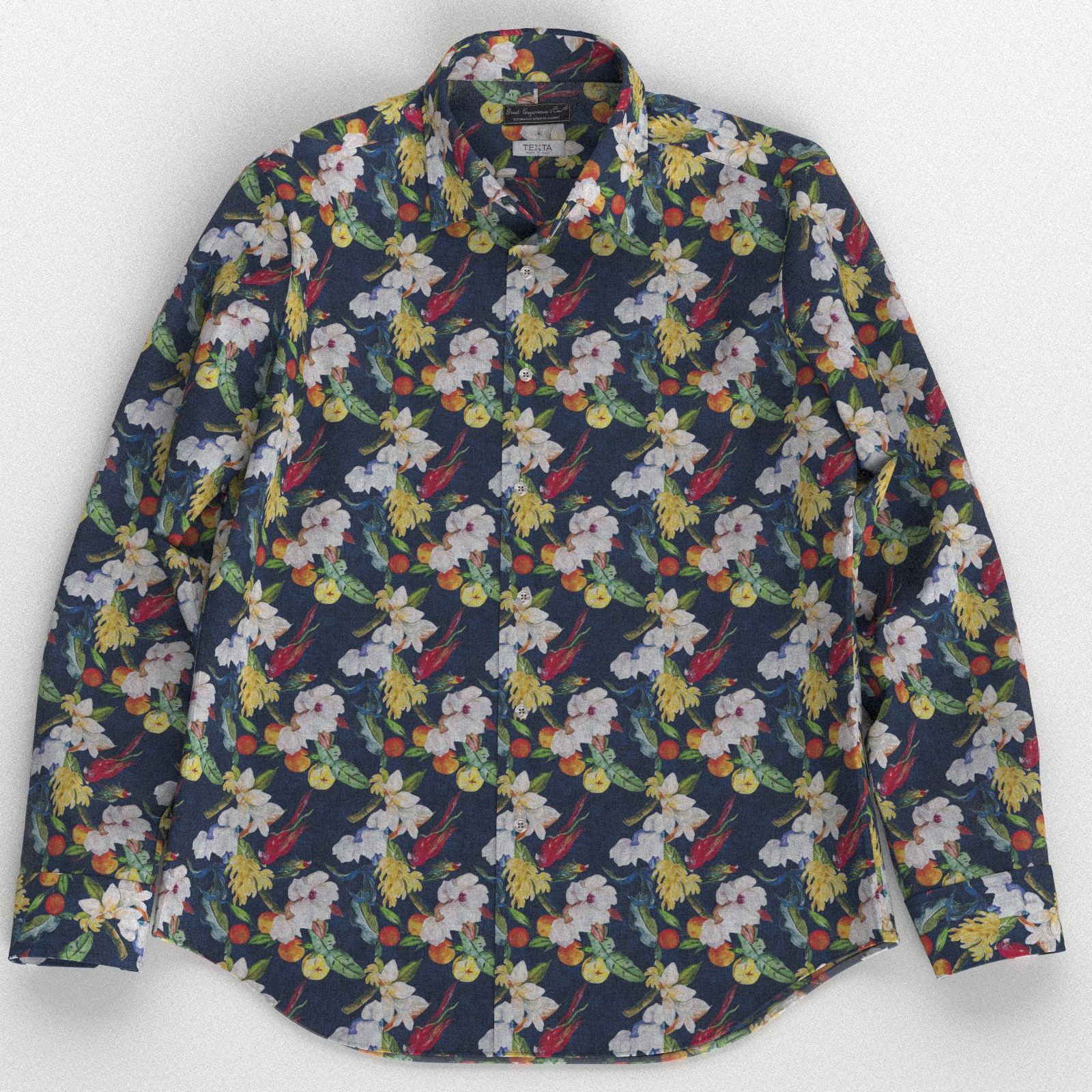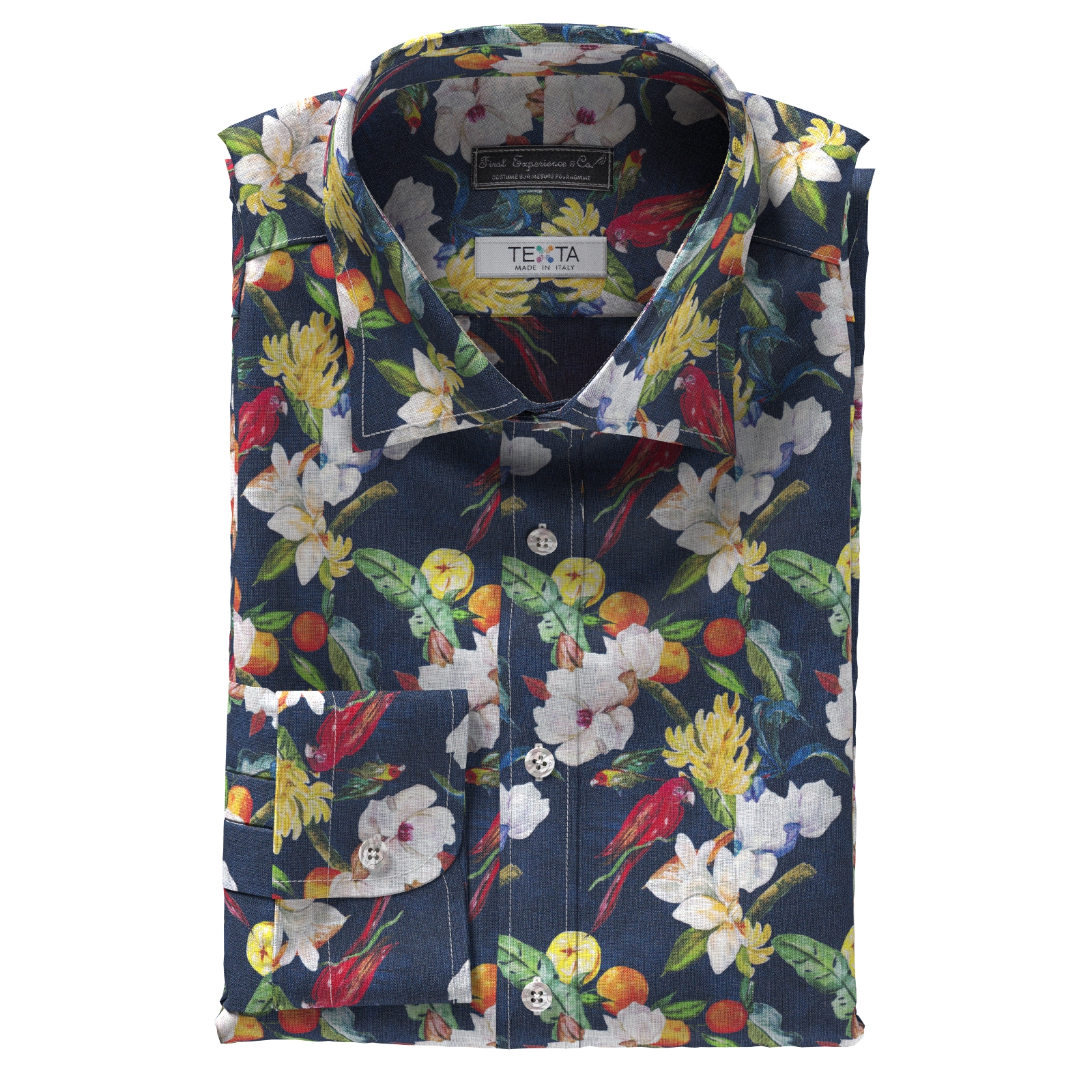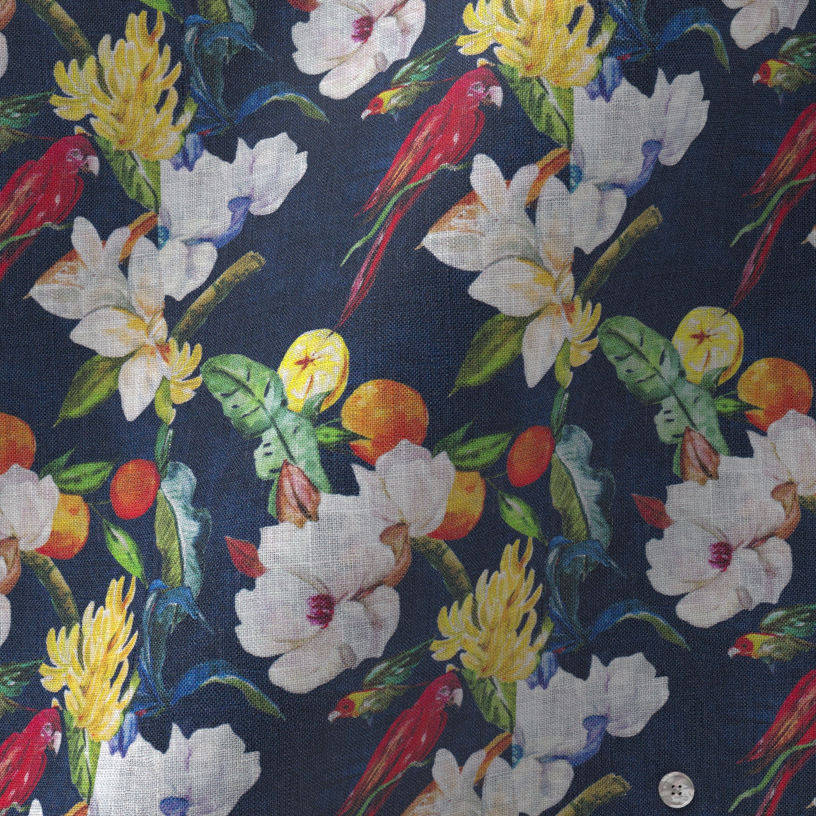 イタリアのテキスタ社のネービーベースにカラフルで上品なリネン素材の花柄と鳥のプリント生地です。