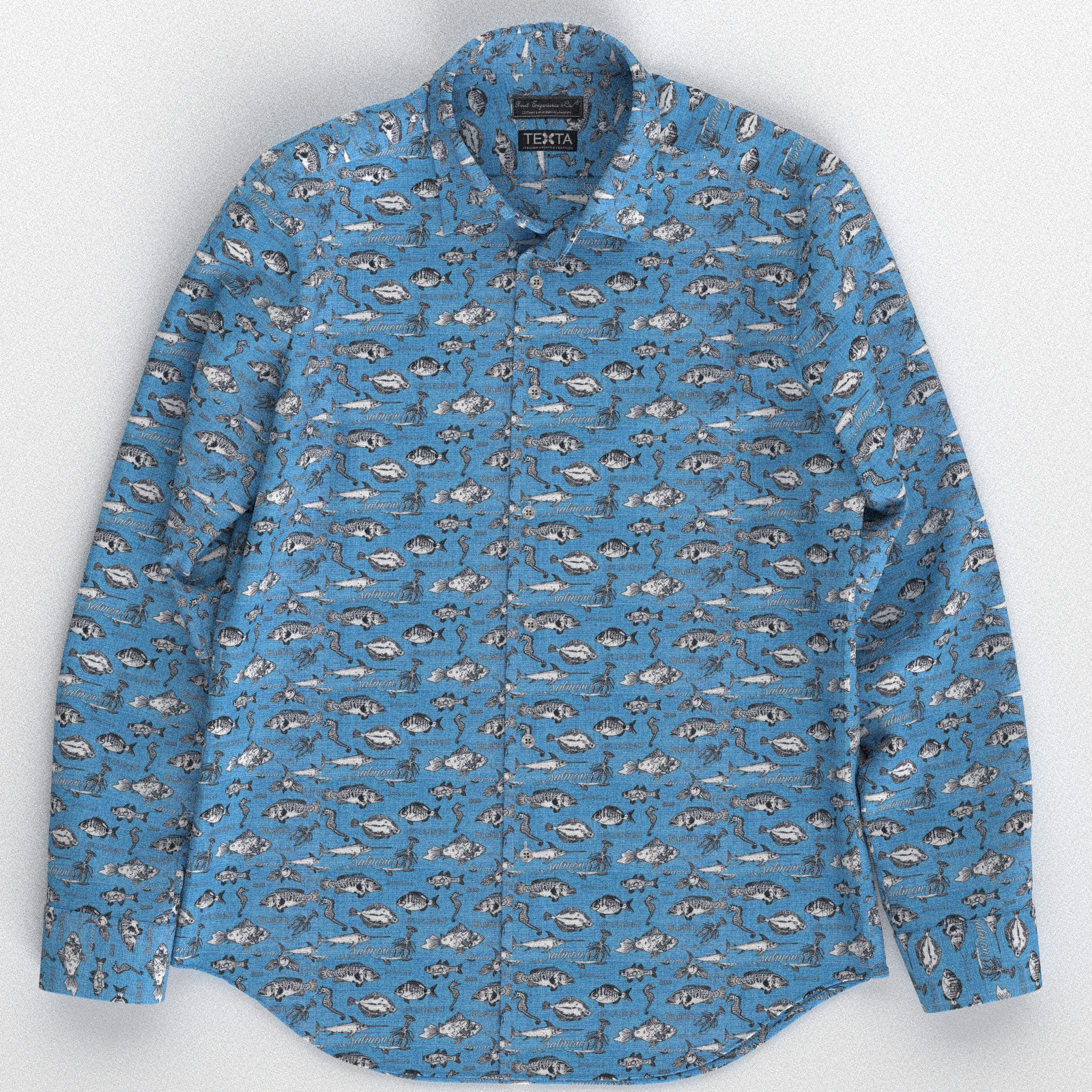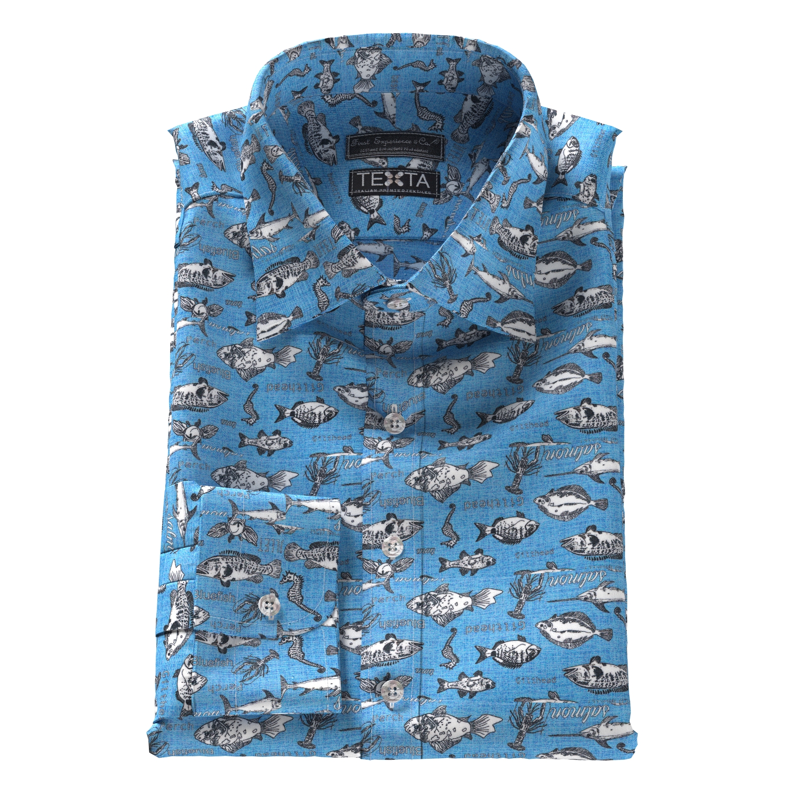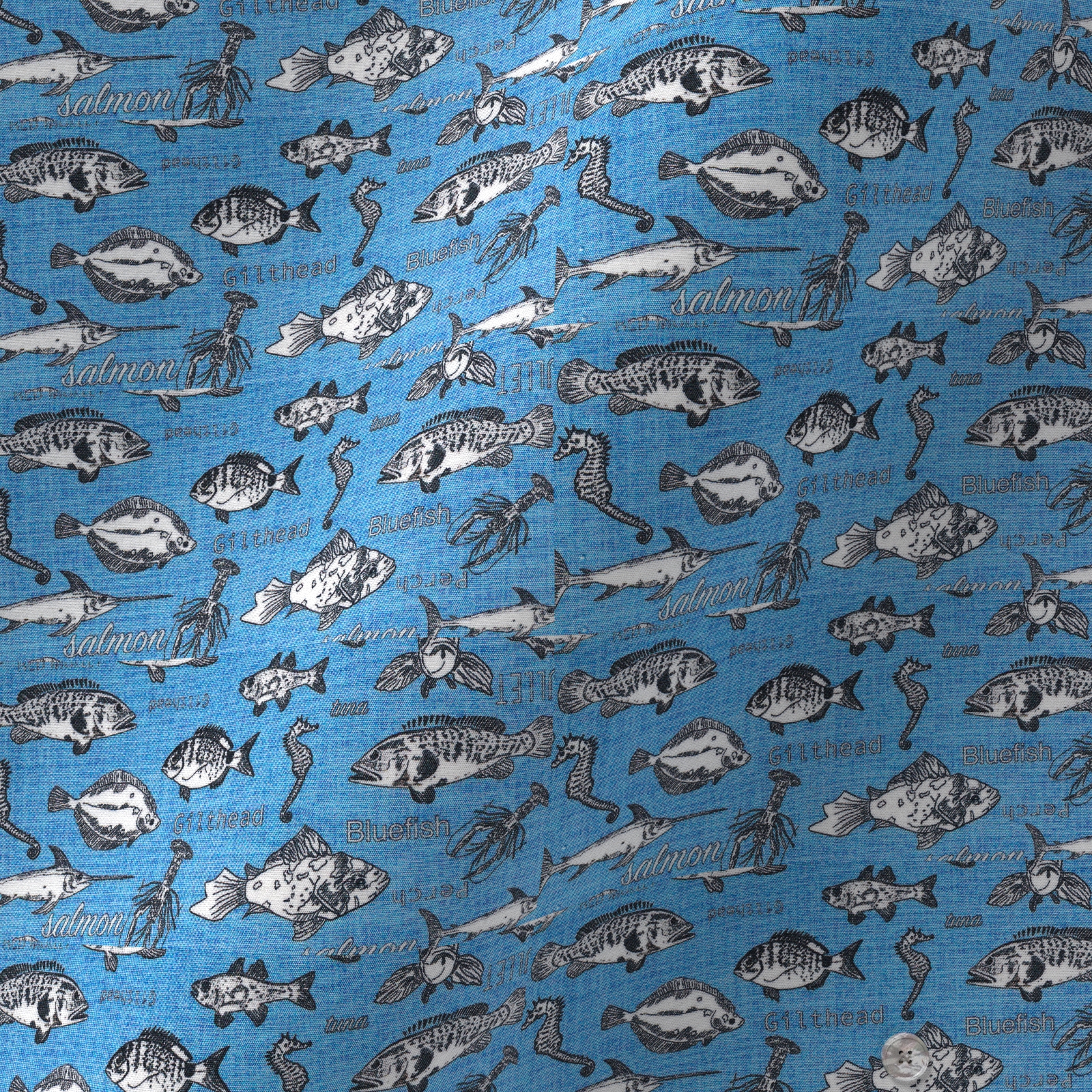 イタリアのTEXTA(テクスタ)社のブルーベースに魚が名前とともにプリントされた生地です。