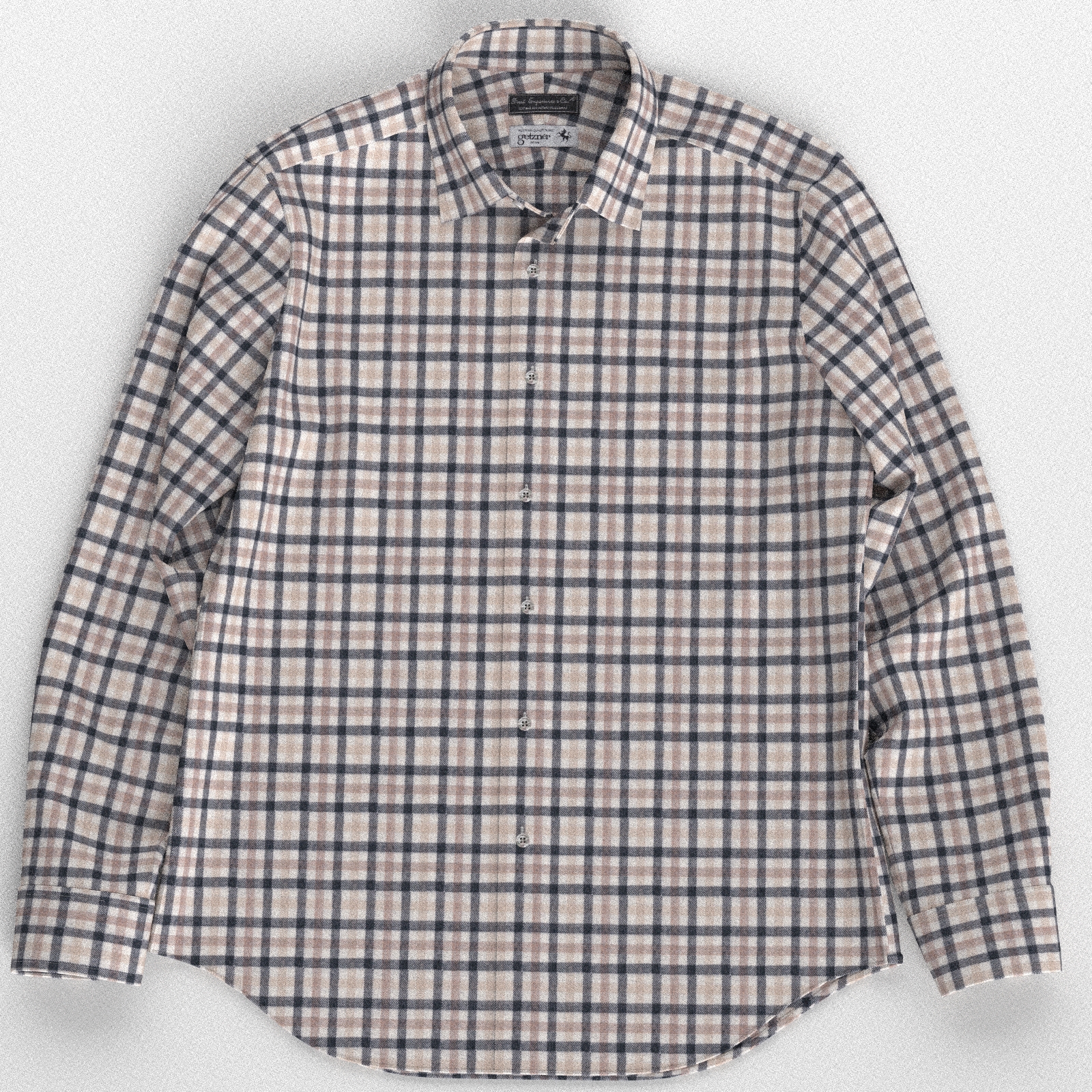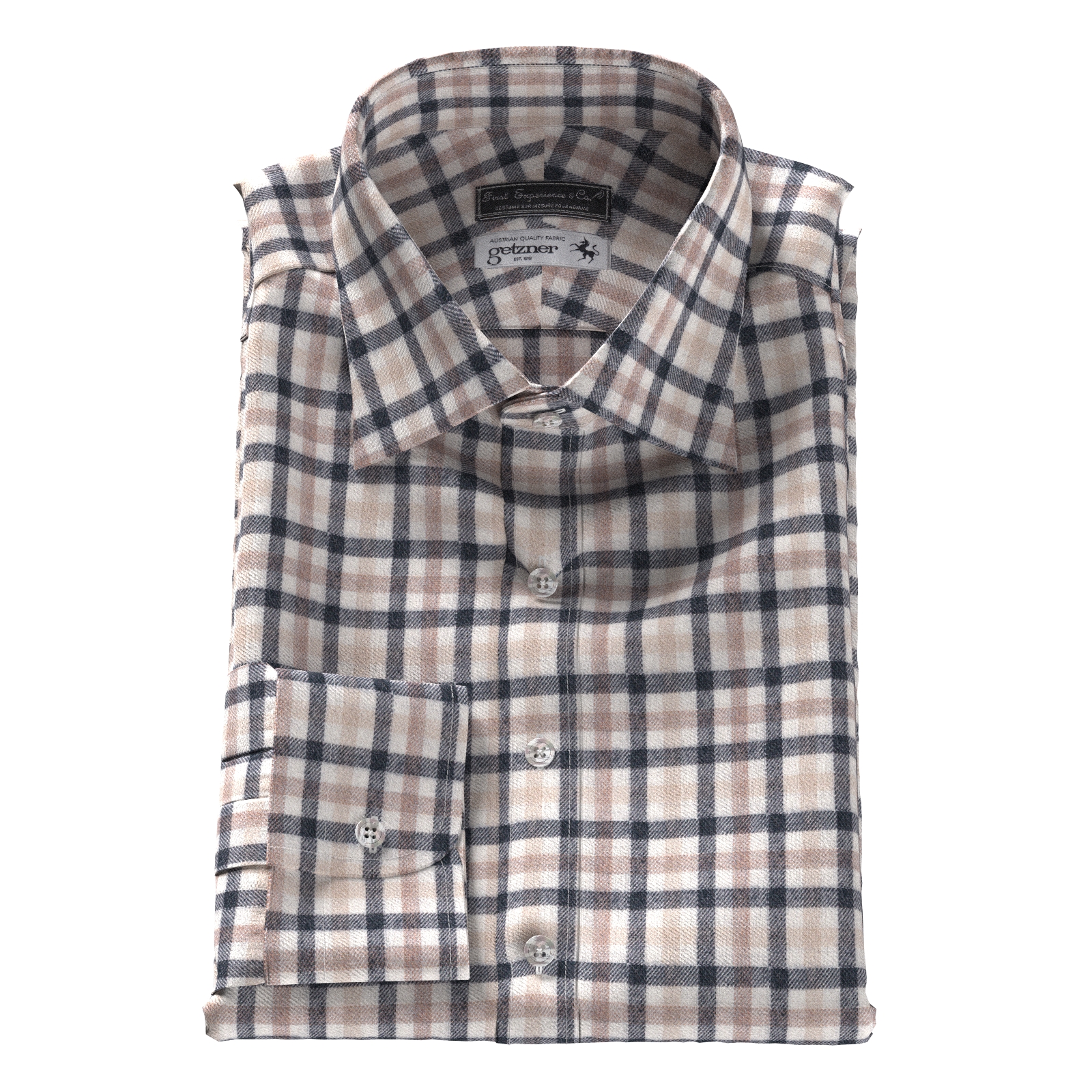 オーストリアの有名生地ブランドGetznerのウール混フランネルのベージュベースにベージュ×ブラックの格子柄の生地となります。